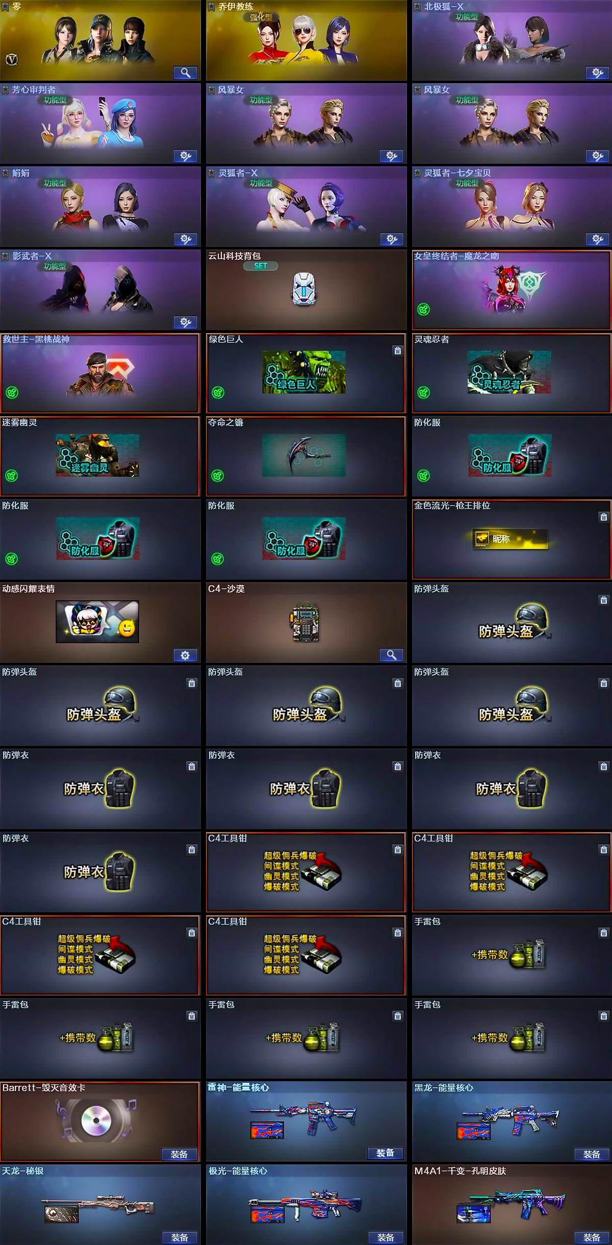 【道具】:云山科技背包,女皇终结者-魔龙之吻,救世主-黑桃战神,绿色巨人,灵魂忍者,迷雾幽灵,夺命之镰,防化服*3,金色流光-枪王排位,动感闪耀表情,C4-沙漠,防弹头盔*4,防弹衣*4,C4工具钳*4,手雷包*4