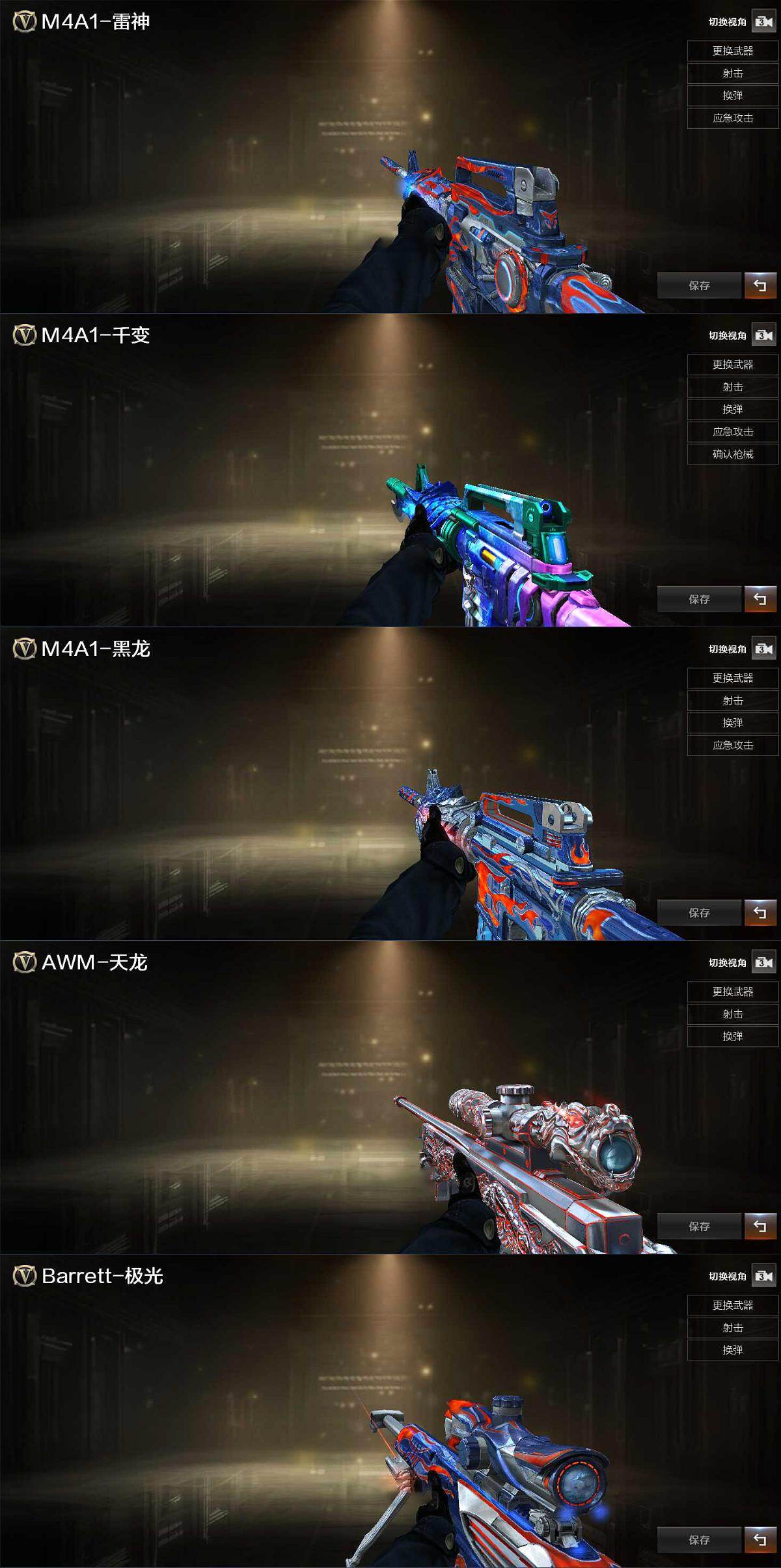 【皮肤】:雷神-能量核心,M4A1-千变-孔明皮肤,黑龙-能量核心,天龙-秘银,极光-能量核心