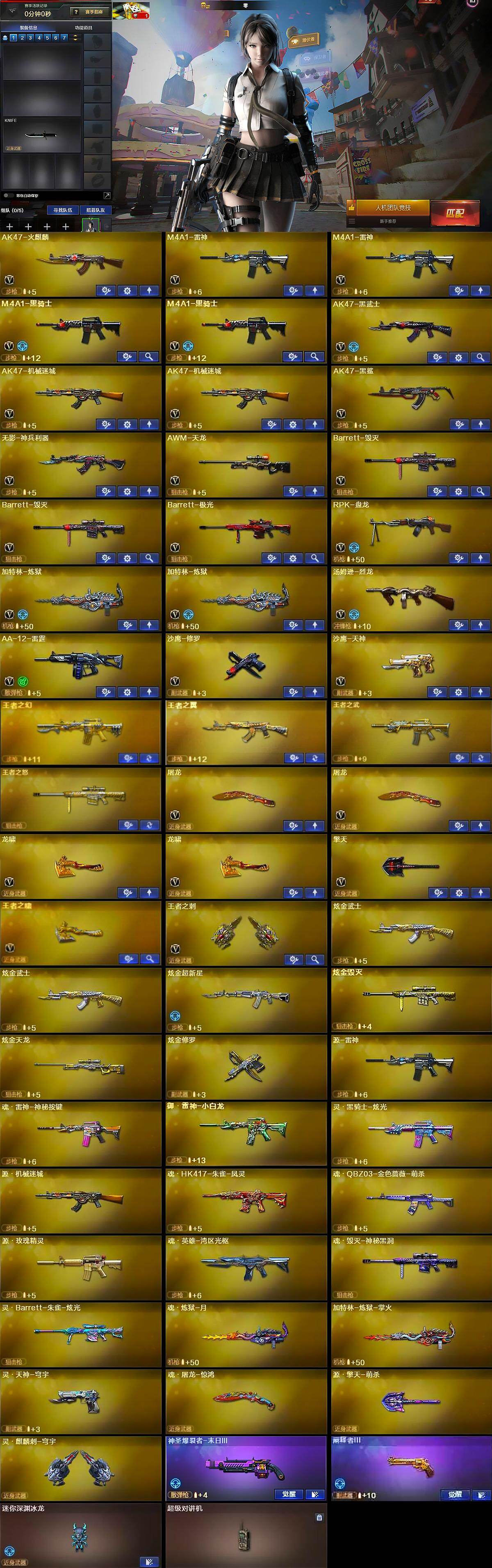 【英雄级武器】:AK47-火麒麟,M4A1-雷神*2,M4A1-黑骑士*2,AK47-黑武士,AK47-机械迷城*2,AK47-黑鲨,无影-神兵利器,AWM-天龙,Barrett-毁灭*2,Barrett-极光,RPK-盘龙,加特林-炼狱*2,汤姆逊-烈龙,AA-12-雷霆,沙鹰-修罗,沙鹰-天神,屠龙*2,龙啸*2,擎天,王者之啸-觉醒版,王者之刺-觉醒版