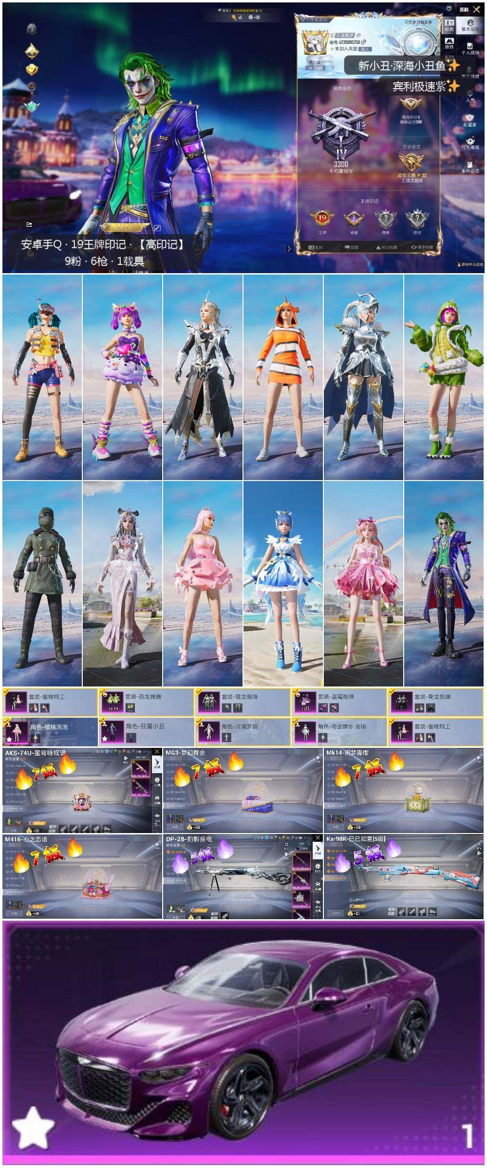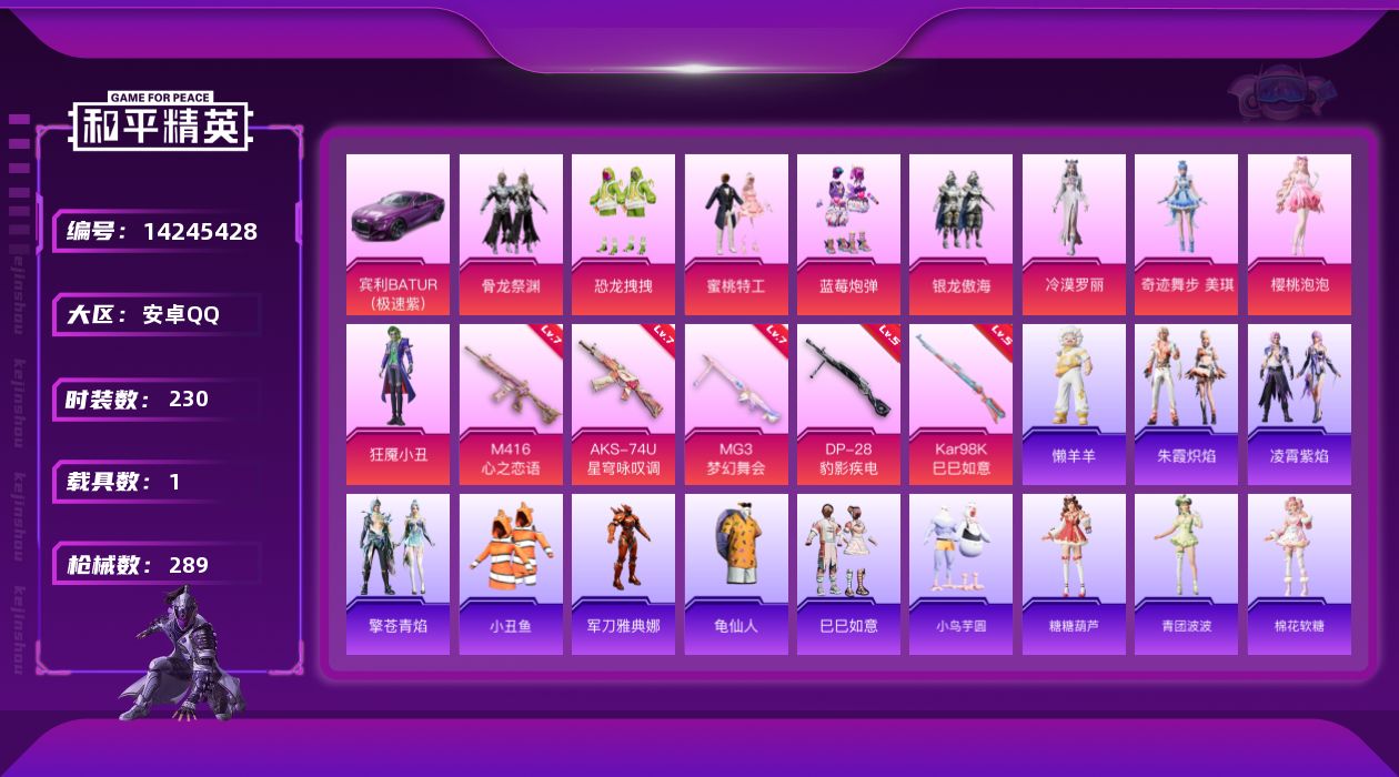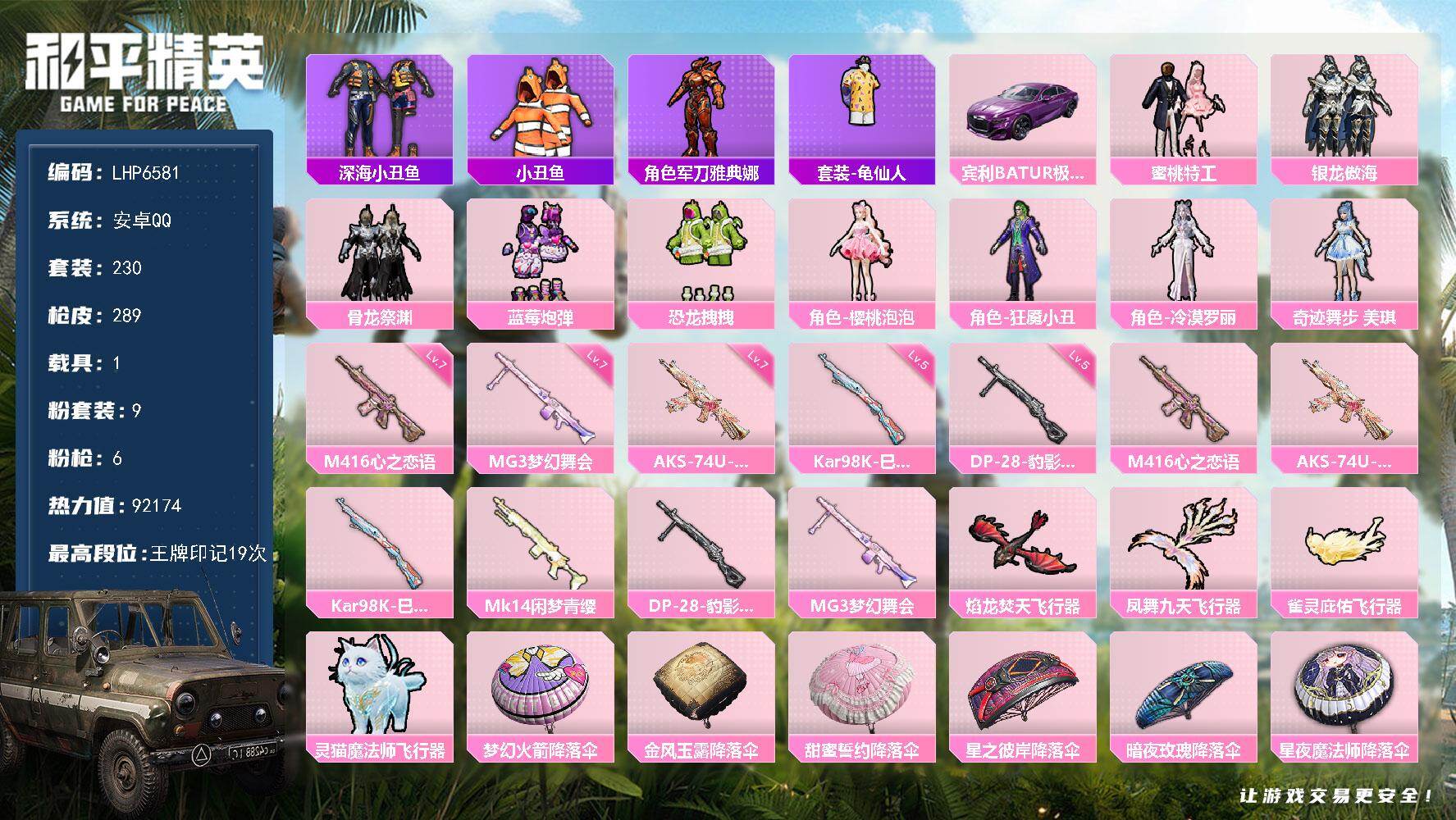[14245428]可二次【店主推荐捡漏号!可直接换绑】/素材身法号 安卓 手Q-9粉装-6特效枪-1载具-5粉色飞行器-9.2w热力值-19王牌印记-230套装-289枪皮【热门品类】:套装-深海小丑鱼,套装-小丑鱼,角色-军刀雅典娜,套装-龟仙人【粉色载具】:宾利BATUR(极速紫)【粉色套装】:粉装-蜜桃特工,粉装-银龙傲海,粉装-骨龙祭渊,粉装-蓝莓炮弹,粉装-恐龙拽拽,角色-樱桃泡泡,角色-狂魇小丑,角色-冷漠罗丽,角色-奇迹舞步 美琪【粉色枪皮等级】:M416-心之恋语(七级),AKS-74U-星穹咏叹调(七级),Kar98K-巳巳如意(五级),DP-28-豹影疾电(五级),MG3-梦幻舞会(七级)【粉色飞行器】:焰龙焚天飞行器,凤舞九天飞行器,雀灵庇佑飞行器,灵猫魔法师飞行器