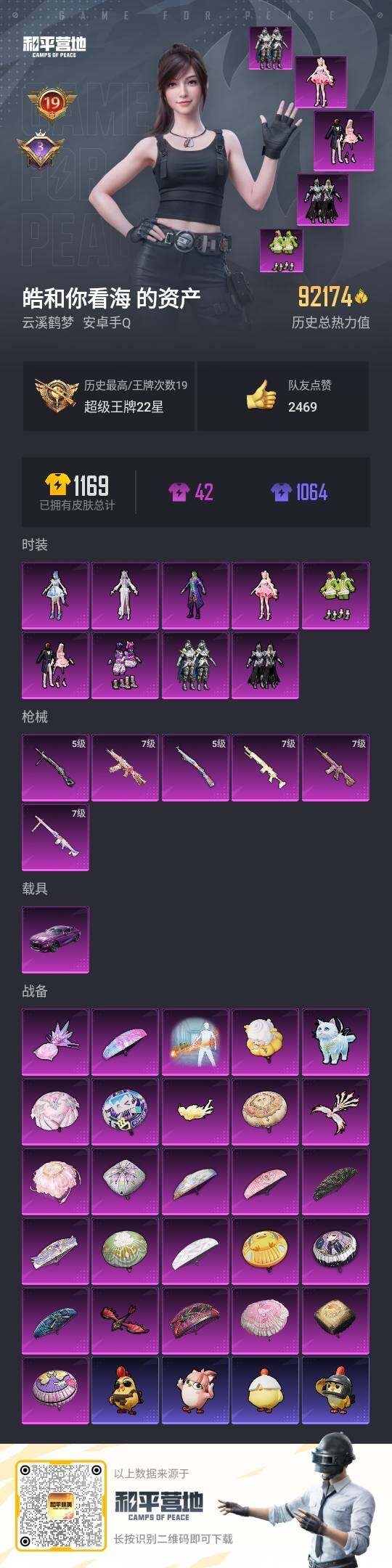 - PX_2101046-??/枪械5/装备253/载具1/战备172/王牌印记12/热力值70766/四级AKM-炫紫旋律/七级M416-心之恋语/五级UMP45-量子极限/五级AKS-74U-星穹咏叹调/五级Kar98K-巳巳如意/仰望U9(赤霞丹朱)/快乐主宰/智能音符/新星烈龙/角色-金域紫灵/角色-风幻水境/角色-千金淑猫/角色-凤凰座 一辉/粉装-星穹咏叹调/粉装-幻彩电音/套装-龟仙人/
