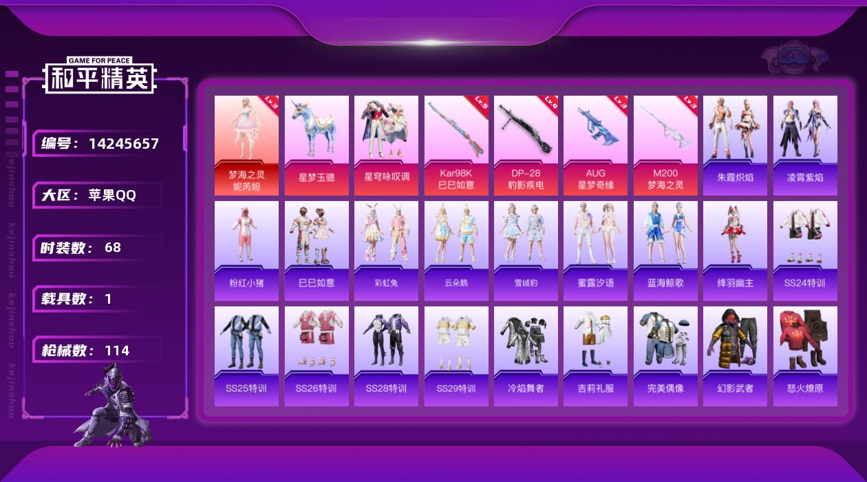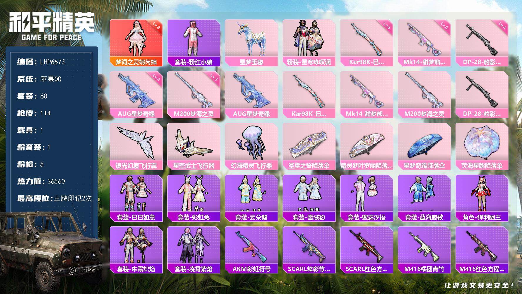 [14245657]【店主推荐捡漏号!可直接换绑】/素材身法号 苹果 手Q-1神装-1粉装-5特效枪-1载具-3粉色飞行器-3.6w热力值-2王牌印记-68套装-114枪皮【红色神装等级】:梦海之灵-妮芮妲(三级)【热门品类】:套装-粉红小猪【粉色载具】:星梦玉骢【粉色套装】:粉装-星穹咏叹调【粉色枪皮等级】:AUG-星梦奇缘(三级),Kar98K-巳巳如意(五级),Mk14-甜梦熊击(五级),M200-梦海之灵(三级),DP-28-豹影疾电(四级)【粉色飞行器】:镜光幻境飞行翼,星空武士飞行器,幻海精灵飞行器