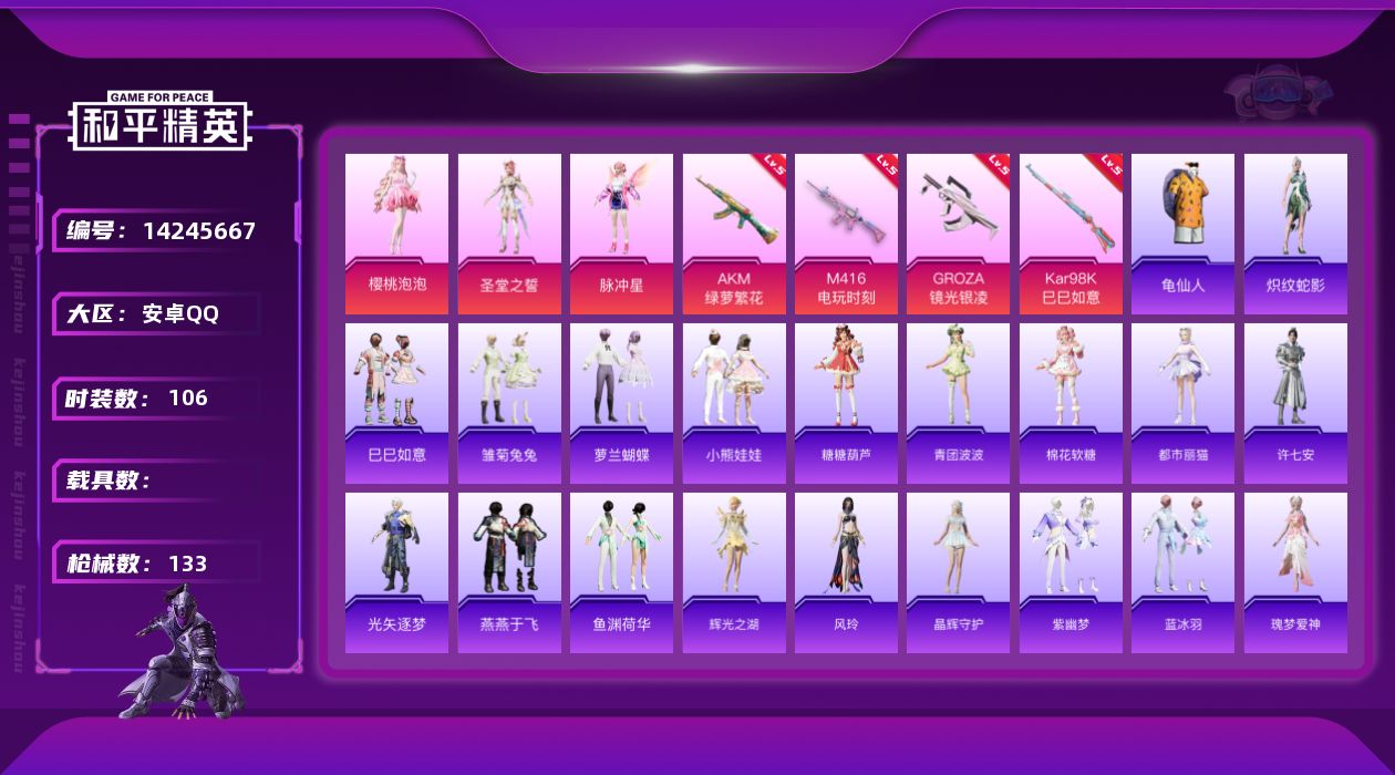 [14245667]【店主推荐捡漏号!可直接换绑】 安卓 手Q-3粉装-4特效枪-1粉色飞行器-4w热力值-5王牌印记-106套装-133枪皮【热门品类】:套装-深海小丑鱼,套装-龟仙人【粉色套装】:角色-圣堂之誓,角色-脉冲星,角色-樱桃泡泡【粉色枪皮等级】:AKM-绿萝繁花(五级),M416-电玩时刻(五级),GROZA-镜光银凌(五级),Kar98K-巳巳如意(五级)