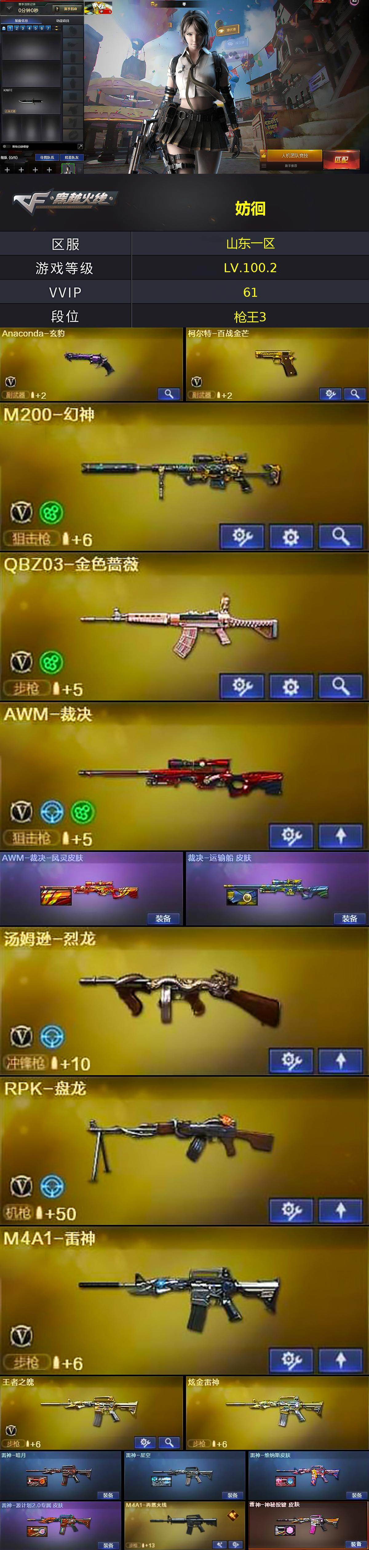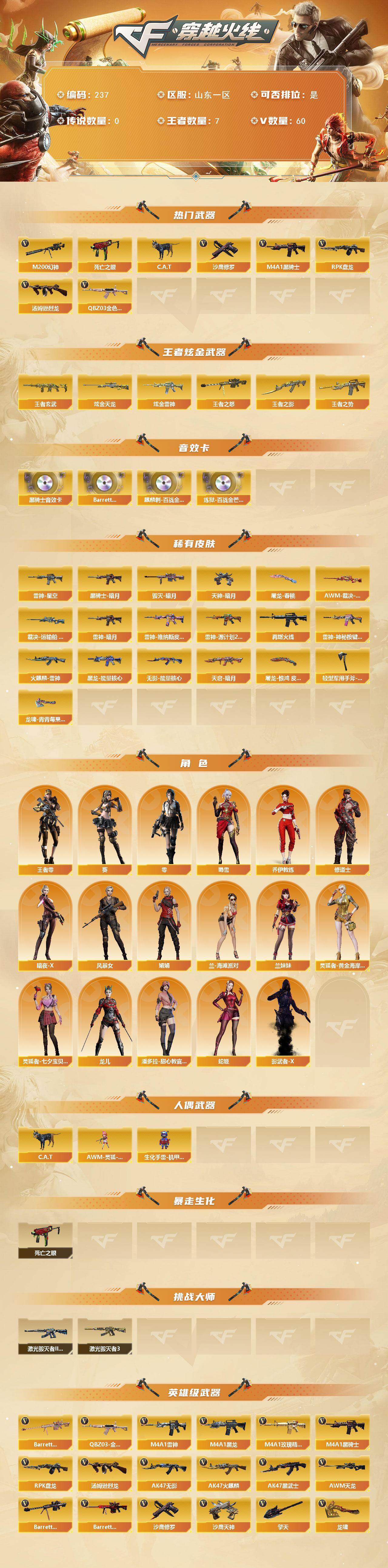[14245758]山东一区-60V-7王者-2炫金 【热门武器】:QBZ03-金色蔷薇,M200-幻神,死亡之眼,C.A.T,M4A1-黑骑士,汤姆逊-烈龙,RPK-盘龙,沙鹰-修罗*6 【王者炫金武器】:王者之势,王者之影,王者玄武,王者之怒,炫金雷神,炫金天龙 【音效卡】:M4A1-黑骑士音效卡,Barrett-碧霄极光音效卡,麒麟刺-百战金芒-盛典舞曲音效卡,炼狱-百战金芒-庆典舞曲音效卡 【皮肤】:AWM-裁决-凤灵皮肤,裁决-运输船 皮肤,雷神-暗月,雷神-星空,雷神-维纳斯皮肤,雷神-源计划2.0专属 皮肤,M4A1-再燃火线,雷神-神秘按键 皮肤,火麒麟-雷神,毁灭-暗月*3,黑龙-能量核心,黑骑士-暗月*2,无影-能量核心,天启-暗月,天神-暗月,屠龙-春桃 皮肤,屠龙-惊鸿 皮肤,轻型军用手斧-再燃火线,龙啸-青青莓果 皮肤 【角色】:零,葵,王者-零,乔伊教练,修道士,暗夜-X,风暴女,娟娟,兰-海滩派对,兰妹妹,灵狐者-黄金海岸,灵狐者-七夕宝贝,龙儿,潘多拉-甜心教官,蛇姬,蜀雪,影武者-X 【人偶武器】:AWM-灵狐-15周年嘉年华*2,C.A.T,生化手雷-机甲核心 【暴走生化】:死亡之眼 【挑战大师】:激光毁灭者III-白马银枪,激光毁灭者III 【英雄级武器】:M4A1-千变,AK47-火麒麟*2,M4A1-黑龙,M4A1-雷神,M4A1-黑骑士,AK47-无影*2,AK47-黑武士,M4A1-武圣,AK47-黑鲨,QBZ03-独角-III,M4A1-玫瑰精灵,QBZ03-金色蔷薇,王者之魄-觉醒版,AWM-天龙,Barrett-毁灭*2,Barrett-极光,AWM-裁决,M200-幻神,Barrett-金色蔷薇,RPK-盘龙,炼狱-百战金芒,汤姆逊-烈龙,沙鹰-修罗*6,沙鹰-天神,Anaconda-玄豹,柯尔特-百战金芒,Glock18-武圣,屠龙*4,龙啸,擎天,麒麟刺*2,麒麟刺-百战金芒,高爆手雷-雷霆,闪光弹-雷霆,闪光弹-玄豹,烟雾弹-雷霆,烟雾弹-玄豹,M4A1-苍鸣雷神,Barrett-碧霄极光*2 【道具】:BS战队炫彩背包,云山科技背包,女皇终结者-背包,战舰背包,炫彩背包,百战金芒炫彩背包,超级背包*2,迷你冰龙背包,女皇终结者-魔龙之吻,绿色巨人,灵魂忍者,妖姬,迷雾幽灵,夺命之镰,防化服*3,流光-鎏金之域,枪王排位29