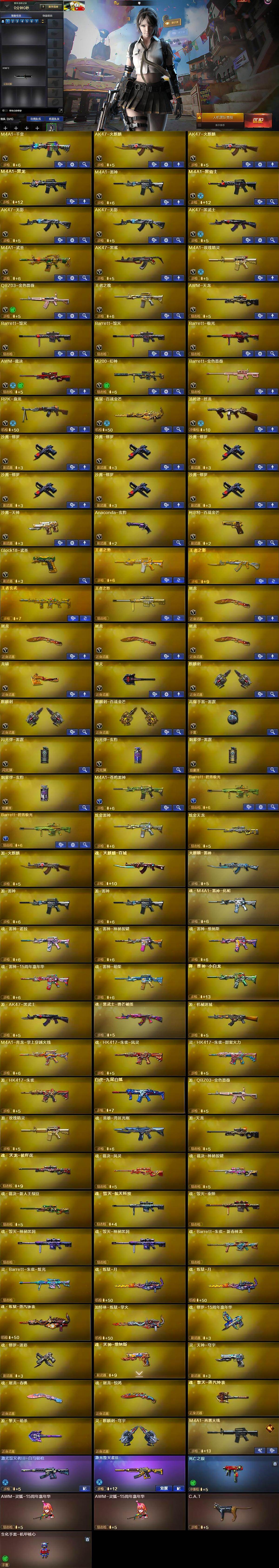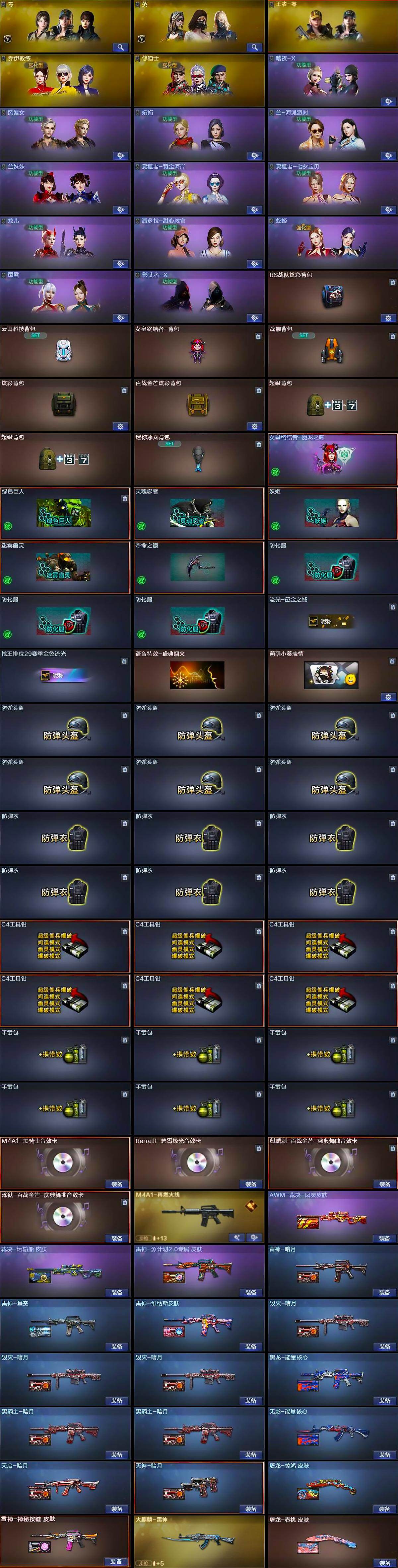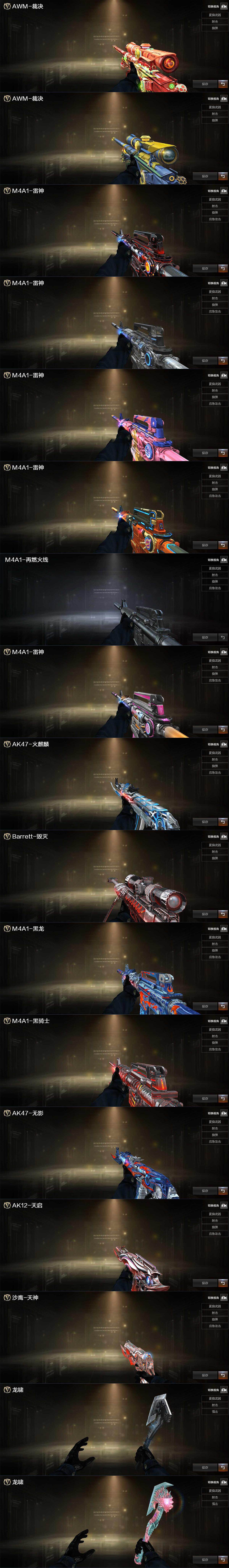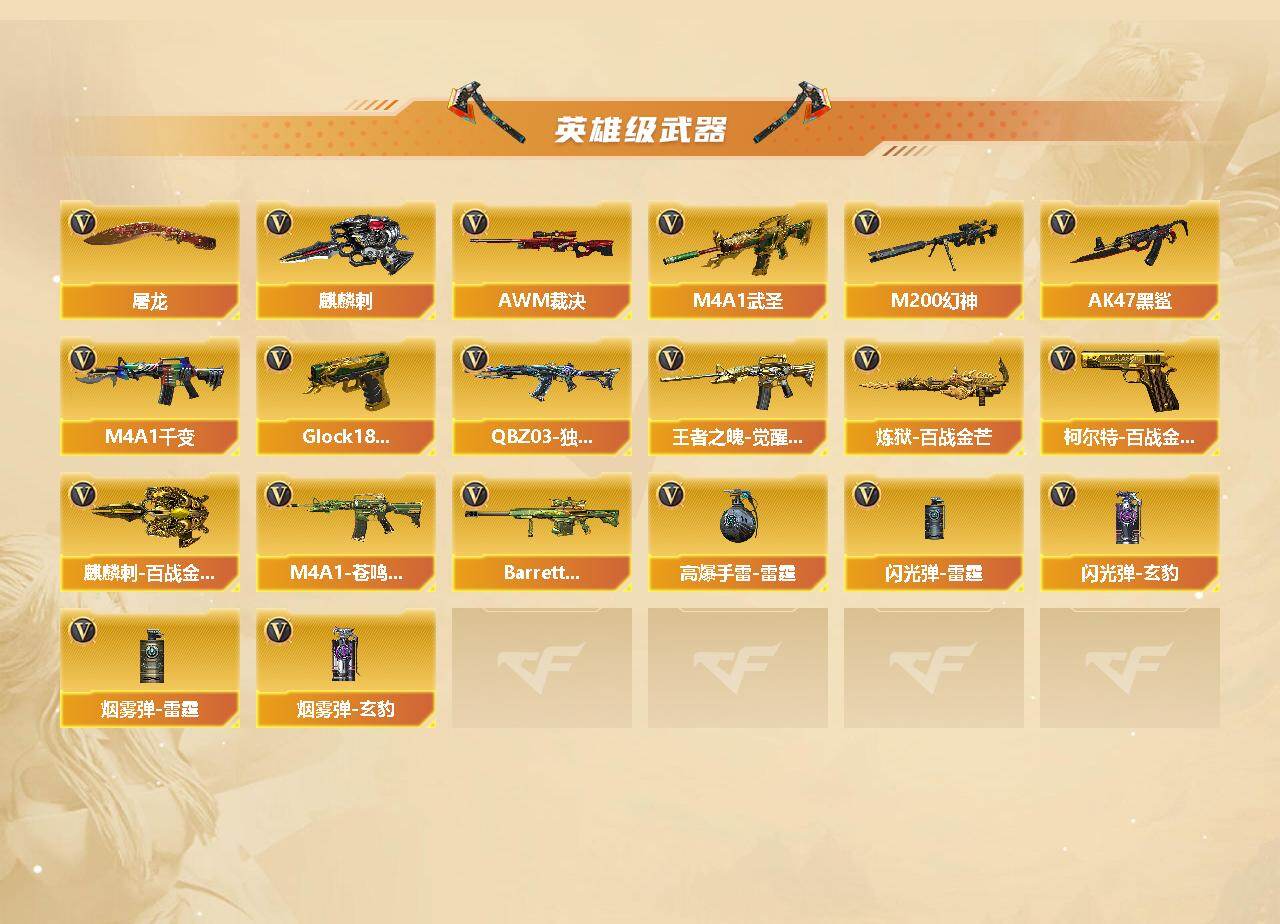 【英雄级武器】:M4A1-千变,AK47-火麒麟*2,M4A1-黑龙,M4A1-雷神,M4A1-黑骑士,AK47-无影*2,AK47-黑武士,M4A1-武圣,AK47-黑鲨,QBZ03-独角-III,M4A1-玫瑰精灵,QBZ03-金色蔷薇,王者之魄-觉醒版,AWM-天龙,Barrett-毁灭*2,Barrett-极光,AWM-裁决,M200-幻神,Barrett-金色蔷薇,RPK-盘龙,炼狱-百战金芒,汤姆逊-烈龙,沙鹰-修罗*6,沙鹰-天神,Anaconda-玄豹,柯尔特-百战金芒,Glock18-武圣,屠龙*4,龙啸,擎天,麒麟刺*2,麒麟刺-百战金芒,高爆手雷-雷霆,闪光弹-雷霆,闪光弹-玄豹,烟雾弹-雷霆,烟雾弹-玄豹,M4A1-苍鸣雷神,Barrett-碧霄极光*2