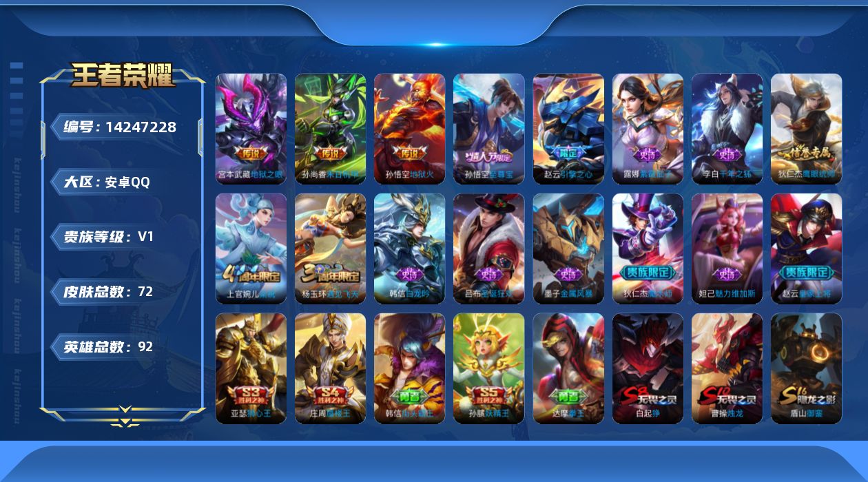 - [11578689]V10 5典藏 3无双 61传说 126英雄 510皮肤 典藏英雄武则天 可修改实名 优质装备:天鹅之梦(小乔典藏),星空梦想(太空人),倪克斯神谕(宇宙婆娘),星域神启(倪克斯贼亮),幻阙歌(貂蝉典藏),神器·明辉仪,碎月剑心(李白无双),小乔时之魔女(小乔无双),黄金狮子座,黄金射手座,冠军飞将,云鹰飞将(小将军),绛天战甲(鸡嘴战神),黄金白羊座,猫影幻舞,久胜战神,炽阳神光,一念神魔,云霓雀翎,末日机甲-孙尚香(绿蚂蚱),地狱火,仲夏夜之梦(大飞蛾),零号·赤焰,海洋之心,地狱之眼,飞鸢探春,胖达荣荣,乞巧织情,时之恋人-刘备(电焊工),游龙清影(小青龙),淬星耀世,超时空战士-狄仁杰,末日机甲-孙策,无双飞将,神器·狴犴令,神器·明辉仪,山海·炽霜斩(李信年限),山海·琳琅生(小乔年限),山海·苍雷引(电光曜子),燃星之曲,记忆之芯(机甲兔),灼幽烈阳,鲁班七号-时之奇旅,永恒水手月亮,夜礼服假面,霜月吟,澜逐花归海,艾琳觅芳踪,琥珀纪元铠,琥珀纪元马超,涂山容容 传说皮:乘龙·问璇玑(孙尚香年限),乘龙·铭钟鼎(赵云年限),乘龙·淬吴钩(孙策年限),貂蝉曦玄引,吕布曦玄引,落雪白狼 珍宝阁皮:妄想食味,优雅恋人,女武神 限定皮:逐霄战戟,鸣野蒿,至尊宝,白虎志(电光耗子),凤求凰(白切鸡),凤凰于飞,太华(伽罗年限),武陵仙君(小桃花),傲雪梅枪,寅虎·展翼(孙膑年限),时之彼端,魔法小厨娘,白晶晶,时雨天司(水龙头),神威(电光马子),飞衡(韩信年限),玄嵩(庄周年限),山海·碧波行(瑶年限),无限倾心-项羽,至美·乘鲤谣,遇见飞天,无限倾心-虞姬,齐天大圣,匿光决锋者,五谷丰年,青龙志(铠年限),冰锋战神,幽恒(沐浴露),天狼运算者,游园惊梦,梁祝,天狼狩猎者,逐梦之星,烈魂,岱宗(典韦年限),天狼溯光者,天狼征服者,奔雷神使(牛魔年限),天狼绘梦者,李小龙,朱雀志(守约年限),永曜之星,辉光之辰,如梦令-嫦娥,如梦令-后羿,霸王别姬-虞姬,奇迹圣诞,默契交锋-兰陵王,默契交锋-花木兰,孙行者,猪悟能,一生所爱,大圣娶亲,冰霜恋舞曲,云端筑梦师,乒乒小将,蜜橘之夏,热情桑巴,美猴王,匿光追影者,女儿国国王,寅虎·御盾(廉颇年限),寅虎·瑞焰(虎皮蛋子),寅虎·心曲(虎婆),寅虎·赤拳(老虎年限),玉兔公主,唐三藏,匿光启智者,时之奇旅-妲己,神器