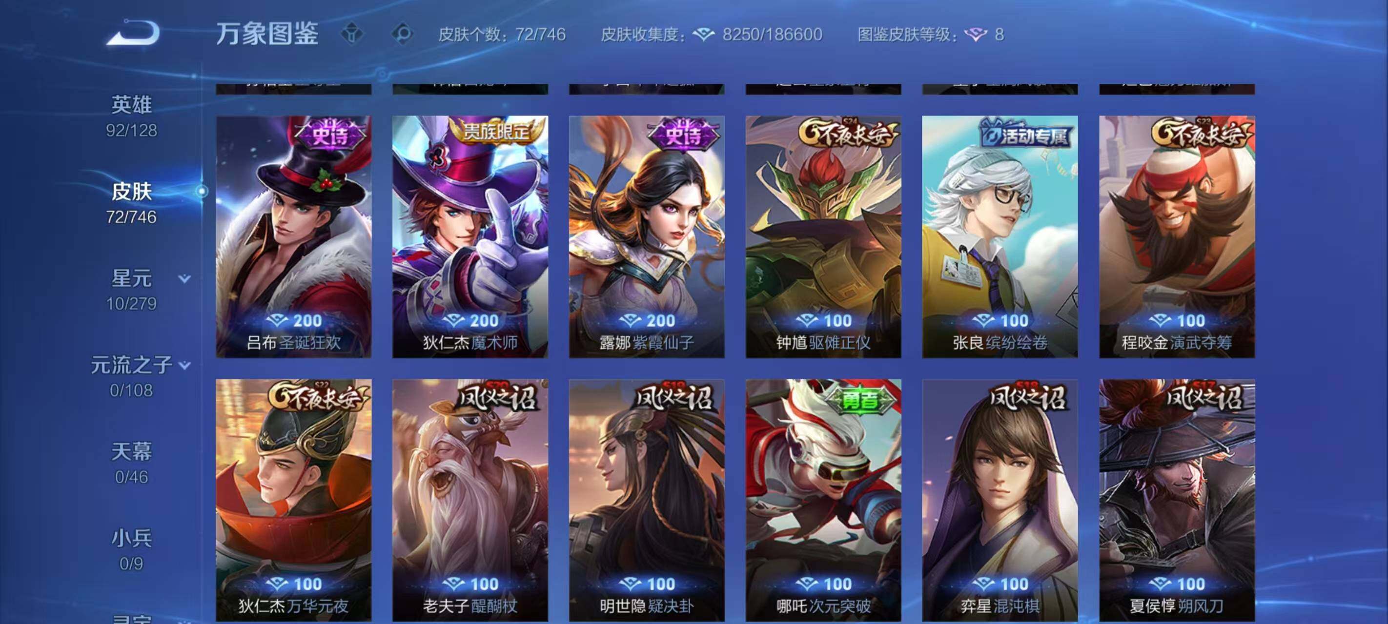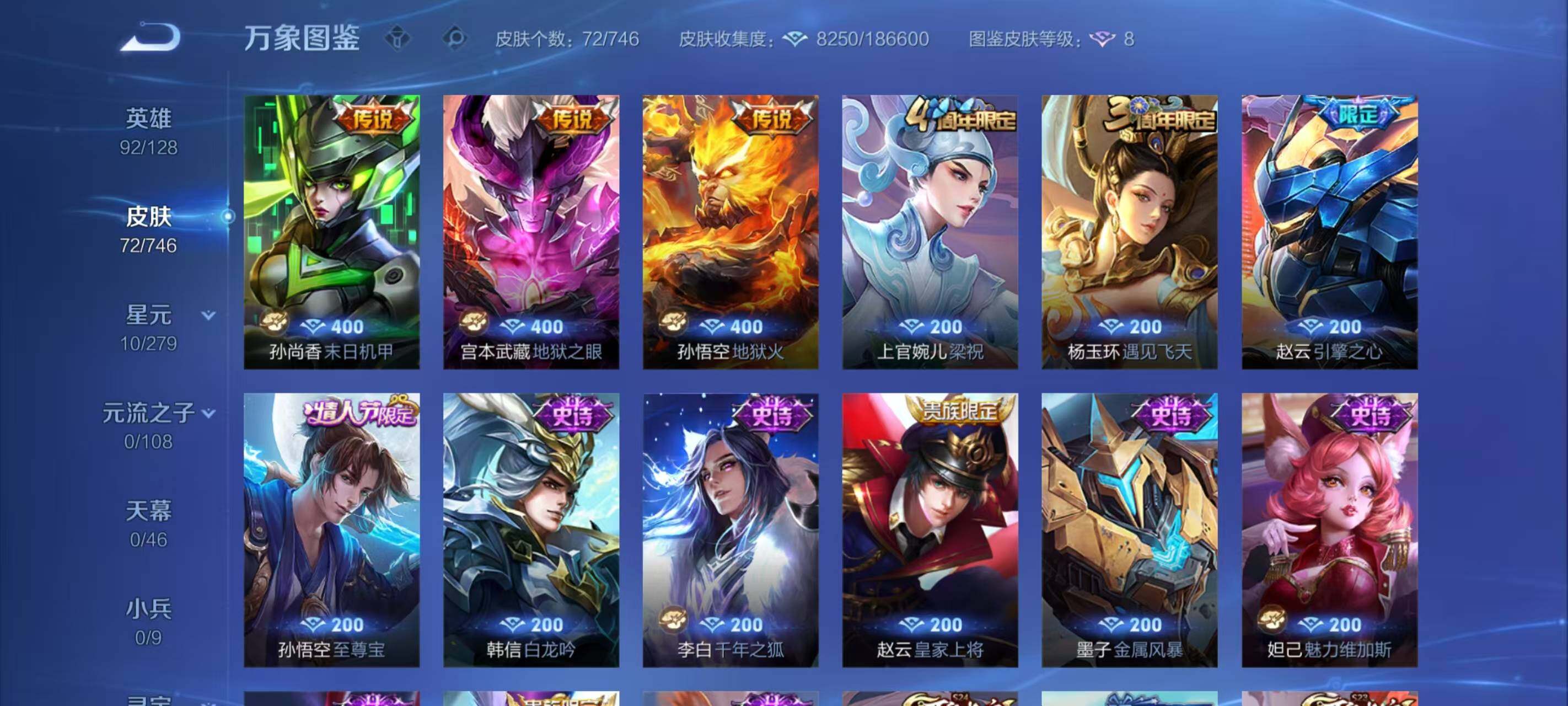 【史诗皮肤】:露娜紫霞仙子,赵云皇家上将,狄仁杰魔术师,妲己魅力维加斯,墨子金属风暴,吕布圣诞狂欢,李白千年之狐,韩信白龙吟,孙悟空至尊宝,赵云引擎之心,杨玉环遇见飞天,狄仁杰鹰眼统帅,上官婉儿梁祝