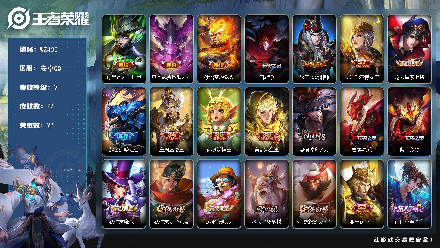 - [11603752]V9 3典藏 1珍品传说 15传说 125英雄 358皮肤 有退款 不能充值 典藏英雄武则天 可修改实名 优质装备:无限飓风号(高达),星域神启(倪克斯贼亮),幻阙歌(貂蝉典藏),江户川柯南,黄金狮子座,炽阳神光,末日机甲-孙尚香(绿蚂蚱),地狱之眼,淬星耀世,碎云,山海·琳琅生(小乔年限) 传说皮:云诺千山 珍宝阁皮:妄想食味,蔷薇恋人 限定皮:逐霄战戟,鸣野蒿,至尊宝,凤求凰(白切鸡),影龙天霄,遇见飞天,高山流水,齐天大圣,降魔,冰锋战神,游园惊梦,梁祝,逐梦之音,李小龙,逐梦之影,辉光之辰,霸王别姬-虞姬,默契交锋-兰陵王,启示之音,山海·玄木吟(马可年限) 史诗皮:苍鳞隐世,龙之律动,雪豹·霜爪,茶境仙,破空之剑,蔬乡物语(鲁班七号),乘龙·聚宝船(安琪拉年限),百相守梦-百里守约,紫霞仙子,苍穹之光,电玩小子(小书包),白龙吟,黄金分割率,特工魅影,千年之狐,永昼,江河有灵,魅语,百解令(蒙犽),高渐离燃音魔法,冰冠公主,青蛇,偶像歌手,电玩·爆裂旋风,暗夜猫娘,龙骑士(小龙虾),末日机甲-吕布,猫狗日记-孙策,猫狗日记-大乔,乱世虎臣,节奏热浪,修罗,女仆咖啡,摇滚巨星,水果甜心,绅士熊喵,天才门将,星夜王子,心灵骇客,时之奇旅-安琪拉,功夫厨神,德古拉伯爵,暗隐猎兽者,幽灵船长,鬼剑武藏,心灵战警,天秀·启明,舞动绿茵,地狱岩魂,诗语江南,纤云弄巧,拒霜思,缤纷独角兽,乘风破浪,逐浪之夏,水晶猎龙者,曙光守护者,箭羽风息,唤灵魅影,金属风暴,原初追逐者,圣诞狂欢,圣诞恋歌,鹰眼统帅,暗夜贵公子,魅力维加斯,赏金猎手,奇遇舞章,未来纪元-赵云1