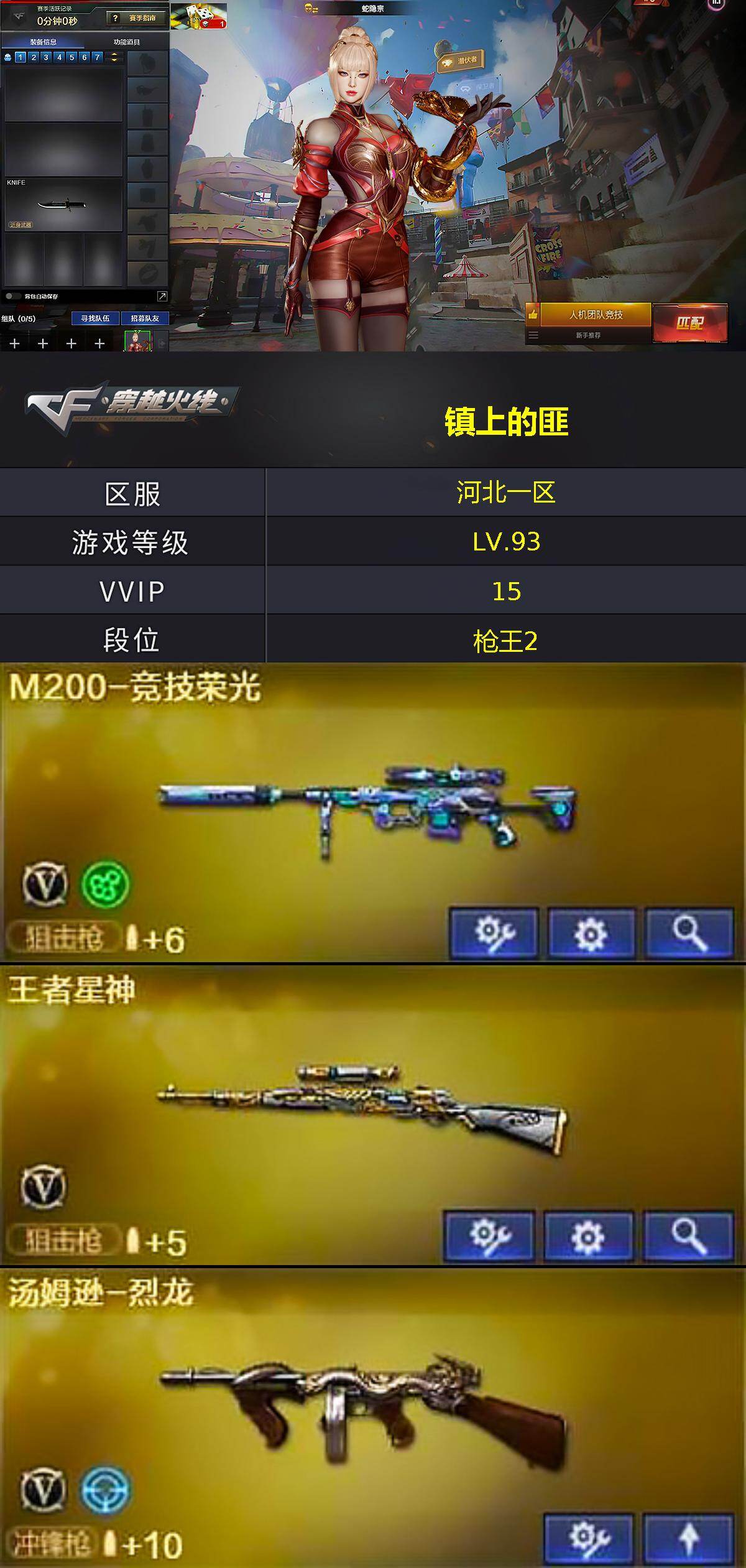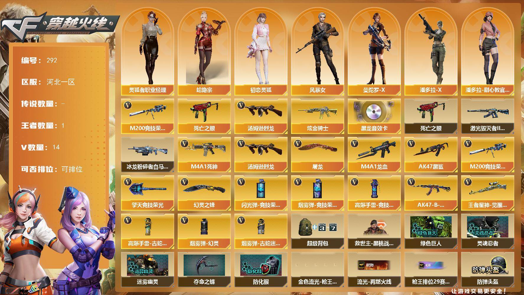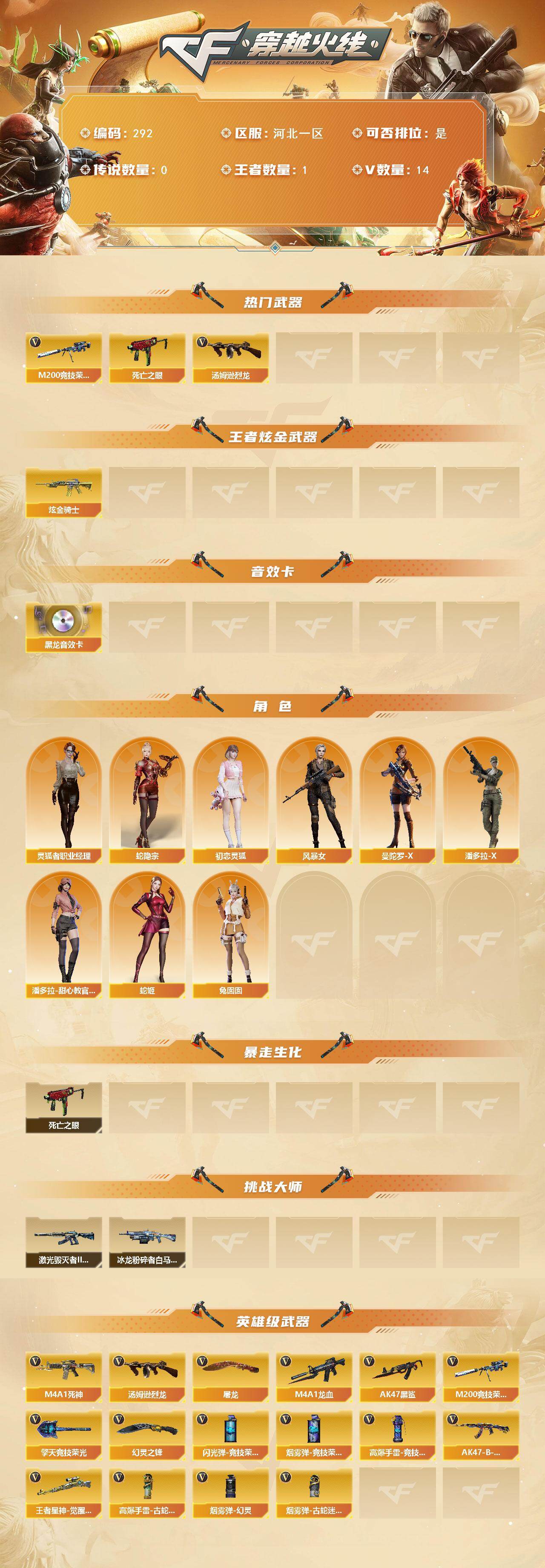 [14251151]河北一区-14V-1王者-1炫金 【热门武器】:M200-竞技荣光,死亡之眼,汤姆逊-烈龙 【王者炫金武器】:炫金骑士 【音效卡】:M4A1-黑龙音效卡 【角色】:蛇隐宗,初恋灵狐,风暴女,灵狐者-职业经理,曼陀罗-X,潘多拉-X,潘多拉-甜心教官,蛇姬,兔囡囡 【暴走生化】:死亡之眼 【挑战大师】:冰龙粉碎者-白马银枪,激光毁灭者III-白马银枪 【英雄级武器】:M4A1-死神,AK47-黑鲨,M4A1-龙血,AK47-B-战神,M200-竞技荣光,王者星神-觉醒版,汤姆逊-烈龙,屠龙,幻灵之锋,擎天-竞技荣光,高爆手雷-竞技荣光,高爆手雷-古蛇迷踪,闪光弹-竞技荣光,烟雾弹-幻灵,烟雾弹-竞技荣光,烟雾弹-古蛇迷踪 【道具】:超级背包,救世主-黑桃战神,绿色巨人,灵魂忍者,迷雾幽灵,夺命之镰,防化服*2,金色流光-枪王排位,星辰流光-枪王排位,流光-再燃火线,枪王排位28赛季金色流光,枪王排位29赛季金色流光,EP战队名片,防弹头盔*2,防弹衣*2,C4工具钳*2,手雷包*3 【特殊枪械】:1烈龙