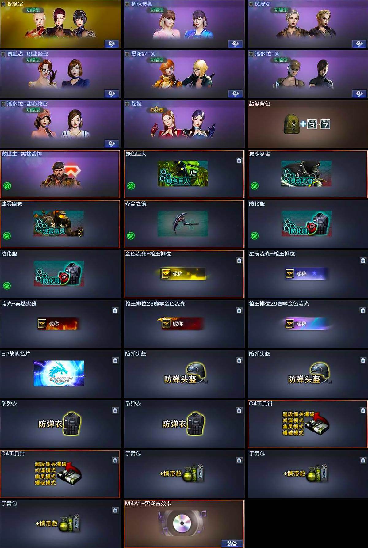【道具】:超级背包,救世主-黑桃战神,绿色巨人,灵魂忍者,迷雾幽灵,夺命之镰,防化服*2,金色流光-枪王排位,星辰流光-枪王排位,流光-再燃火线,枪王排位28赛季金色流光,枪王排位29赛季金色流光,EP战队名片,防弹头盔*2,防弹衣*2,C4工具钳*2,手雷包*3