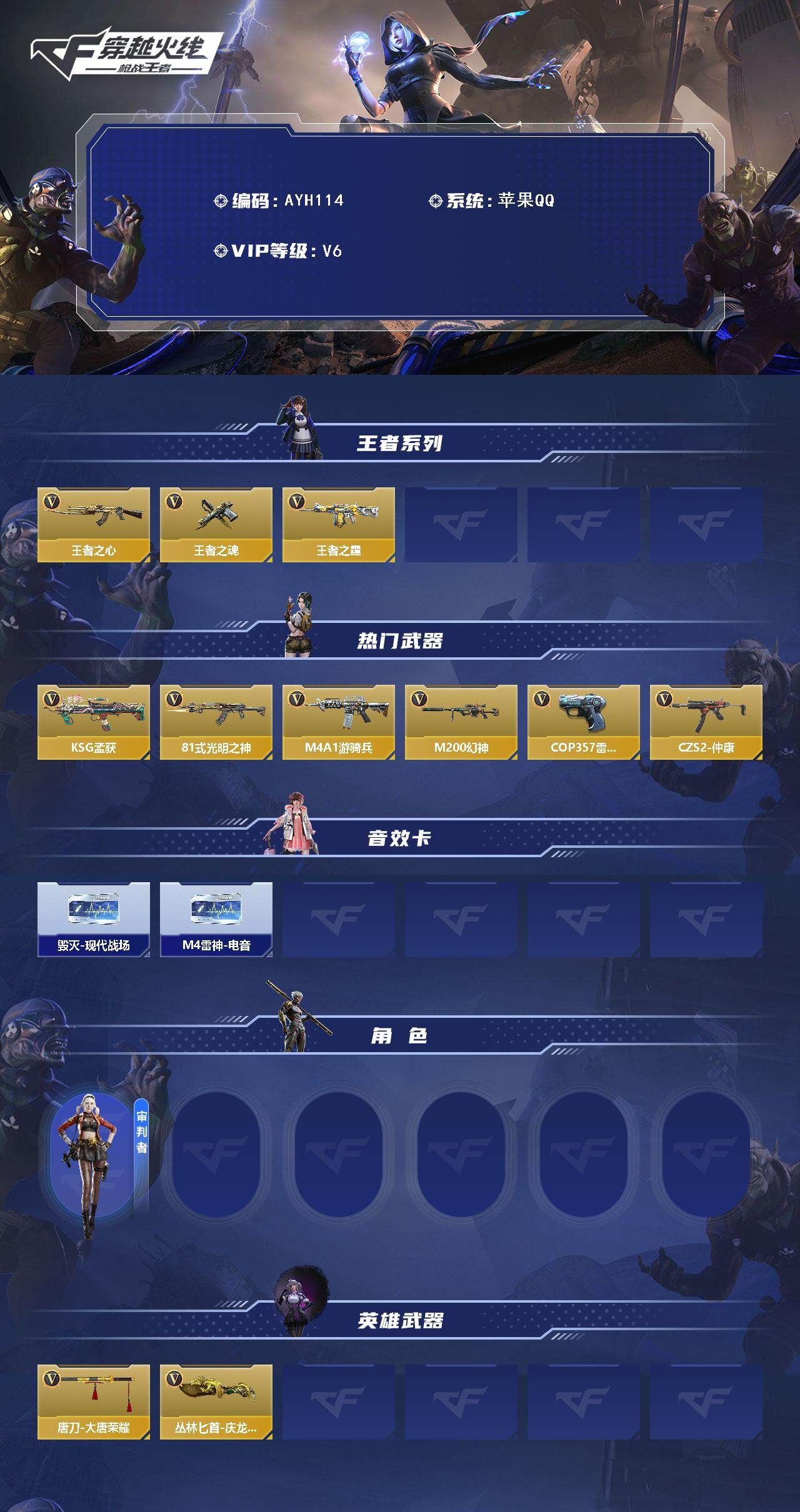 [14252805]1英雄角色数-206英雄武器数 【王者系列】:王者之心,王者之魂,王者之霆,王者新星 【热门武器】:KSG-孟获,81式-光明之神,M4A1-游骑兵,M200-幻神,COP 357-雷霆,CZS2-仲康 【角色】:审判者 【英雄武器】:改装GLOCK-魔杀族,唐刀-大唐荣耀*2,丛林匕首-庆龙觉醒 【音效卡】:巴雷特-毁灭-现代战场,M4A1-雷神-电音