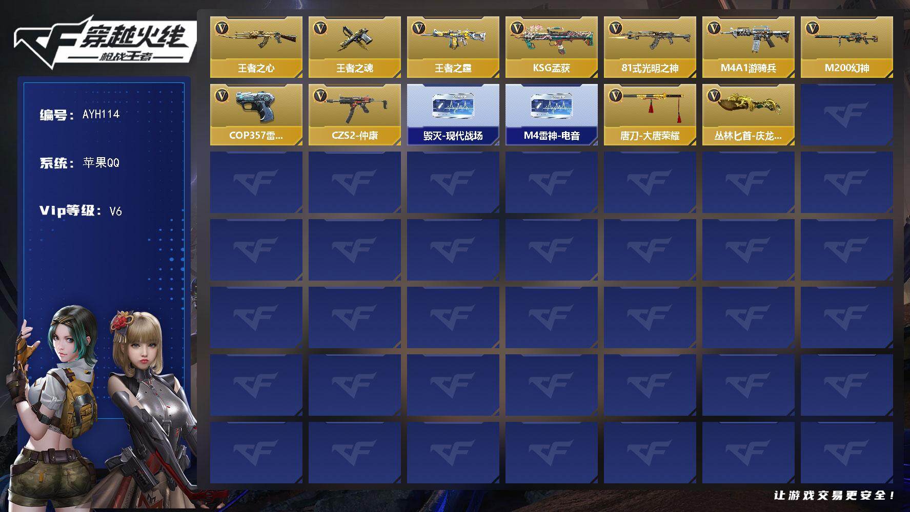 - [12032247]总资产:388.1M 7传说枪械 哈夫币:256K 顶级安全箱(3×3)9.15号到期 可二次 可修改实名 优质装备:顶级安全箱(3x3) 烽火地带段位:钻石 全面战场段位:军士长 传说武器皮肤:M4A1突击步枪-阿米娅,CAR-15突击步枪-阿米娅,复合弓-黑-天际线,AWM狙击步枪-捞点薯条,腾龙突击步枪-捞点薯条,93R-捞点薯条,勇士冲锋枪-能天使-午夜邮差 史诗武器皮肤:Ash-12战斗步枪-飓风行动,AKM突击步枪-林中猎手,M16A4突击步枪-竞赛选手,M1014霰弹枪-林中猎手,SV-98狙击步枪-林中猎手,PTR-32突击步枪-英雄,M250通用机枪-囚徒,SCAR-H战斗步枪-囚徒,Vector冲锋枪-阿萨拉文明,M700狙击步枪-竞技风