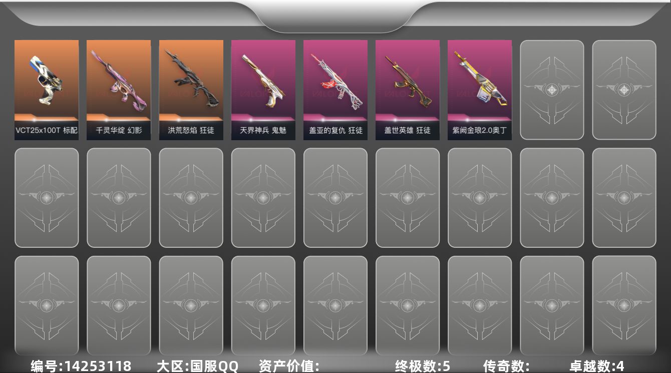 [14253118]【套装】:2025全球冠军赛套装 【英雄】:幻棱,炼狱,暮蝶,壹决,铁臂,捷风,幽影,不死鸟,贤者,猎枭,蝰蛇,芮娜,奇乐,尚勃勒,霓虹,斯凯,K/O,盖可,黑梦 【近战 武器】:近战武器-2025全球冠军赛 蝴蝶刀 【狂徒】:狂徒-2025全球冠军赛,狂徒-洪荒怒焰,狂徒-盖世英雄,狂徒-盖亚的复仇 【幻影】:幻影-千灵华绽 【奥丁】:奥丁-紫阙金琅//2.0 【骇灵】:骇灵-无限竞技 【标配】:标配-超能偶像 【VCT手枪】:标配-VCT25 x 100T 【正义】:正义-超限闪存 【鬼魅】:鬼魅-天界神兵 【卡面】:从黄昏到黎明 卡面,欢迎来到底城 卡面,南瓜盛典 卡面,修车达人 卡面,热舞环节 卡面,正义的化身 卡面,终章:生意人麦宝 卡面,铁之华 卡面,时间到 卡面,最高舞台 卡面,声感陷阱设计图 卡面,Clutch 卡面,梦幻奶茶 卡面,无畏契约GO!第一卷:芮娜 卡面,无畏契约GO!第一卷:零 卡面,逆向独行 卡面 ,代号红色 卡面,新兵报到 卡面,V契约 卡面,无畏契约 卡面 【喷漆】:控场勿近 喷漆,小丑猫 喷漆,熊抱 喷漆,超级粉丝 喷漆,捷风差距 喷漆,惊声尖叫 喷漆,2021冠军巡回赛花火 喷漆,拼一枪 喷漆,买装还是存钱 喷漆,关门放狗 喷漆,无畏契约GO!第一卷:零 喷漆,暴走萝莉 喷漆,胜利属于无畏契约 喷漆,GLHF 喷漆,无畏契约 喷漆 【挂饰】:第九季//第三幕 纪念币 挂饰,工具腰带 挂饰,无畏契约GO!第一卷 芮娜 挂饰,无畏契约GO!第一卷 零 挂饰,熔岩灯 挂饰,第九季//第二幕 纪念币 挂饰,终章:这瓜保熟 挂饰,糖葫芦 挂饰,袖珍捷风 挂饰,迷你浓缩 挂饰,第九季//第一幕 纪念币 挂饰,天外飞客 挂饰,《双城之战》魄罗 挂饰,无畏契约 纪念币 挂饰