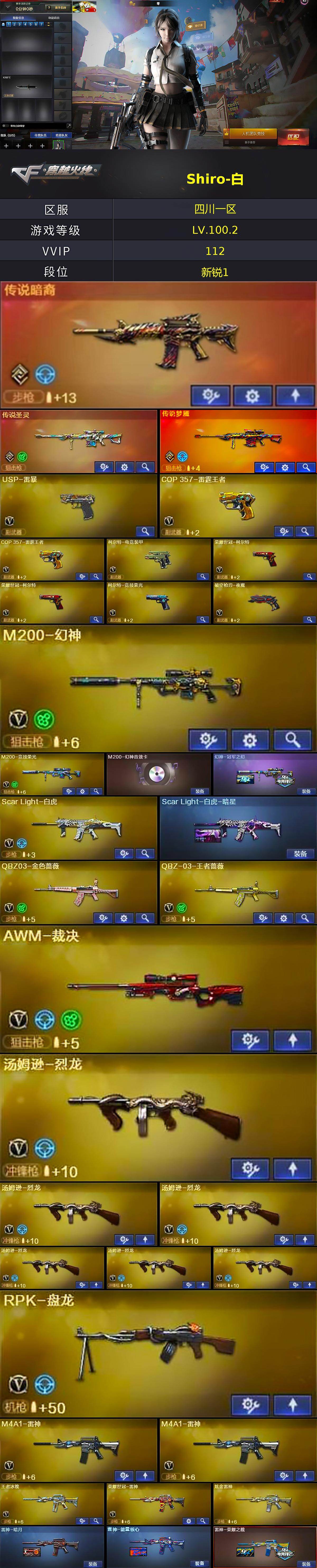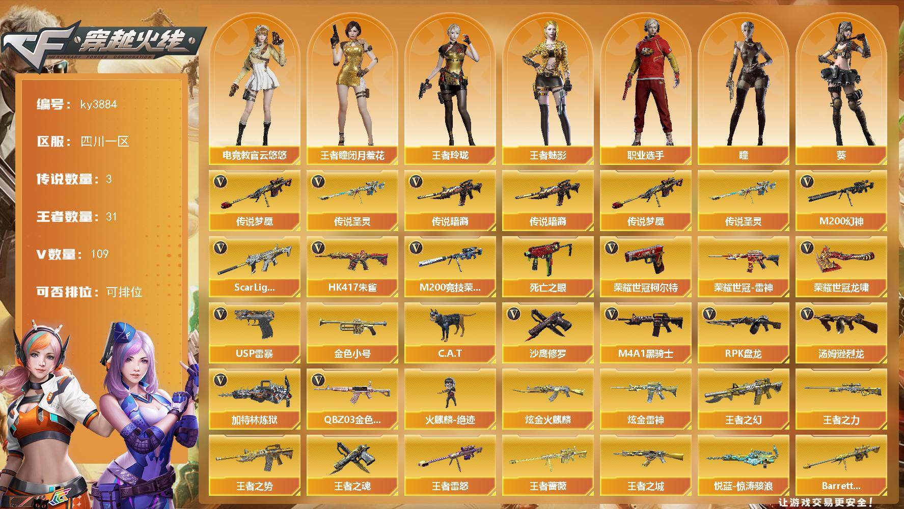 [14257003]四川一区-109V-31王者-2炫金 【传说武器】:传说暗裔,传说圣灵,传说梦魇 【热门武器】:传说暗裔,传说梦魇,传说圣灵,QBZ03-金色蔷薇,Scar Light-白虎,HK417-朱雀,M200-幻神,M200-竞技荣光,死亡之眼*2,荣耀世冠-雷神,荣耀世冠-柯尔特*2,金色小号,C.A.T,M4A1-黑骑士*2,汤姆逊-烈龙*6,RPK-盘龙,加特林-炼狱,火麒麟-绝迹,USP-雷暴,沙鹰-修罗*2,荣耀世冠-龙啸 【王者炫金武器】:王者之城,王者之幻,王者之势,M4A1-雷霆王者,王者之力,王者蔷薇,王者雷怒,Barrett-雷霆王者,悦蓝-惊涛骇浪,王者之魂,雷霆王者之锋,炫金火麒麟,炫金雷神,王者之魄高爆手雷,王者之魄闪光弹*2 【音效卡】:M200-幻神音效卡,M4A1-黑骑士音效卡,Barrett-毁灭音效卡 【皮肤】:幻神-冠军之幻,Scar Light-白虎-暗星,雷神-暗月,雷神-能量核心,雷神-荣耀之魄,火麒麟-雷神,火麒麟-冠军之心,火麒麟-心动糖果,毁灭-荣耀之怒,毁灭-星空,黑龙-能量核心,黑龙-暗月,M4A1-黑龙-361,黑骑士-暗月,无影-能量核心,无影耀金皮肤,无影-霓裳皮肤,战神-粉色甜心皮肤,战神-紫绶金章皮肤,战神-流金岁月皮肤,AK47-B-常胜将军-刘备,AK47-B-常胜将军-孙权*2,天龙-秘银,极光-能量核心*2,修罗-能量核心*3,修罗-星空*2,天神-暗月*2,屠龙-荣耀之锋,屠龙-荣耀世冠AG 【角色】:零,葵,瞳,电竞教官-云悠悠,审判者,王者-瞳-闭月羞花,王者玲珑,王者-魅影,空,暗夜-X,零-水下丽影,潘多拉-X,青霞仙子,斯沃特-X,新娜塔莎,影武者-X,幽,职业选手 【人偶武器】:火麒麟-绝迹,海滩汪汪-巴雷特,M37-葵,COP-旗袍,C.A.T,迷你波特博士,迷你生化手雷,闪光弹-小乔*2,闪光弹-貂蝉,高爆手雷-大乔 【暴走生化】:黑龙吞噬者,死亡之眼*2 【挑战大师】:激光毁灭者III,试炼破坏者III 【英雄级武器】:AK47-火麒麟*2,AK47-麒麟,M4A1-黑龙,M4A1-雷神*2,M4A1-黑骑士*2,AK47-无影,M4A1-死神,AK47-黑武士,AK12-天启,AN94-超新星,M4A1-武圣,AK47-机械迷城,AK47-黑鲨,HK417-朱雀,Scar Li