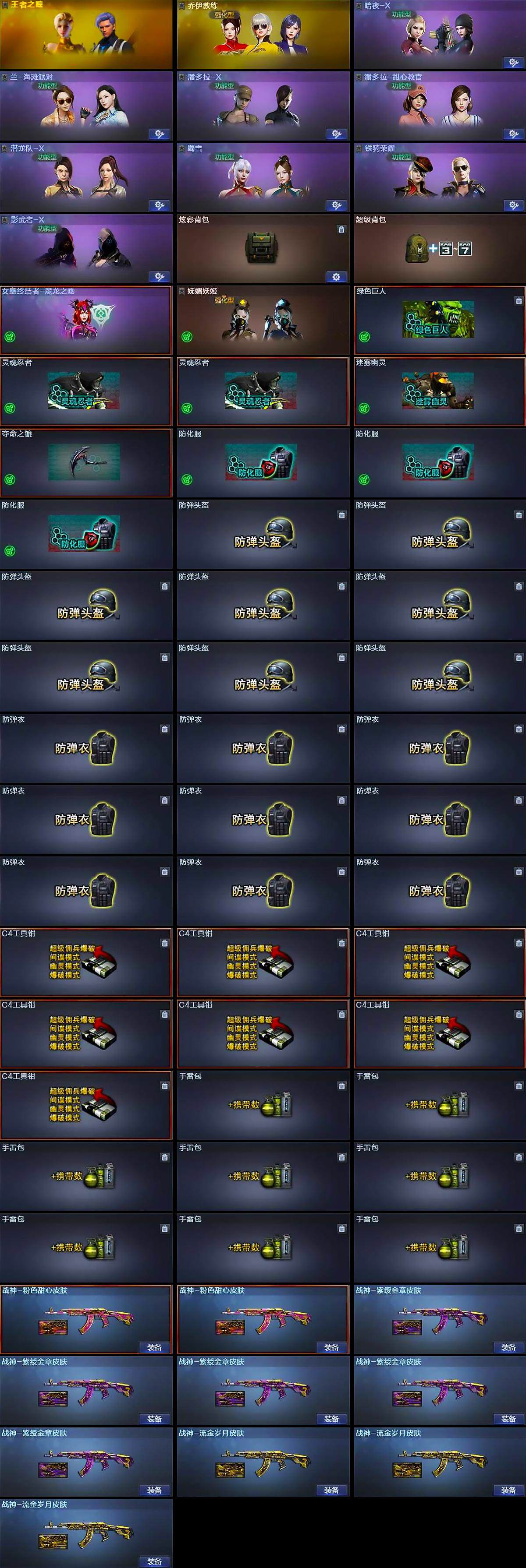 【道具】:炫彩背包,超级背包,女皇终结者-魔龙之吻,妩媚妖姬,绿色巨人,灵魂忍者*2,迷雾幽灵,夺命之镰,防化服*3,防弹头盔*8,防弹衣*9,C4工具钳*7,手雷包*8
