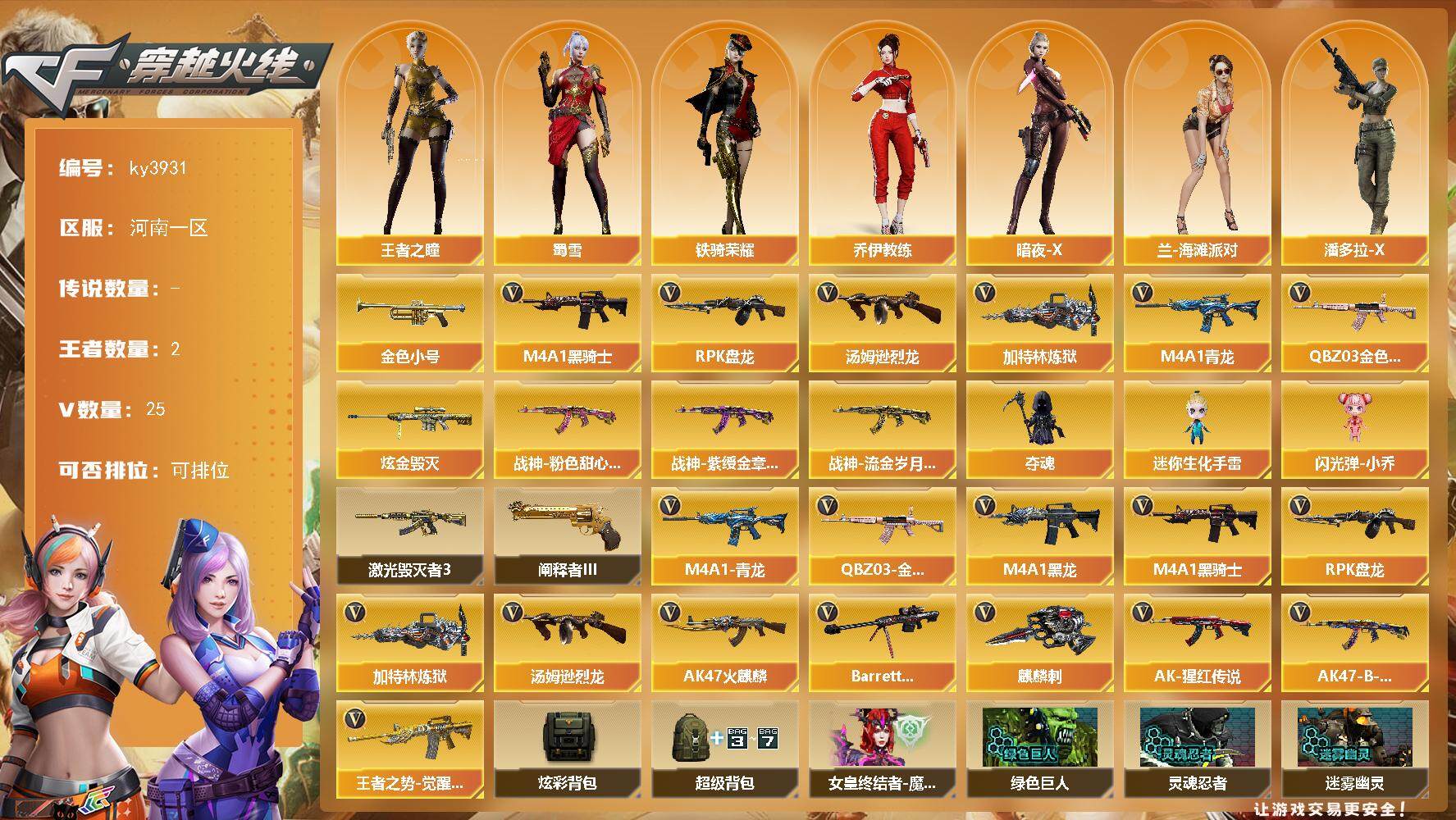 [14256822]河南一区-25V-2王者-1炫金 【热门武器】:QBZ03-金色蔷薇,M4A1-青龙,金色小号,M4A1-黑骑士,汤姆逊-烈龙,RPK-盘龙,加特林-炼狱*2 【王者炫金武器】:炫金毁灭 【皮肤】:战神-粉色甜心皮肤*2,战神-紫绶金章皮肤*5,战神-流金岁月皮肤*3 【角色】:王者之瞳,乔伊教练,暗夜-X,兰-海滩派对,潘多拉-X,潘多拉-甜心教官,潜龙队-X,蜀雪,铁骑荣耀,影武者-X 【人偶武器】:夺魂,迷你生化手雷,闪光弹-小乔 【挑战大师】:激光毁灭者III,阐释者III 【英雄级武器】:AK47-火麒麟,M4A1-黑龙*2,M4A1-黑骑士,M4A1-青龙,QBZ03-金色蔷薇,王者之势-觉醒版,AK-47-猩红传说*10,AK47-B-战神,Barrett-毁灭,RPK-盘龙,加特林-炼狱*2,汤姆逊-烈龙,麒麟刺 【道具】:炫彩背包,超级背包,女皇终结者-魔龙之吻,妩媚妖姬,绿色巨人,灵魂忍者*2,迷雾幽灵,夺命之镰,防化服*3,防弹头盔*8,防弹衣*9,C4工具钳*7,手雷包*8 【特殊枪械】:1黑骑士,1烈龙,1盘龙,2炼狱
