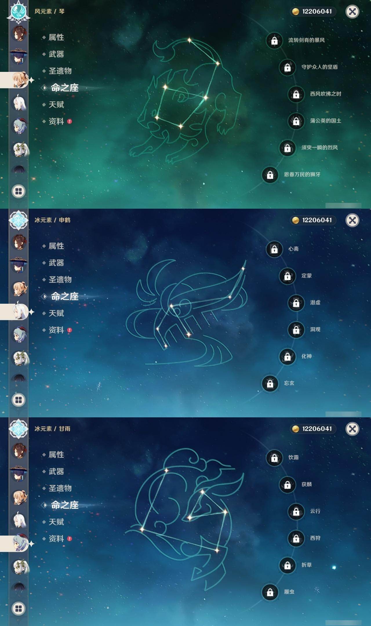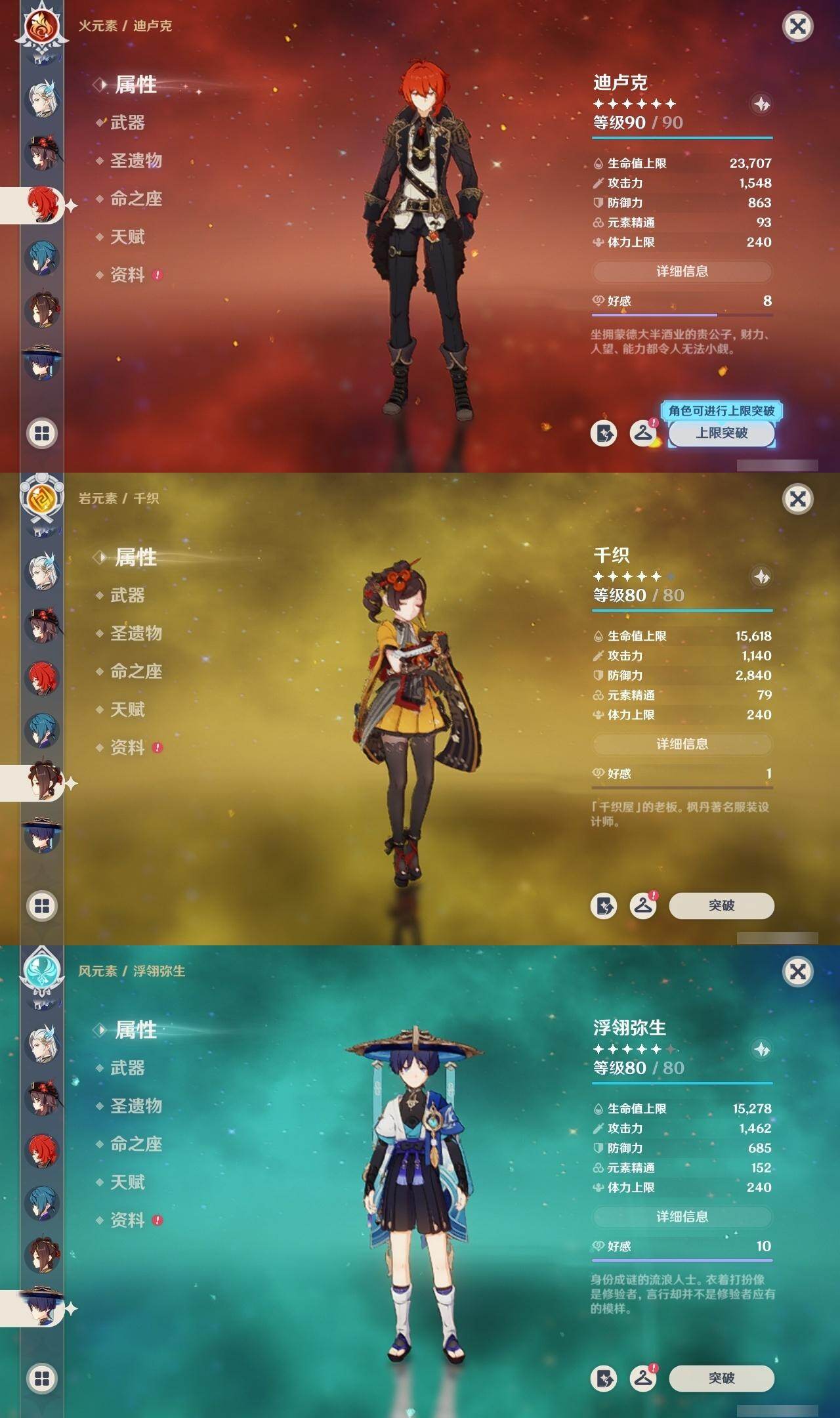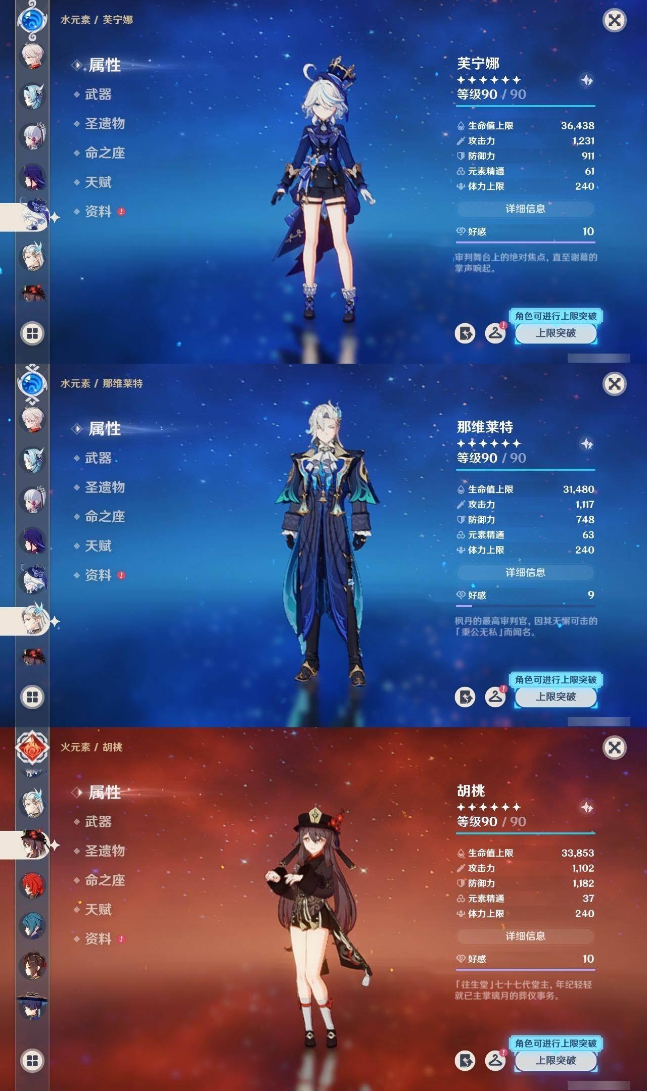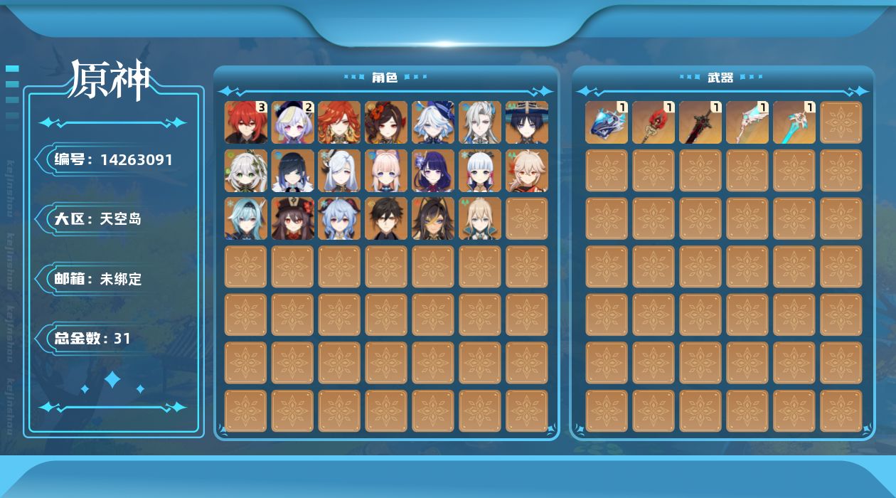 0命千织,0命芙宁娜,0命那维莱特,0命迪希雅,0命流浪者,0命纳西妲,0命夜兰,0命申鹤,0命优菈,0命雷电将军,0命枫原万叶,0命神里绫华,0命钟离,0命胡桃,0命甘雨,0命珊瑚宫心海,2命七七,0命琴,3命迪卢克,0命玛薇卡,精1万世流涌大典,精1护摩之杖,精1天空之翼,精1天空之刃,精1狼的末路
