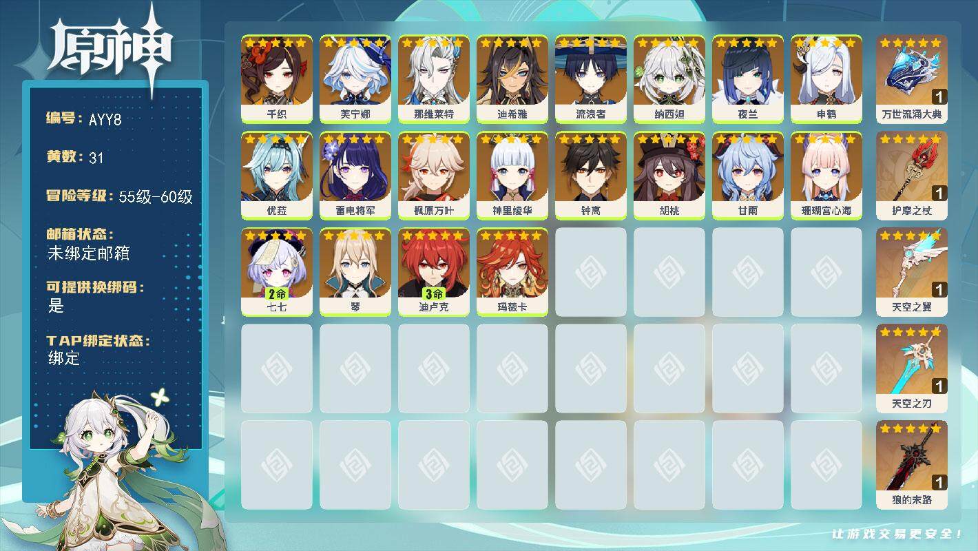 [14263091]60级/31黄/女主/20个五星角色/6个五星武器 0命千织,0命芙宁娜,0命那维莱特,0命迪希雅,0命流浪者,0命纳西妲,0命夜兰,0命申鹤,0命优菈,0命雷电将军,0命枫原万叶,0命神里绫华,0命钟离,0命胡桃,0命甘雨,0命珊瑚宫心海,2命七七,0命琴,3命迪卢克,0命玛薇卡,精1万世流涌大典,精1护摩之杖,精1天空之翼,精1天空之刃,精1狼的末路