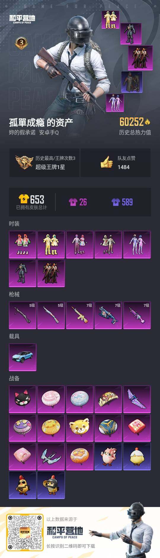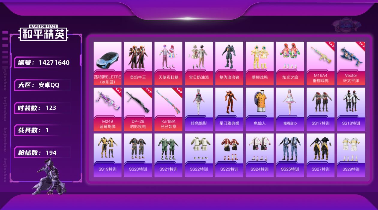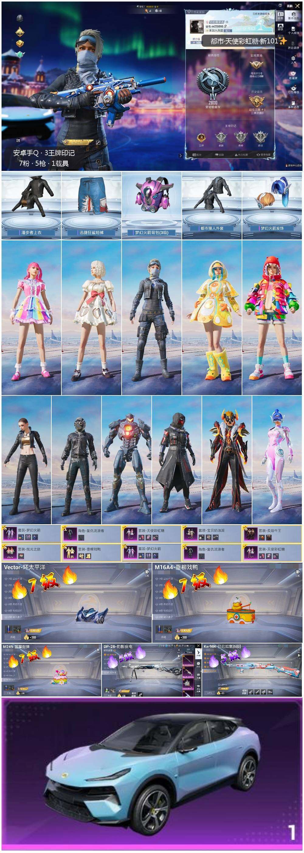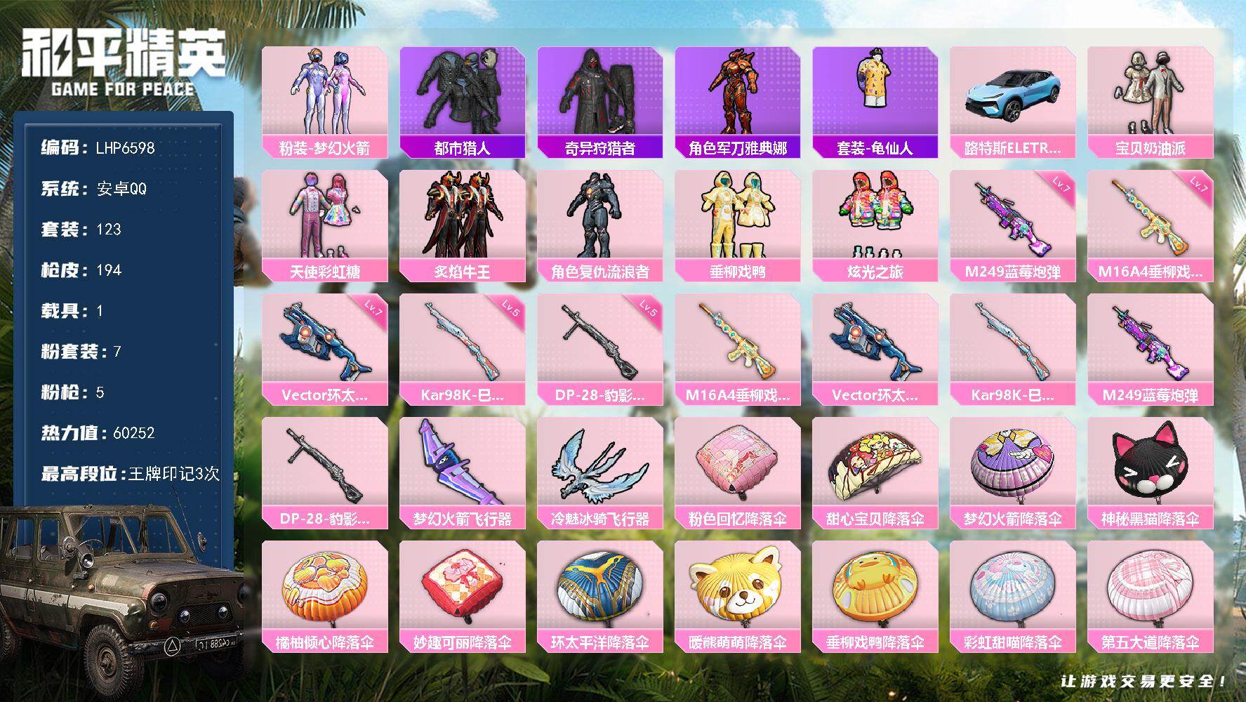 [14271640]【店主推荐捡漏号!可直接换绑】/素材身法号 安卓 手Q-7粉装-5特效枪-1载具-2粉色飞行器-6w热力值-3王牌印记-123套装-194枪皮【热门品类】:粉装-梦幻火箭,套装-都市猎人,套装-奇异狩猎者,角色-军刀雅典娜,套装-龟仙人【粉色载具】:路特斯ELETRE(冰川蓝)【粉色套装】:粉装-宝贝奶油派,粉装-天使彩虹糖,粉装-梦幻火箭,粉装-炙焰牛王,角色-复仇流浪者,粉装-垂柳戏鸭,粉装-炫光之旅【粉色枪皮等级】:M16A4-垂柳戏鸭(七级),Vector-环太平洋(七级),Kar98K-巳巳如意(五级),M249-蓝莓炮弹(七级),DP-28-豹影疾电(五级)【粉色飞行器】:梦幻火箭飞行器,冷魅冰骑飞行器