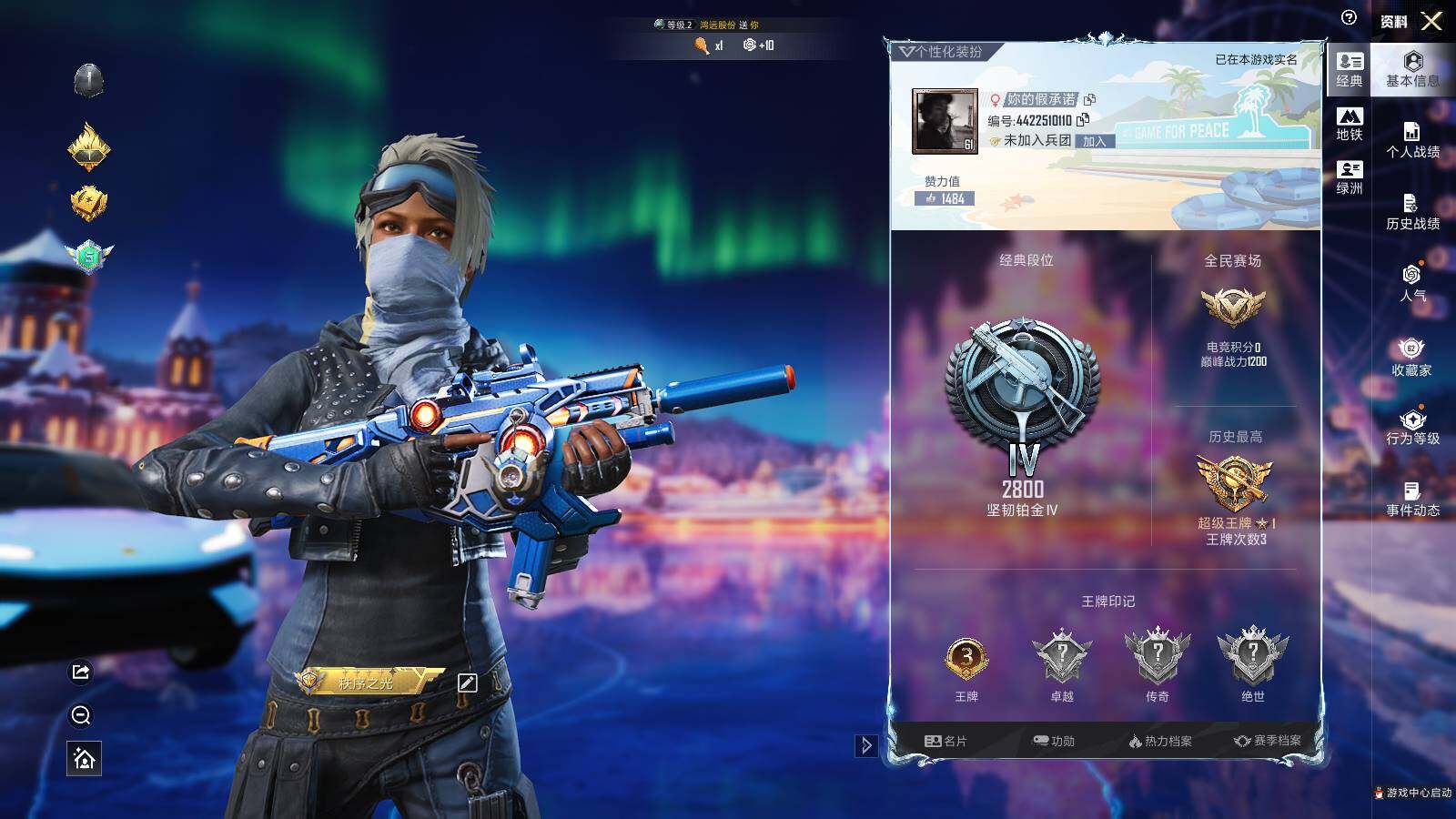 - PX_2093861-贵族等级: V4 英雄数: 53 皮肤数: 17 传说皮: 澜逐花归海 限定皮: 逐霄战戟