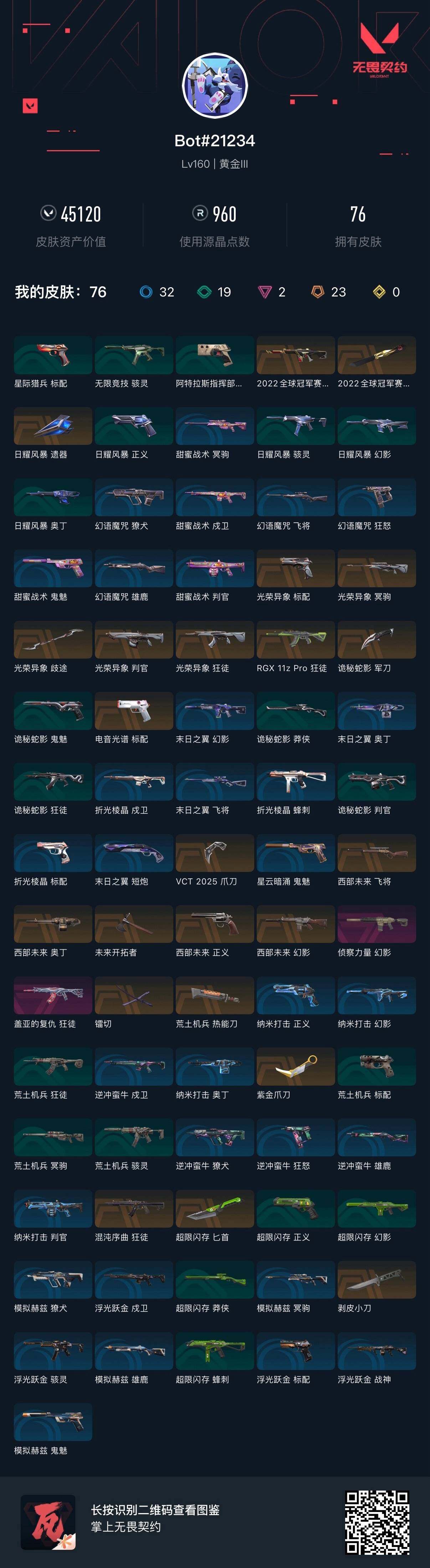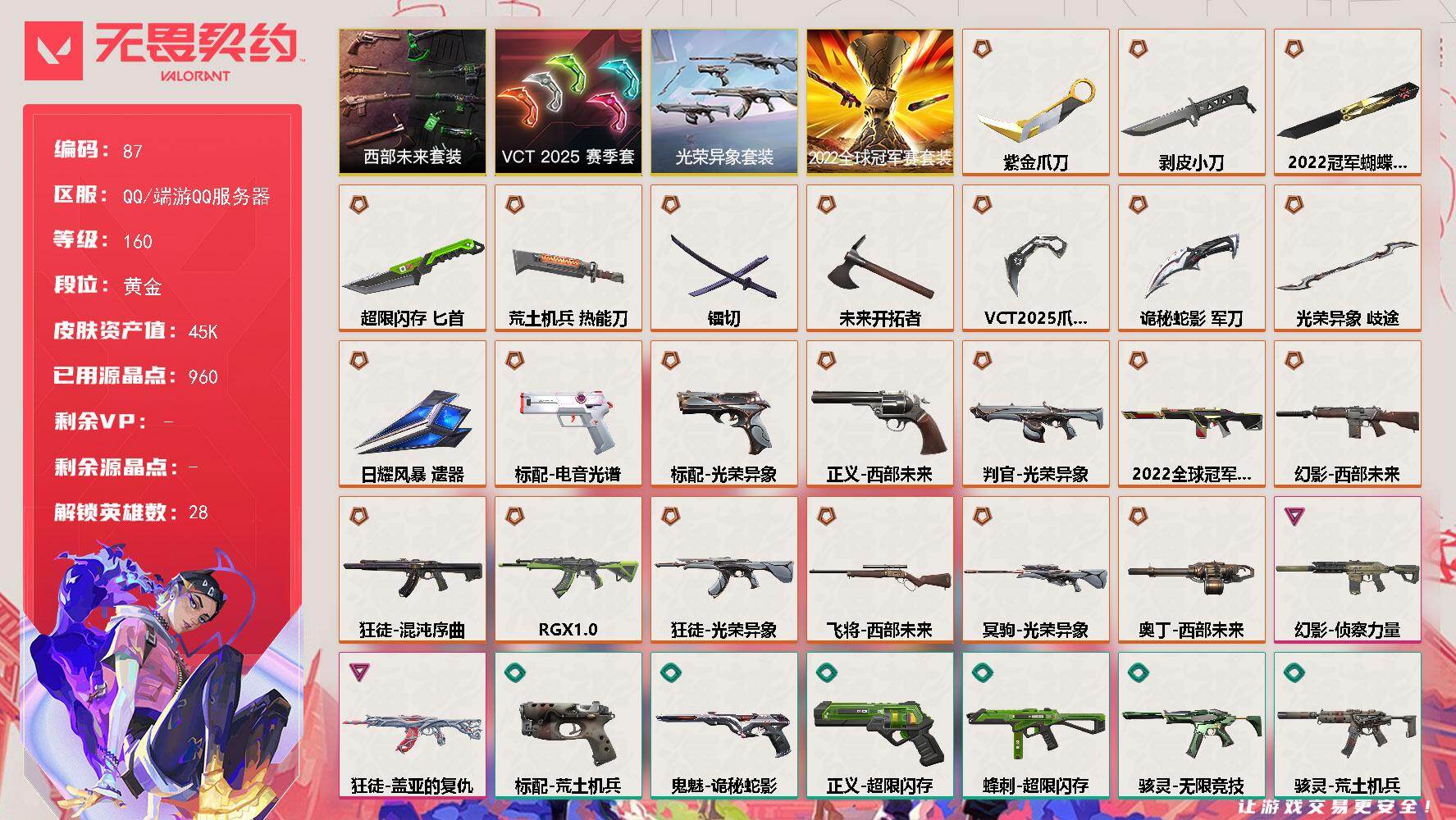 [14272247]【套装】:2022全球冠军赛套装,光荣异象套装,VCT 2025 赛季套装,西部未来套装 【英雄】:幻棱,炼狱,维斯,暮蝶,钛狐,壹决,铁臂,捷风,雷兹,幽影,不死鸟,贤者,猎枭,蝰蛇,零,芮娜,奇乐,尚勃勒,霓虹,斯凯,夜露,星礈,K/O,海神,盖可,黑梦,钢锁 【近战 武器】:近战武器-2022全球冠军赛 蝴蝶刀,近战武器-光荣异象 歧途,近战武器-剥皮小刀,近战武器-VCT 2025 爪刀,近战武器-紫金爪刀,近战武器-镭切,近战武器-未来开拓者,近战武器-超限闪存 匕首,近战武器-荒土机兵 热能刀,近战武器-诡秘蛇影 军刀,近战武器-日耀风暴 遗器 【狂徒】:狂徒-混沌序曲,狂徒-RGX 11z Pro,狂徒-光荣异象,狂徒-盖亚的复仇,狂徒-荒土机兵,狂徒-诡秘蛇影 【幻影】:幻影-2022全球冠军赛,幻影-西部未来,幻影-侦察力量,幻影-超限闪存,幻影-纳米打击,幻影-末日之翼,幻影-西部未来 【戍卫】:戍卫-浮光跃金,戍卫-逆冲蛮牛,戍卫-折光棱晶 【獠犬】:獠犬-模拟赫兹,獠犬-逆冲蛮牛 【冥驹】:冥驹-光荣异象,冥驹-荒土机兵,冥驹-模拟赫兹 【飞将】:飞将-西部未来,飞将-末日之翼 【莽侠】:莽侠-超限闪存,莽侠-诡秘蛇影 【战神】:战神-浮光跃金 【奥丁】:奥丁-西部未来,奥丁-纳米打击,奥丁-末日之翼 【判官】:判官-光荣异象,判官-诡秘蛇影,判官-纳米打击x 【雄鹿】:雄鹿-模拟赫兹,雄鹿-逆冲蛮牛 【骇灵】:骇灵-荒土机兵,骇灵-无限竞技,骇灵-浮光跃金 【蜂刺】:蜂刺-超限闪存,蜂刺-折光棱晶 【标配】:标配-电音光谱,标配-光荣异象,标配-荒土机兵,标配-浮光跃金,标配-折光棱晶,标配-电音光谱 【正义】:正义-西部未来,正义-超限闪存,正义-纳米打击 【鬼魅】:鬼魅-诡秘蛇影,鬼魅-模拟赫兹,鬼魅-星云暗涌 【狂怒】:狂怒-逆冲蛮牛 【短炮】:短炮-末日之翼 【卡面】:终章:激斗汉堡 卡面,进入射程 卡面,分崩离析 卡面,纳米打击 卡面,抑制技术 卡面,激斗汉堡 卡面,瓦娃脸雪糕 P2 卡面,从黄昏到黎明 卡面,荒土机兵 卡面,银弹猎手 卡面,逆冲蛮牛 卡面,《双城之战》拥抱 卡面,精灵大战 卡面,欢迎来到底城 卡面,南瓜盛典 卡面,VCT CN首冠 卡面,唱片的故事 卡面,钢弓与箭弦 卡面,排除故障 卡面,战术桌游 卡面,悠享食