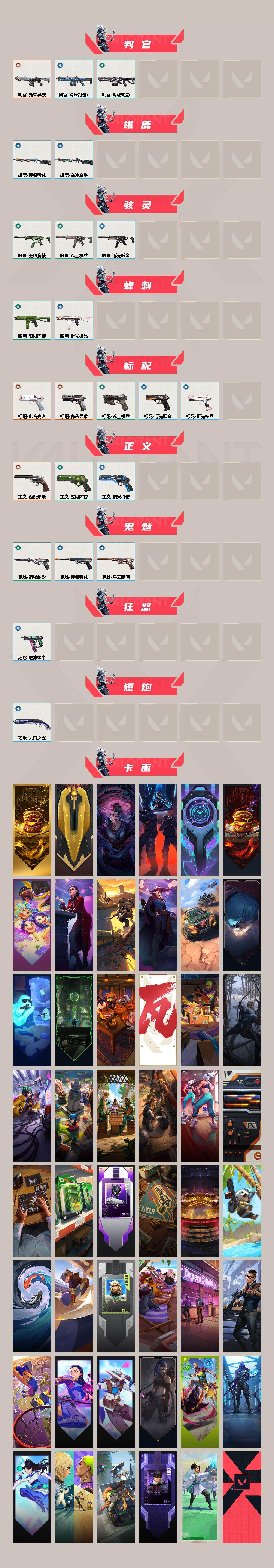 【卡面】:终章:激斗汉堡 卡面,进入射程 卡面,分崩离析 卡面,纳米打击 卡面,抑制技术 卡面,激斗汉堡 卡面,瓦娃脸雪糕 P2 卡面,从黄昏到黎明 卡面,荒土机兵 卡面,银弹猎手 卡面,逆冲蛮牛 卡面,《双城之战》拥抱 卡面,精灵大战 卡面,欢迎来到底城 卡面,南瓜盛典 卡面,VCT CN首冠 卡面,唱片的故事 卡面,钢弓与箭弦 卡面,排除故障 卡面,战术桌游 卡面,悠享食