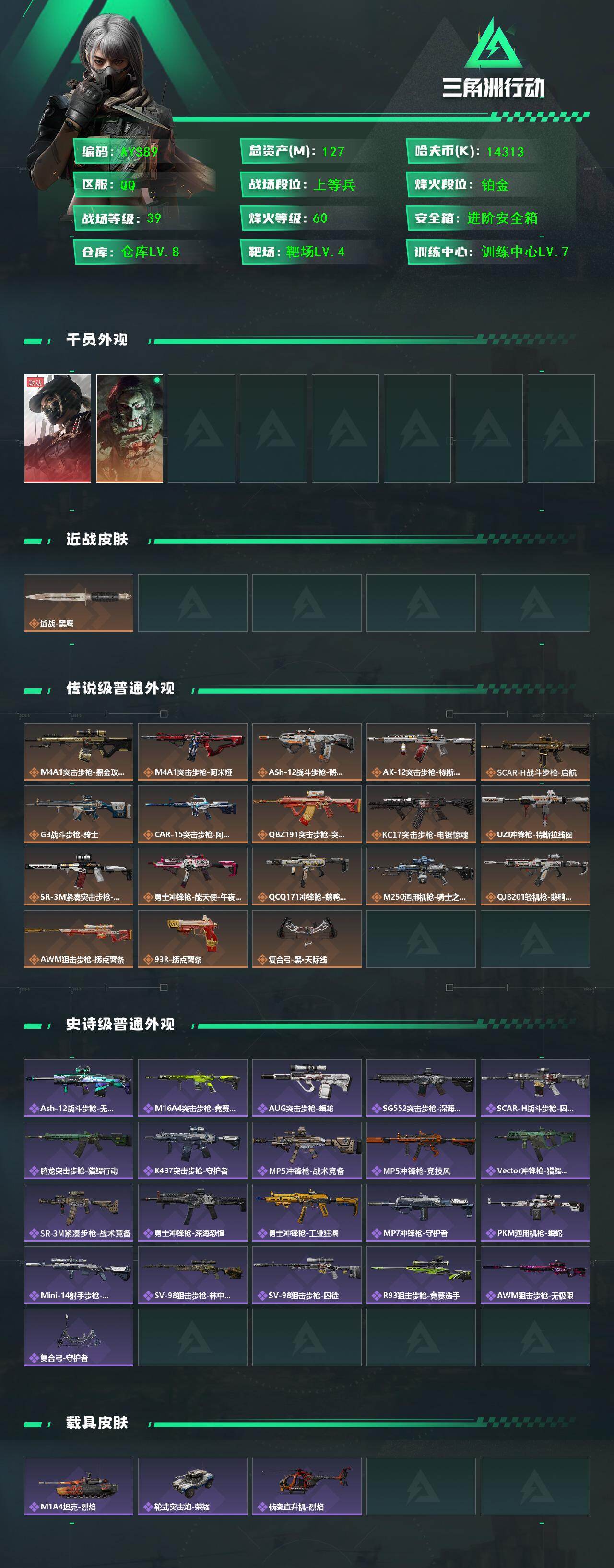 [14272363]可二次【店主推荐捡漏号!可直接换绑】 14313k哈伏币-92m流动资产-60烽火等级-铂金-39战场等级-上等兵 【干员外观】:露娜-黑·天际线,红狼-电锯惊魂 【近战皮肤】:近战-黑鹰 【传说级普通外观】:M4A1突击步枪-蚀金玫瑰,M4A1突击步枪-阿米娅,ASh-12战斗步枪-鹅鸭杀,AK-12突击步枪-特斯拉线圈,SCAR-H战斗步枪-启航,G3战斗步枪-骑士,CAR-15突击步枪-阿米娅,腾龙突击步枪-捞点薯条,KC17突击步枪-电锯惊魂,UZI冲锋枪-特斯拉线圈,SR-3M紧凑突击步枪-特斯拉线圈,勇士冲锋枪-能天使-午夜邮差,QCQ171冲锋枪-鹅鸭杀,M250通用机枪-骑士之心,QJB201轻机枪-鹅鸭杀,AWM狙击步枪-捞点薯条,93R-捞点薯条,复合弓-黑·天际线 【史诗级普通外观】:ASh-12战斗步枪-无极限,M16A4突击步枪-竞赛选手,AUG突击步枪-蝮蛇,SG552突击步枪-深海恐惧,SCAR-H战斗步枪-囚徒,腾龙突击步枪-猎鳄行动,K437突击步枪-守护者,MP5冲锋枪-战术竞备,MP5冲锋枪-竞技风,Vector冲锋枪-猎鳄行动,SR-3M紧凑突击步枪-战术竞备,勇士冲锋枪-深海恐惧,勇士冲锋枪-工业狂潮,MP7冲锋枪-守护者,PKM通用机枪-蝮蛇,Mini-14射手步枪-守护者,SV-98狙击步枪-林中猎手,SV-98狙击步枪-囚徒,R93狙击步枪-竞赛选手,AWM狙击步枪-无极限,复合弓-守护者 【稀有级普通外观】:SG552突击步枪-天际线,沙漠之鹰-天际线,PKM通用机枪-精湛工艺,AKM突击步枪-战术演练,AKM突击步枪-肃杀,QBZ95-1突击步枪-公平竞技,M16A4突击步枪-街头涂鸦,M7战斗步枪-前沿科技,M7战斗步枪-捣蛋鬼,SCAR-H战斗步枪-荣耀列队,SCAR-H战斗步枪-黄昏,G3战斗步枪-战术演练,G3战斗步枪-主宰,PTR32突击步枪-前沿科技,PTR-32突击步枪-天网,腾龙突击步枪-冰天雪地,MP5冲锋枪-弄臣,MP5冲锋枪-虎啸,MP5冲锋枪-哈夫克卫队,P90冲锋枪-黄昏,Vector冲锋枪-先锋,UZI冲锋枪-前沿科技,UZI冲锋枪-亚特兰蒂斯,野牛冲锋枪-前沿科技,SMG-45-行动开启,SMG-45冲锋枪-幻影结构,SMG-45冲锋枪-天网,勇士冲锋枪-冰天雪地,M1014霰弹枪