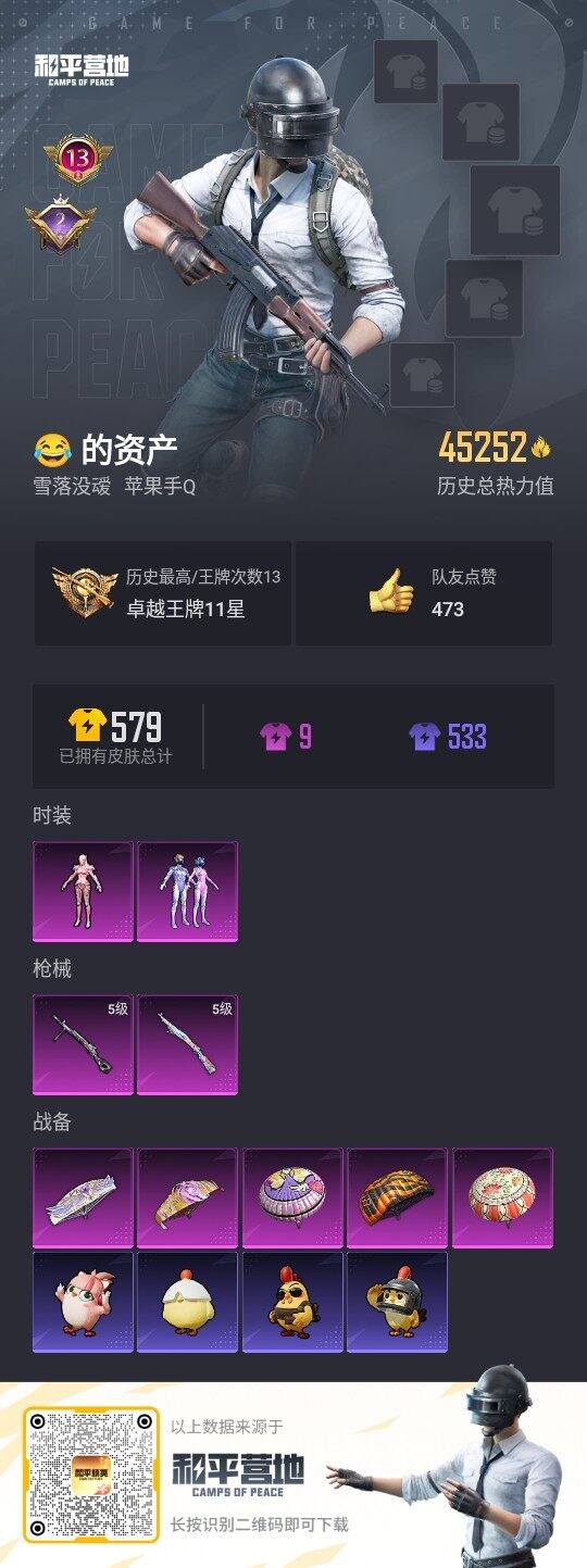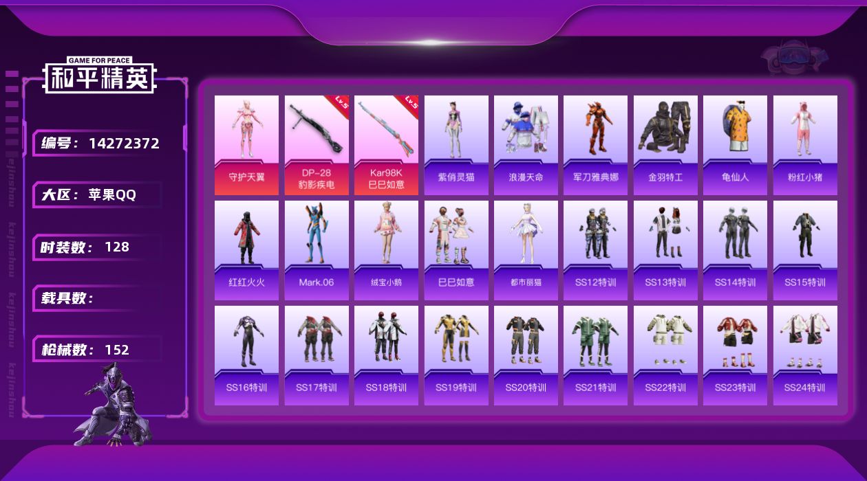 [14272372]可二次【店主推荐捡漏号!可直接换绑】/地铁满天赋 苹果 手Q-2粉装-2特效枪-4.5w热力值-13王牌印记-128套装-152枪皮【热门品类】:粉装-梦幻火箭,套装-浪漫天命,角色-军刀雅典娜,套装-胖达圆圆,套装-金羽特工,套装-龟仙人,套装-粉红小猪,套装-红红火火,角色-Mark.06【粉色套装】:粉装-梦幻火箭,角色-守护天翼【粉色枪皮等级】:Kar98K-巳巳如意(五级),DP-28-豹影疾电(五级)