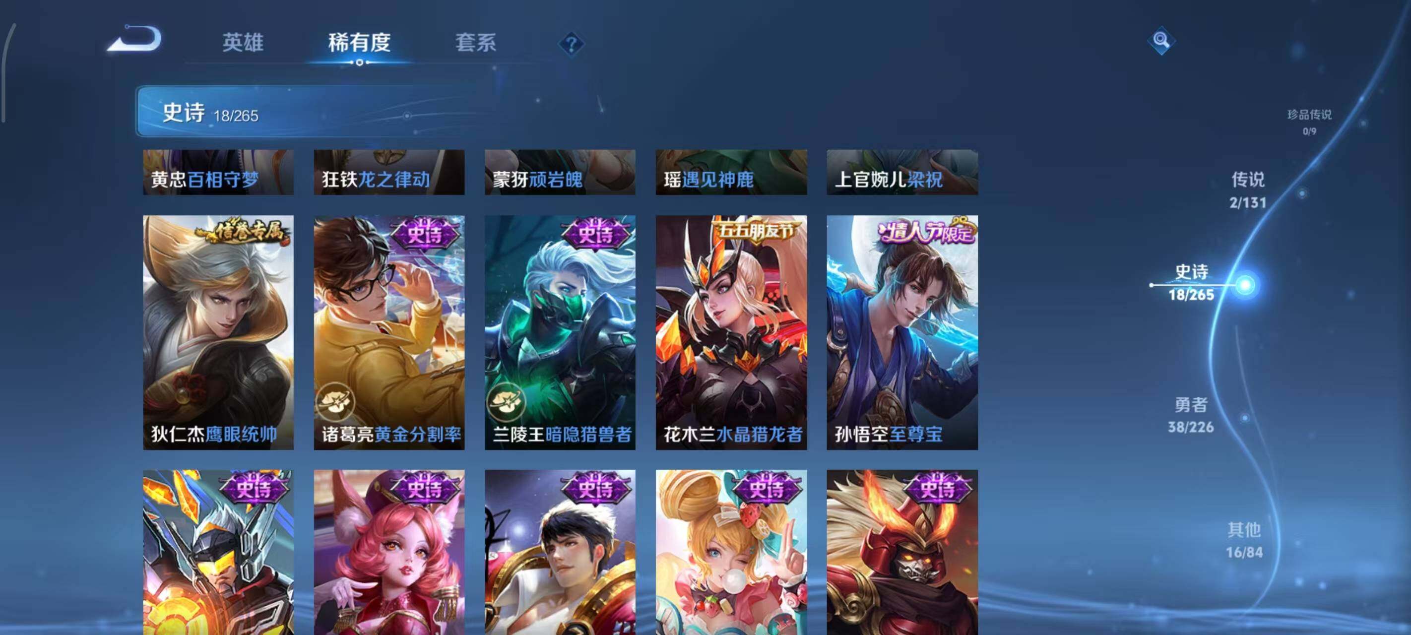 【史诗皮肤】:赵云皇家上将,赵云未来纪元,廉颇地狱岩魂,宫本武藏鬼剑武藏,孙尚香水果甜心,嬴政摇滚巨星,妲己魅力维加斯,吕布末日机甲,孙悟空至尊宝,花木兰水晶猎龙者,兰陵王暗隐猎兽者,诸葛亮黄金分割率,狄仁杰鹰眼统帅,上官婉儿梁祝,瑶遇见神鹿,蒙犽顽岩魄,狂铁龙之律动,黄忠百相守梦