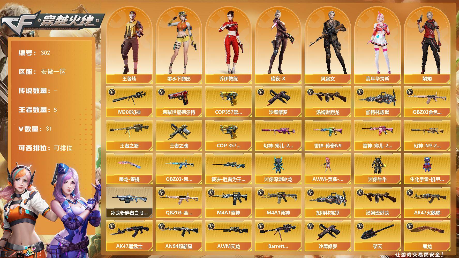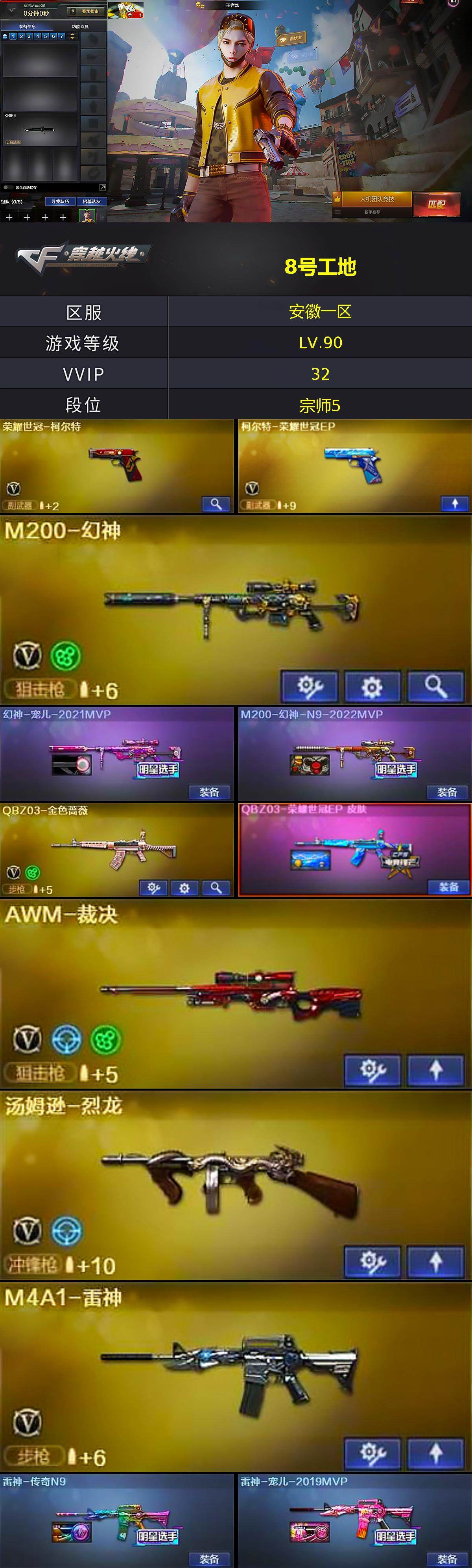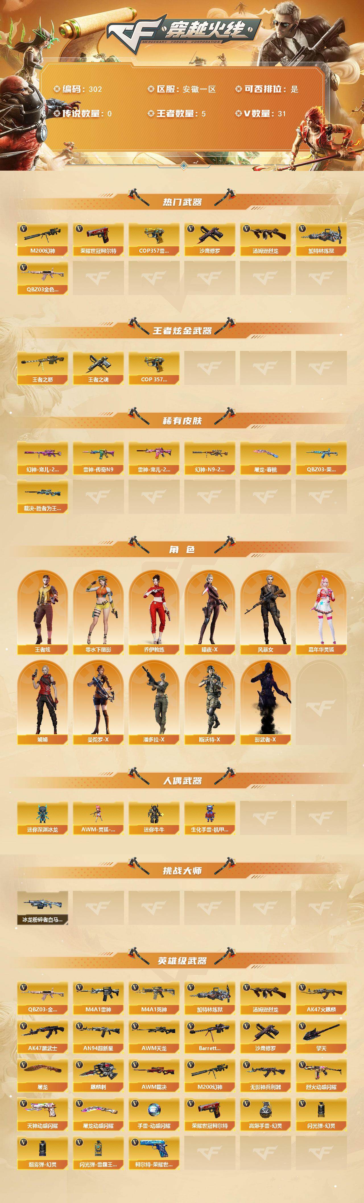 [14275644]安徽一区-31V-5王者-0炫金 【热门武器】:QBZ03-金色蔷薇,M200-幻神,荣耀世冠-柯尔特,汤姆逊-烈龙,加特林-炼狱,COP 357-雷霆王者,沙鹰-修罗 【王者炫金武器】:王者之怒,王者之魂,COP 357-雷霆王者 【皮肤】:幻神-宠儿-2021MVP,M200-幻神-N9-2022MVP,QBZ03-荣耀世冠EP 皮肤,裁决-胜者为王 皮肤,雷神-传奇N9,雷神-宠儿-2019MVP,屠龙-春桃 皮肤 【角色】:王者炫,乔伊教练,暗夜-X,风暴女,嘉年华灵狐,娟娟,零-水下丽影,曼陀罗-X,潘多拉-X,斯沃特-X,影武者-X 【人偶武器】:AWM-灵狐-15周年嘉年华,迷你深渊冰龙,迷你牛牛,生化手雷-机甲核心*2 【挑战大师】:冰龙粉碎者-白马银枪 【英雄级武器】:AK47-火麒麟,M4A1-雷神,M4A1-死神,AK47-黑武士,AN94-超新星,无影-神兵利器,QBZ03-金色蔷薇,烈火-动感闪耀,AWM-天龙,Barrett-毁灭,AWM-裁决,M200-幻神,加特林-炼狱,汤姆逊-烈龙,沙鹰-修罗,荣耀世冠-柯尔特,柯尔特-荣耀世冠EP,天神-动感闪耀,屠龙*2,擎天,麒麟刺,屠龙-动感闪耀,高爆手雷-幻灵,手雷-动感闪耀,闪光弹-幻灵,闪光弹-雷霆王者-觉醒版,烟雾弹-幻灵 【道具】:CFPL炫彩背包,夺命之镰,防化服,金色流光-枪王排位*2,星辰流光-枪王排位,枪王排位28赛季金色流光,动感闪耀表情,C4-沙漠,防弹头盔,防弹衣,C4工具钳,手雷包 【特殊枪械】:1烈龙,1炼狱