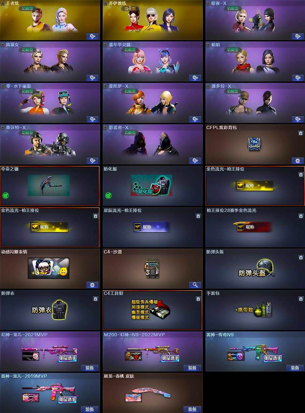 【道具】:CFPL炫彩背包,夺命之镰,防化服,金色流光-枪王排位*2,星辰流光-枪王排位,枪王排位28赛季金色流光,动感闪耀表情,C4-沙漠,防弹头盔,防弹衣,C4工具钳,手雷包