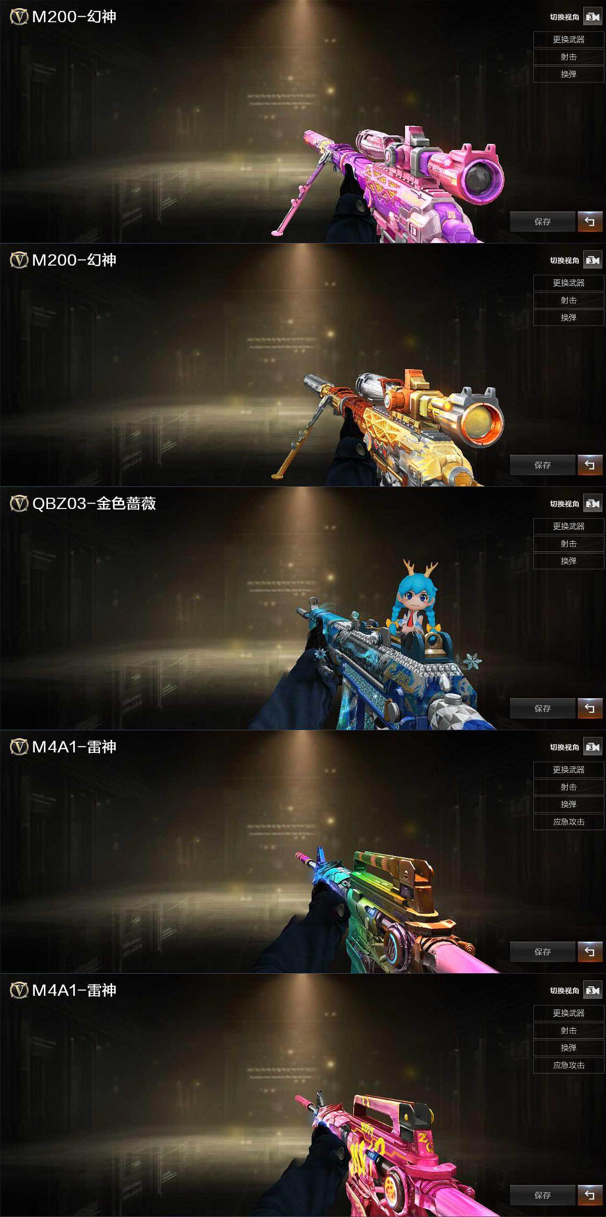 【热门武器】:QBZ03-金色蔷薇,M200-幻神,荣耀世冠-柯尔特,汤姆逊-烈龙,加特林-炼狱,COP 357-雷霆王者,沙鹰-修罗