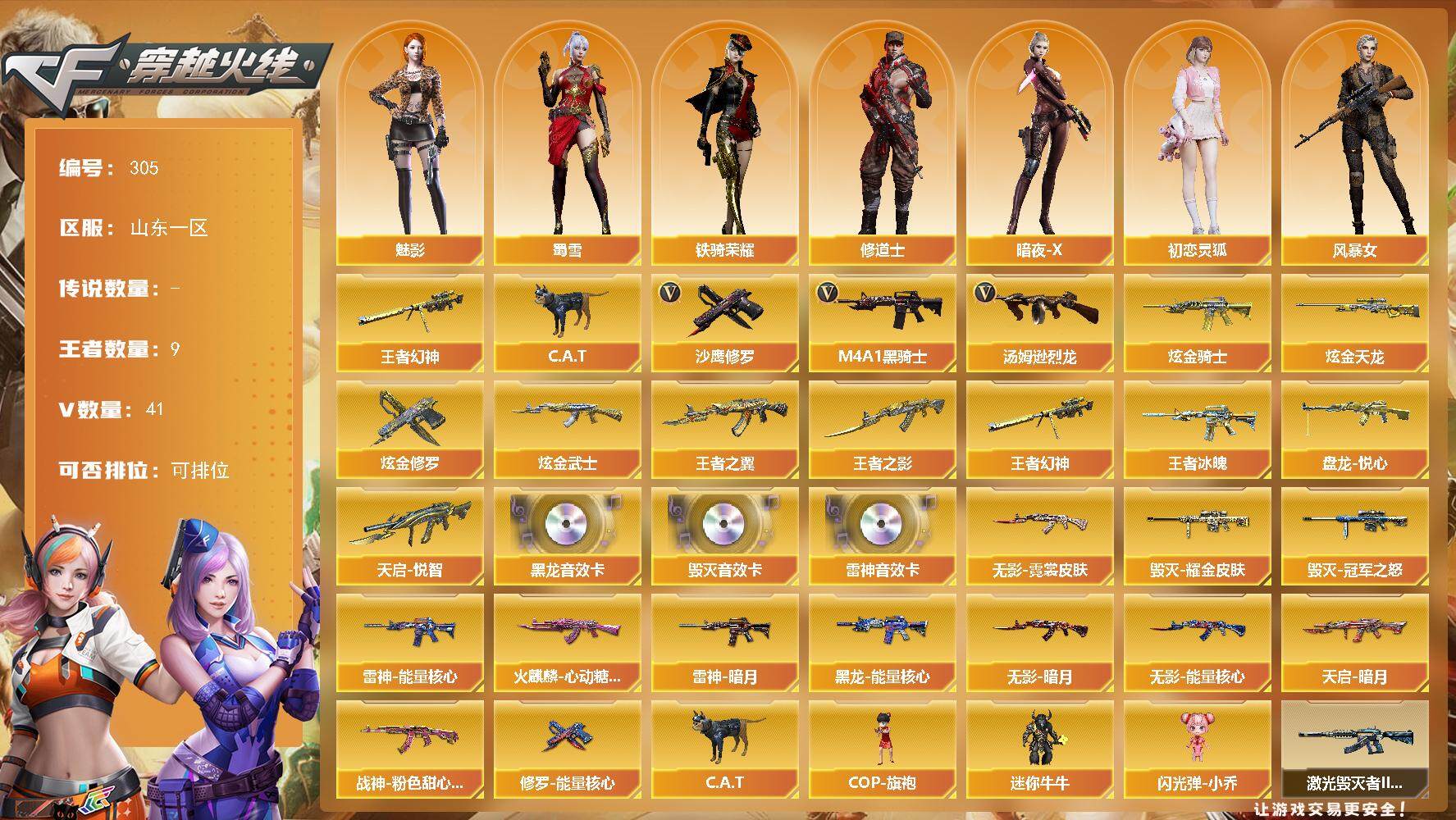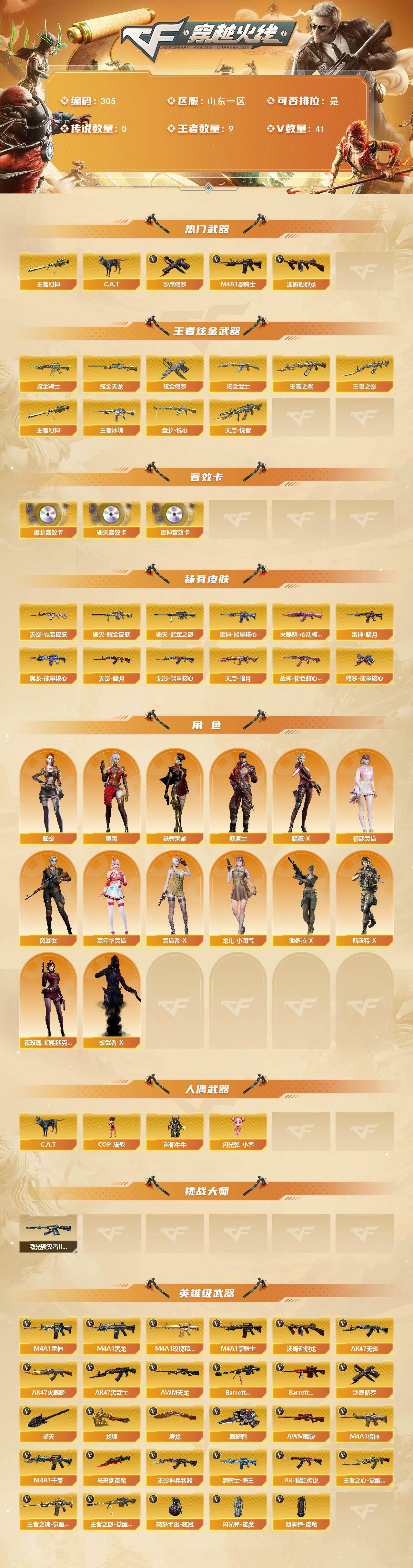 [14276872]山东一区-41V-9王者-4炫金 【热门武器】:王者幻神,C.A.T,M4A1-黑骑士,汤姆逊-烈龙,沙鹰-修罗*5 【王者炫金武器】:王者冰魄,天启-悦智,王者之翼,王者之影,王者幻神,盘龙-悦心,炫金骑士,炫金武士,炫金天龙,炫金修罗 【音效卡】:M4A1-雷神音效卡,M4A1-黑龙音效卡,Barrett-毁灭音效卡 【皮肤】:雷神-暗月,雷神-能量核心*2,火麒麟-心动糖果,毁灭耀金皮肤,毁灭-冠军之怒,黑龙-能量核心*2,无影-暗月*2,无影-能量核心,无影-霓裳皮肤,天启-暗月,战神-粉色甜心皮肤,修罗-能量核心 【角色】:魅影,修道士,暗夜-X,初恋灵狐,风暴女,嘉年华灵狐,灵狐者-X,龙儿-小淘气,潘多拉-X,斯沃特-X,蜀雪,铁骑荣耀,夜玫瑰-幻能朋克,影武者-X 【人偶武器】:COP-旗袍,C.A.T,迷你牛牛,闪光弹-小乔 【挑战大师】:激光毁灭者III-白马银枪 【英雄级武器】:M4A1-千变,AK47-火麒麟*2,M4A1-黑龙,M4A1-雷神,M4A1-黑骑士,AK47-无影*2,AK47-黑武士,无影-神兵利器,M4A1-玫瑰精灵,M4A1-猎神,王者之心-觉醒版,王者之魄-觉醒版,AK-47-猩红传说,黑骑士-海王*2,AWM-天龙,Barrett-毁灭*2,Barrett-极光*2,AWM-裁决,王者之怒-觉醒版,汤姆逊-烈龙,沙鹰-修罗*5,屠龙*4,龙啸,马来剑-夜魔,擎天,麒麟刺*2,高爆手雷-夜魔,闪光弹-夜魔,烟雾弹-夜魔 【道具】:云山科技背包,全能枪王背包,战舰背包,炫彩背包,虎牙炫彩背包,超级背包*2,女皇终结者-魔龙之吻,救世主-黑桃战神,绿色巨人,灵魂忍者,迷雾幽灵*2,夺命之镰,防化服*3,金色流光-枪王排位,枪王排位29赛季金色流光,防弹头盔*9,防弹衣*8,C4工具钳*6,手雷包*5 【特殊枪械】:1黑骑士,1烈龙
