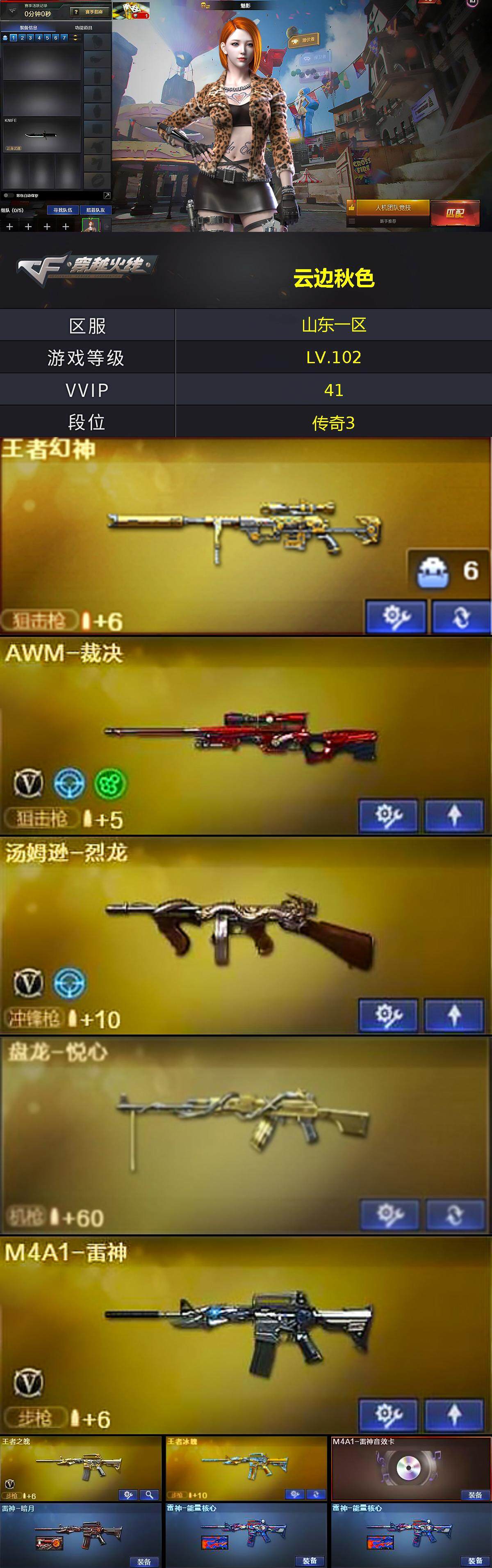 - [12231744]【商品标题】:云南一区-32V-3王者-0炫金 【热门武器】:M4A1-黑骑士,汤姆逊-烈龙,沙鹰-修罗*4 【稀有皮肤】:雷神-能量核心,雷神-荣耀之魄,雷神-星空,黑骑士-暗月*3,毁灭-暗月*2,毁灭-星空,天龙-秘银,AK47-黑武士-361,烈龙-星空 【角色】:王者-零,狐影 【人偶武器】:闪光弹-小乔 【挑战大师】:AK47-冰龙粉碎者 【英雄级武器】:M4A1-雷神*3,M4A1-黑骑士,汤姆逊-烈龙,AK47-无影,AK47-黑武士,AWM-天龙,Barrett-毁灭*3,Barrett-极光,AK-47-猩红传说*6,AK47-B-战神,沙鹰-天神,沙鹰-修罗*4,龙啸,屠龙*5 【特殊枪械】:1黑骑士,1烈龙