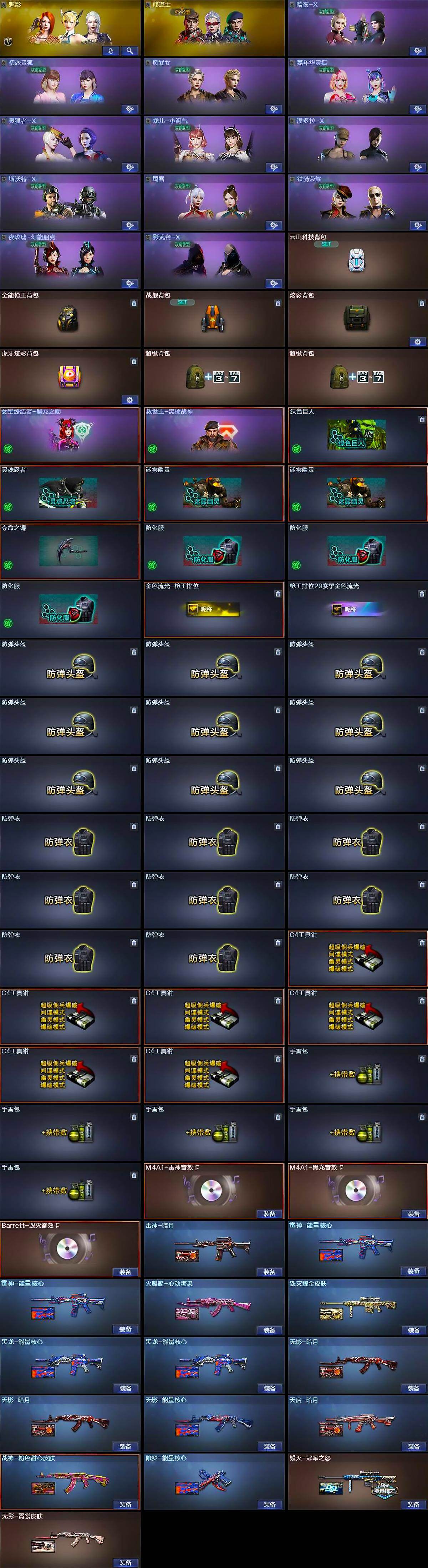 【道具】:云山科技背包,全能枪王背包,战舰背包,炫彩背包,虎牙炫彩背包,超级背包*2,女皇终结者-魔龙之吻,救世主-黑桃战神,绿色巨人,灵魂忍者,迷雾幽灵*2,夺命之镰,防化服*3,金色流光-枪王排位,枪王排位29赛季金色流光,防弹头盔*9,防弹衣*8,C4工具钳*6,手雷包*5