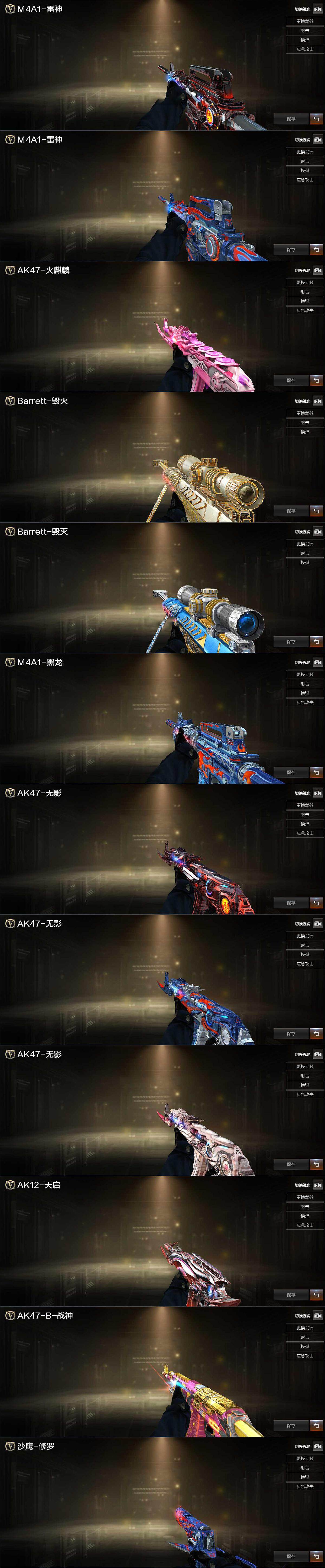 【英雄级武器】:M4A1-千变,AK47-火麒麟*2,M4A1-黑龙,M4A1-雷神,M4A1-黑骑士,AK47-无影*2,AK47-黑武士,无影-神兵利器,M4A1-玫瑰精灵,M4A1-猎神,王者之心-觉醒版,王者之魄-觉醒版,AK-47-猩红传说,黑骑士-海王*2,AWM-天龙,Barrett-毁灭*2,Barrett-极光*2,AWM-裁决,王者之怒-觉醒版,汤姆逊-烈龙,沙鹰-修罗*5,屠龙*4,龙啸,马来剑-夜魔,擎天,麒麟刺*2,高爆手雷-夜魔,闪光弹-夜魔,烟雾弹-夜魔