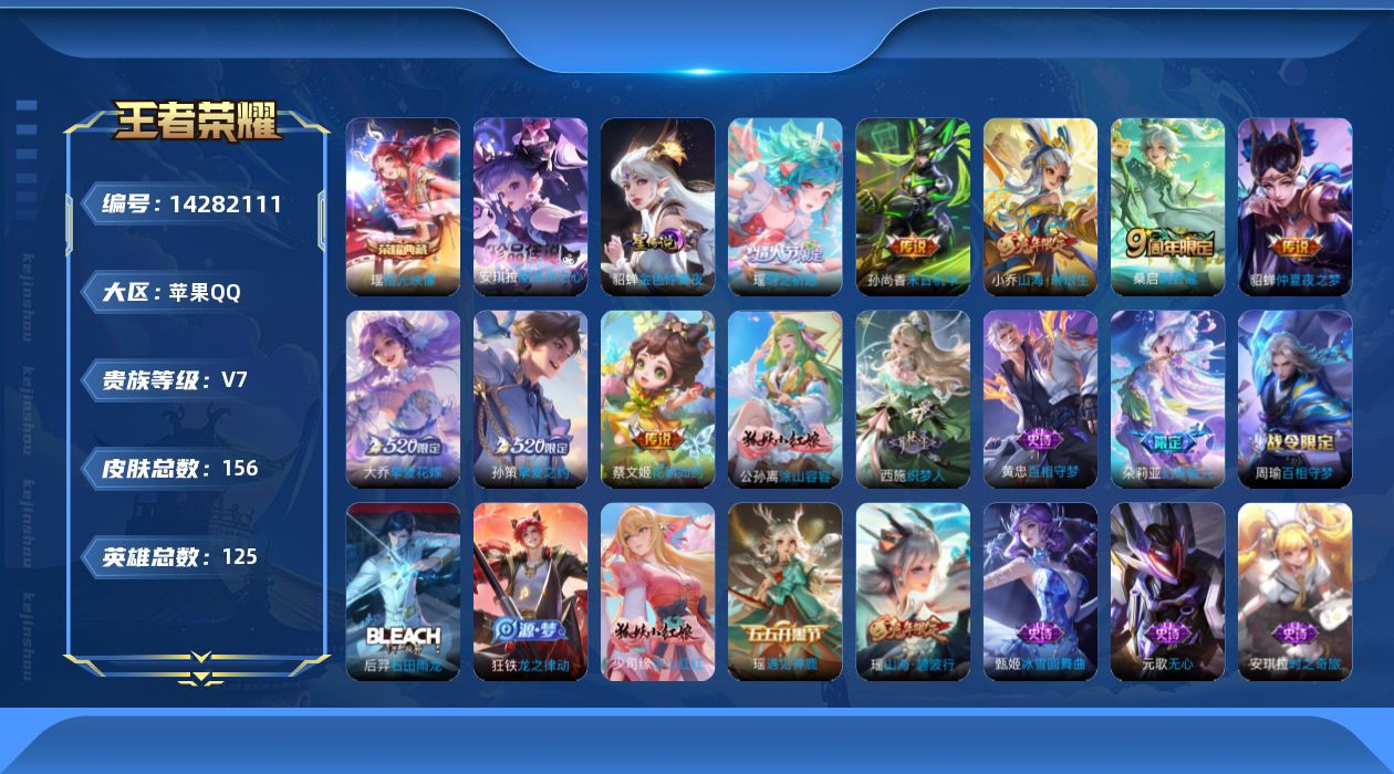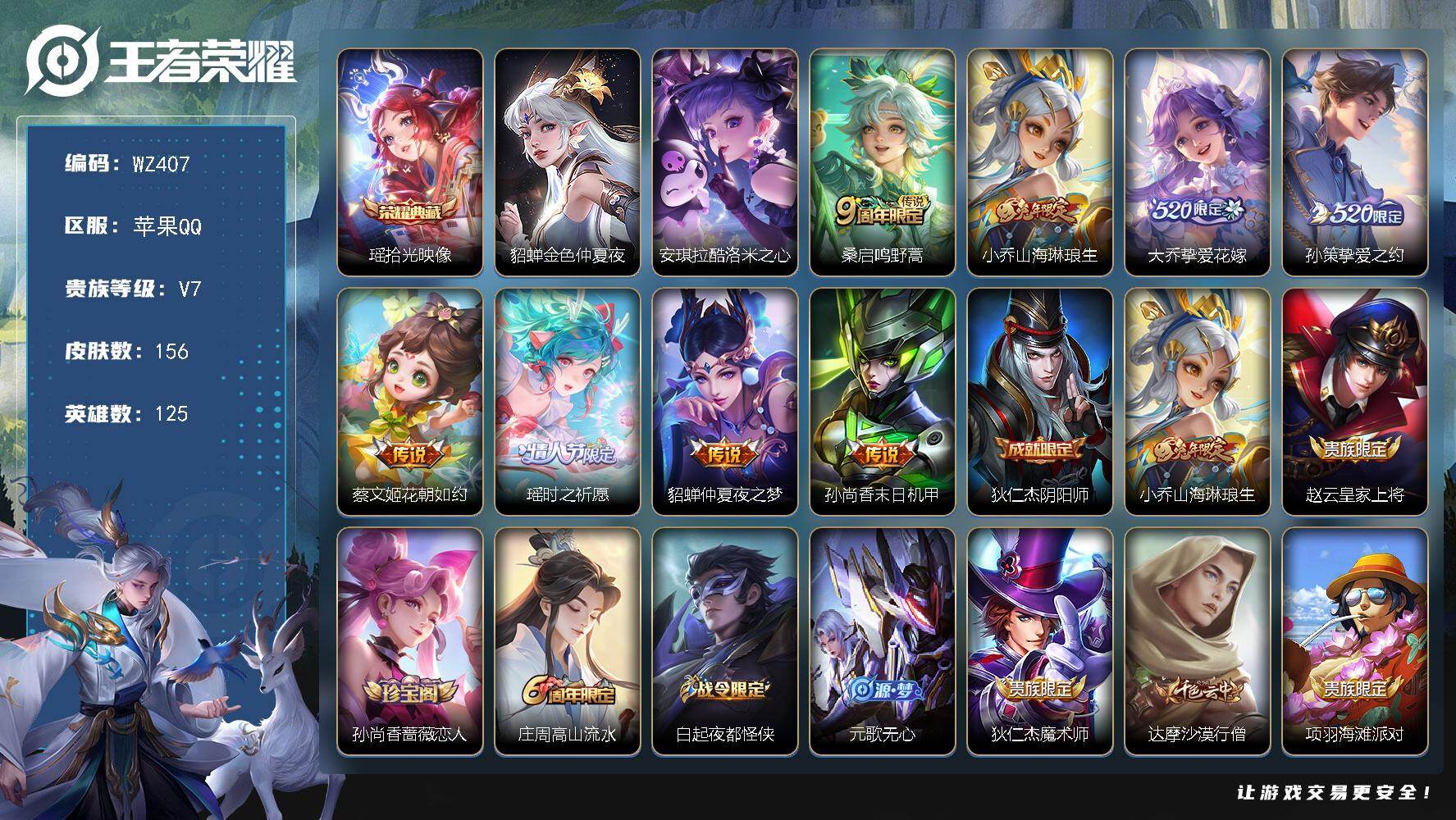 [14282111]金标多瑶 朵利亚 苹蔡文姬 果Q-V7-156皮肤-1典藏皮肤-1珍品传说-8传说-43史诗 【英雄全皮】:空空儿全皮,少司缘全皮 【荣耀典藏】:瑶拾光映像 【珍品传说】:安琪拉酷洛米之心 【传说皮肤】:桑启鸣野蒿,小乔山海琳琅生,大乔挚爱花嫁,孙策挚爱之约,蔡文姬花朝如约,瑶时之祈愿,貂蝉仲夏夜之梦,孙尚香末日机甲 【限定皮肤】:狄仁杰阴阳师,小乔山海琳琅生,赵云皇家上将,孙尚香蔷薇恋人,庄周高山流水,白起夜都怪侠,元歌无心,狄仁杰魔术师,达摩沙漠行僧,项羽海滩派对,兰陵王金庭之子,后羿圣弓游侠,李元芳云中旅人,干将莫邪真爱魔法,鬼谷子五谷丰年,大乔挚爱花嫁,苏烈千军破阵,沈梦溪大漠名商,明世隐吟游魔法,裴擒虎擒涛扼浪,瑶时之祈愿,瑶山海碧波行,孙策挚爱之约,嫦娥拒霜思,鲁班大师探海日志,桑启海盐诗旅,阿古朵江河有灵,张良古海寻踪,鬼谷子天穹祈灯,沈梦溪龙舞盛年,刘邦剑破天穹,周瑜熔金海岸 【年限皮肤】:瑶山海碧波行,小乔山海琳琅生 【赛季限定】:达摩沙漠行僧,兰陵王金庭之子,张良古海寻踪,李元芳云中旅人,苏烈千军破阵,沈梦溪大漠名商,裴擒虎擒涛扼浪,鲁班大师探海日志,桑启海盐诗旅,鬼谷子天穹祈灯,刘邦剑破天穹 【战令限定】:白起夜都怪侠,后羿圣弓游侠,干将莫邪真爱魔法,明世隐吟游魔法 【史诗皮肤】:赵云皇家上将,貂蝉圣诞恋歌,甄姬冰雪圆舞曲,狄仁杰魔术师,廉颇地狱岩魂,宫本武藏鬼剑武藏,孙尚香蔷薇恋人,孙尚香水果甜心,嬴政暗夜贵公子,妲己魅力维加斯,妲己女仆咖啡,墨子金属风暴,夏侯惇乘风破浪,小乔缤纷独角兽,兰陵王暗隐猎兽者,雅典娜冰冠公主,安琪拉心灵骇客,蔡文姬舞动绿茵,刘禅天才门将,李元芳逐浪之夏,白起星夜王子,伽罗箭羽风息,狄仁杰鹰眼统帅,瑶遇见神鹿,西施诗语江南,干将莫邪真爱魔法,安琪拉时之奇旅,庄周高山流水,嫦娥拒霜思,明世隐吟游魔法,鬼谷子五谷丰年,元歌无心,瑶山海碧波行,阿古朵江河有灵,少司缘涂山红红,狂铁龙之律动,后羿石田雨龙,周瑜百相守梦,黄忠百相守梦,朵莉亚幻珠鲛人,西施织梦人,公孙离涂山容容,少司缘巫礼祀神 【其他皮肤】:项羽海滩派对,韩信教廷特使,韩信街头霸王,露娜哥特玫瑰,阿轲爱心护理,赵云忍炎影,扁鹊化身博士,安琪拉玩偶对对碰,孙膑天使之翼,亚瑟死亡骑士,花木兰兔女郎,张飞五福同心,甄姬花好人间,狄仁杰阴阳师,李元芳黑猫爱糖果,钟无