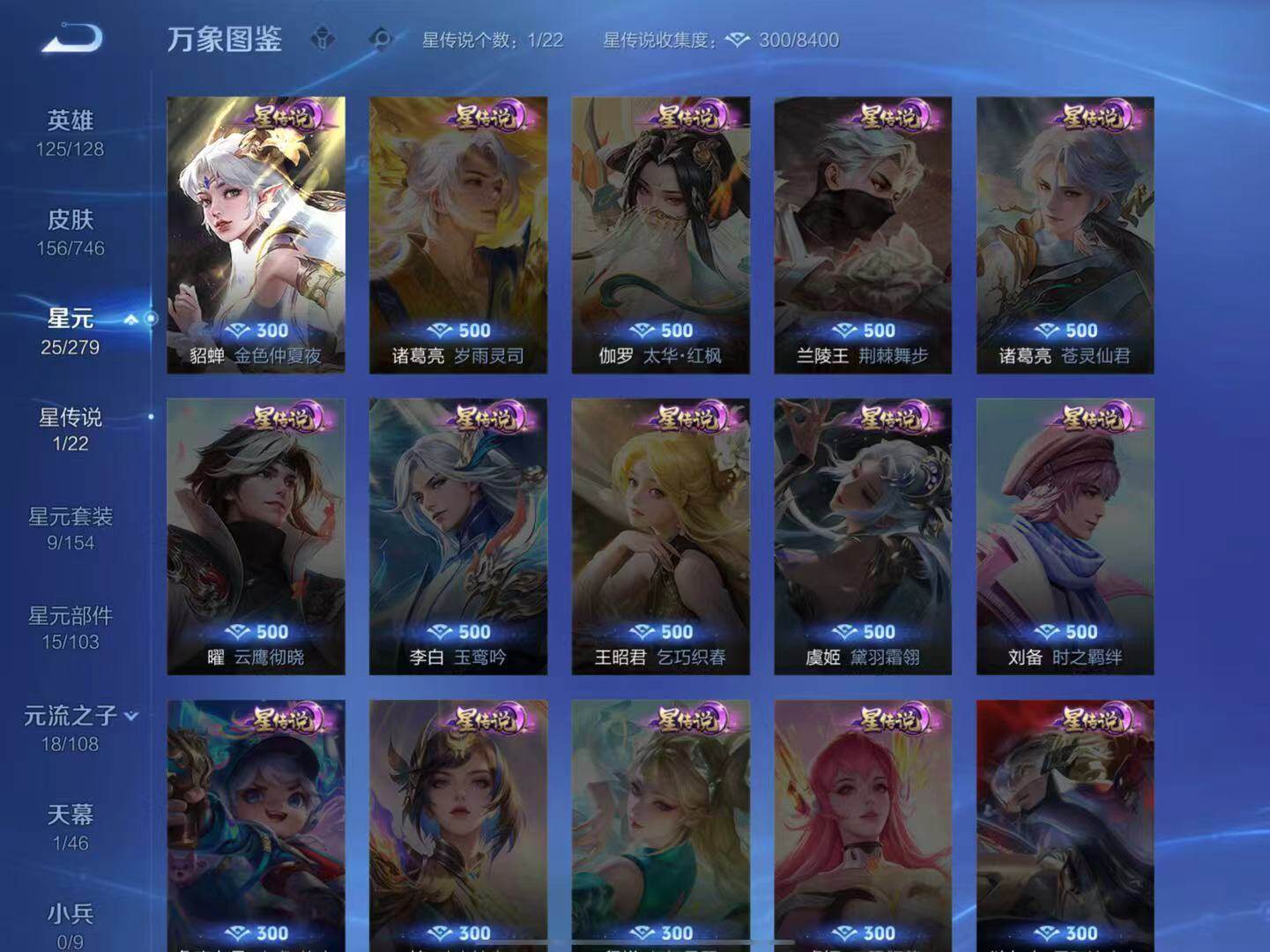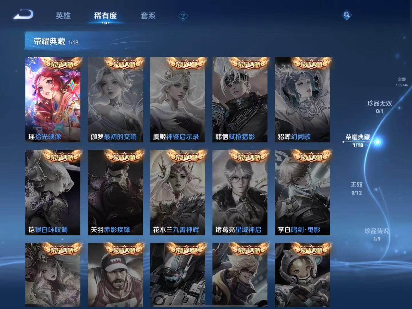 【史诗皮肤】:赵云皇家上将,貂蝉圣诞恋歌,甄姬冰雪圆舞曲,狄仁杰魔术师,廉颇地狱岩魂,宫本武藏鬼剑武藏,孙尚香蔷薇恋人,孙尚香水果甜心,嬴政暗夜贵公子,妲己魅力维加斯,妲己女仆咖啡,墨子金属风暴,夏侯惇乘风破浪,小乔缤纷独角兽,兰陵王暗隐猎兽者,雅典娜冰冠公主,安琪拉心灵骇客,蔡文姬舞动绿茵,刘禅天才门将,李元芳逐浪之夏,白起星夜王子,伽罗箭羽风息,狄仁杰鹰眼统帅,瑶遇见神鹿,西施诗语江南,干将莫邪真爱魔法,安琪拉时之奇旅,庄周高山流水,嫦娥拒霜思,明世隐吟游魔法,鬼谷子五谷丰年,元歌无心,瑶山海碧波行,阿古朵江河有灵,少司缘涂山红红,狂铁龙之律动,后羿石田雨龙,周瑜百相守梦,黄忠百相守梦,朵莉亚幻珠鲛人,西施织梦人,公孙离涂山容容,少司缘巫礼祀神