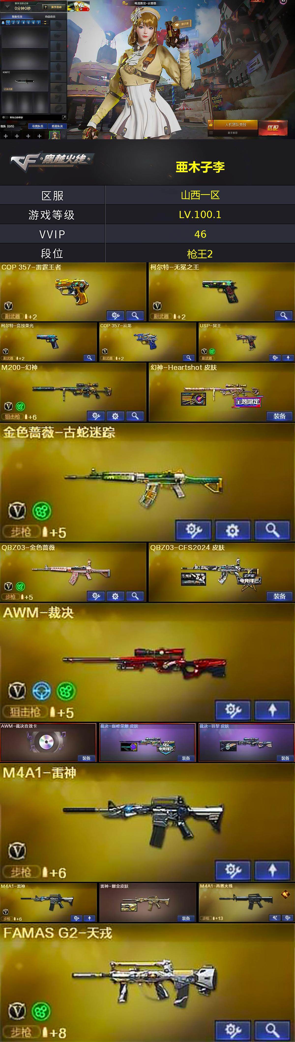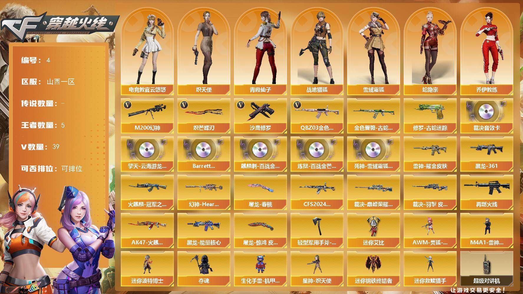 [14282137]山西一区-39V-5王者-0炫金 【热门武器】:QBZ03-金色蔷薇,M200-幻神,金色蔷薇-古蛇迷踪,修罗-古蛇迷踪,沙鹰-修罗,炽芒蝶刃 【音效卡】:擎天-云海游龙音效卡,AWM-裁决音效卡,Barrett-碧霄极光音效卡,麒麟刺-百战金芒-盛典舞曲音效卡,炼狱-百战金芒-庆典舞曲音效卡,死神-雪域霜狐-怀旧音效卡 【皮肤】:幻神-Heartshot 皮肤,QBZ03-CFS2024 皮肤,裁决-巅峰荣耀 皮肤,裁决-羽掣 皮肤,雷神-耀金皮肤,M4A1-再燃火线,火麒麟-冠军之心,AK47-火麒麟-百城23冠军皮肤,黑龙-能量核心,M4A1-黑龙-361,屠龙-春桃 皮肤,屠龙-惊鸿 皮肤,轻型军用手斧-再燃火线 【角色】:电竞教官-云悠悠,战地猎狐,雪域霜狐,蛇隐宗,奇洋探员,乔伊教练,云海玲珑,炽天使,暗夜-X,电竞少女,飞虎队-X,兰-新年限定,猎狐者-追月,0号玩家,灵狐者-X,麻雀,萌儿,潘多拉-X,青霞仙子,蛇姬,夜玫瑰-宠粉,游珑儿 【人偶武器】:星神-炽天使,M4A1-雷神-精英刀锋,迷你钢铁终结者,迷你救赎猎手,AWM-灵狐-15周年嘉年华*2,迷你波特博士,夺魂,生化手雷-机甲核心*2,迷你艾比 【暴走生化】:超级对讲机 【挑战大师】:激光毁灭者III-白马银枪 【英雄级武器】:AK47-火麒麟,M4A1-雷神*2,黑武士-锦绣游龙,超新星-热带奇洋,金色蔷薇-古蛇迷踪,FAMAS G2-天戎,死神-雪域霜狐,QBZ03-金色蔷薇,M4A1-猎神,黑骑士-海王,Barrett-极光,AWM-裁决,M200-幻神,炼狱-百战金芒,悦蓝-惊涛骇浪-觉醒版,沙鹰-修罗,沙鹰-天神,COP 357-雷霆王者-觉醒版,柯尔特-无冕之王,柯尔特-竞技荣光,COP 357-云龙,USP-冥王,修罗-古蛇迷踪,屠龙,炽芒蝶刃,擎天-云海游龙,龙啸-热带奇洋,麒麟刺-百战金芒,高爆手雷-竞技荣光,手雷-云海游龙,手雷-热带奇洋,高爆手雷-古蛇迷踪,闪光弹-竞技荣光*2,闪光弹-雷霆王者-觉醒版,烟雾弹-竞技荣光*2,烟雾弹-云龙,烟雾弹-古蛇迷踪,M4A1-赤狱骑士,M4A1-苍鸣雷神,Barrett-碧霄极光 【道具】:CFS限定背包,云山科技背包,古蛇迷踪炫彩背包,奇洋探员-海龟背包,热带奇洋炫彩背包,百战金芒炫彩背包,超级背包,迷你冰龙背包,雪域霜
