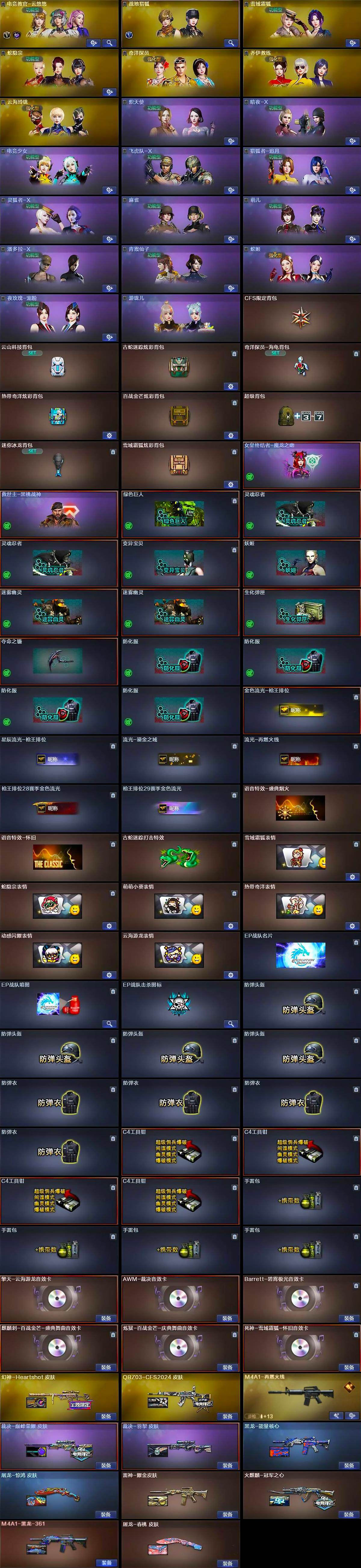 【皮肤】:幻神-Heartshot 皮肤,QBZ03-CFS2024 皮肤,裁决-巅峰荣耀 皮肤,裁决-羽掣 皮肤,雷神-耀金皮肤,M4A1-再燃火线,火麒麟-冠军之心,AK47-火麒麟-百城23冠军皮肤,黑龙-能量核心,M4A1-黑龙-361,屠龙-春桃 皮肤,屠龙-惊鸿 皮肤,轻型军用手斧-再燃火线