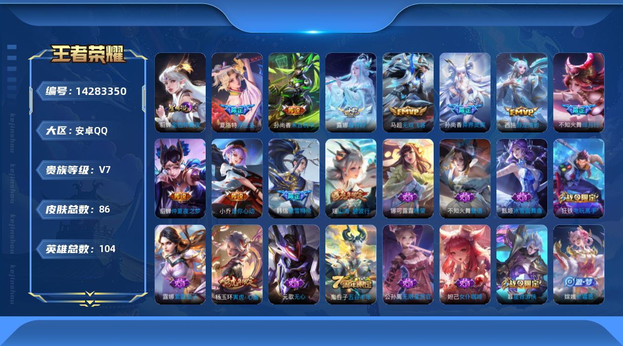 - [15143321]可二次,,安卓Q-V8-最强王者段位-126英雄-313皮肤-3典藏-2星传-10传说-87史诗 【英雄全皮】:钟馗全皮,狂铁全皮 【荣耀典藏】:孙悟空全息碎影,程咬金活力突击,诸葛亮星域神启 【传说皮肤】:后羿神树通天,吕布怒海麟威,马超无双飞将,公孙离祈雪灵祝,铠绛天战甲,虞姬启明星使,梦奇胖达荣荣,后羿黄金射手座,李白凤求凰,孙悟空地狱火 【限定皮肤】:姜子牙天穹之誓,狄仁杰阴阳师,赵云皇家上将,墨子神迹守卫,妲己时之奇旅,嬴政优雅恋人,孙尚香蔷薇恋人,庄周高山流水,芈月重明,元歌云间偶戏,夏侯惇朔风刀,甄姬游园惊梦,典韦穷奇,马可波罗暗影游猎,狄仁杰魔术师,狄仁杰万华元夜,项羽海滩派对,老夫子醍醐杖,老夫子航海奇遇记,韩信逐梦之影,韩信飞衡,王昭君午后时光,兰陵王金庭之子,亚瑟潮玩骑士王,孙悟空至尊宝,孙悟空大圣娶亲,孙悟空孙行者,牛魔御旌,后羿圣弓游侠,李元芳银河之约,李元芳云中旅人,虞姬启明星使,钟馗神迹守卫,钟馗驱傩正仪,干将莫邪真爱魔法,雅典娜黎明之约,蔡文姬繁星吟游,鬼谷子原初探秘者,苏烈千军破阵,弈星混沌棋,公孙离祈雪灵祝,沈梦溪星空之诺,沈梦溪大漠名商,明世隐疑决卦,裴擒虎李小龙,狂铁御狮,狂铁电玩高手,米莱狄御霄,云中君纤云弄巧,盾山御銮,猪八戒西部大镖客,上官婉儿梁祝,嫦娥拒霜思,西施玲珑珍味,鲁班大师探海日志,桑启海盐诗旅,艾琳流音漫舞,司空震地狱燃心,阿古朵江河有灵,张良古海寻踪,蒙犽百解令,高渐离燃音魔法,妲己灵卜魔法,鬼谷子天穹祈灯,沈梦溪龙舞盛年,鲁班七号蔬乡物语,李元芳蔬乡物语,刘邦剑破天穹,程咬金群星魔术团,镜青焰无极,项羽苍威无极 【年限皮肤】:李白凤求凰,公孙离祈雪灵祝,韩信飞衡 【赛季限定】:芈月重明,夏侯惇朔风刀,典韦穷奇,狄仁杰万华元夜,老夫子醍醐杖,兰陵王金庭之子,张良古海寻踪,牛魔御旌,李元芳云中旅人,钟馗驱傩正仪,雅典娜黎明之约,鬼谷子原初探秘者,苏烈千军破阵,弈星混沌棋,沈梦溪大漠名商,明世隐疑决卦,狂铁御狮,米莱狄御霄,盾山御銮,鲁班大师探海日志,桑启海盐诗旅,鬼谷子天穹祈灯,刘邦剑破天穹,姜子牙天穹之誓 【战令限定】:墨子神迹守卫,元歌云间偶戏,马可波罗暗影游猎,老夫子航海奇遇记,王昭君午后时光,艾琳流音漫舞,亚瑟潮玩骑士王,后羿圣弓游侠,李元芳银河之约,钟馗神迹守卫,干将莫邪真爱魔法,沈梦溪星空之诺,