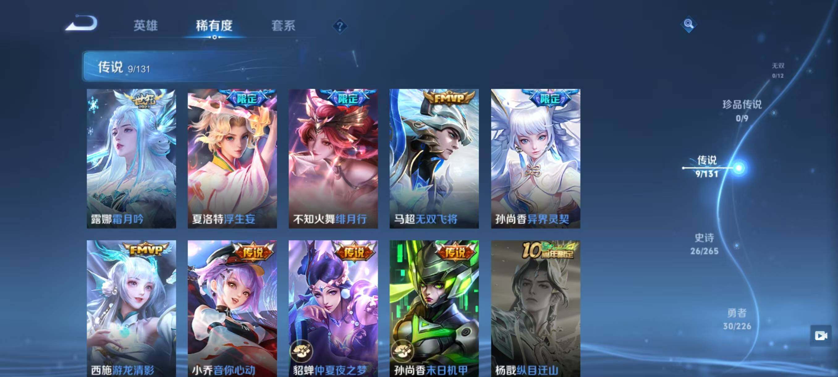 【传说皮肤】:露娜霜月吟,夏洛特浮生妄,不知火舞绯月行,马超无双飞将,孙尚香异界灵契,西施游龙清影,小乔音你心动,貂蝉仲夏夜之梦,孙尚香末日机甲