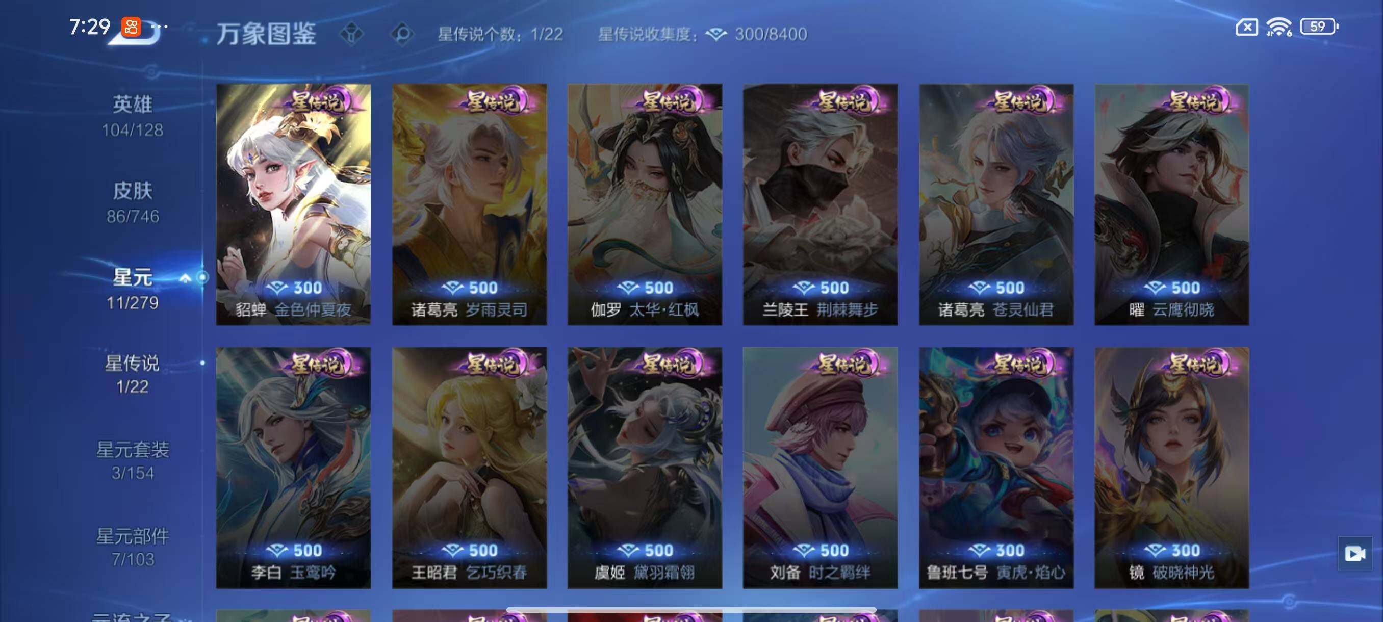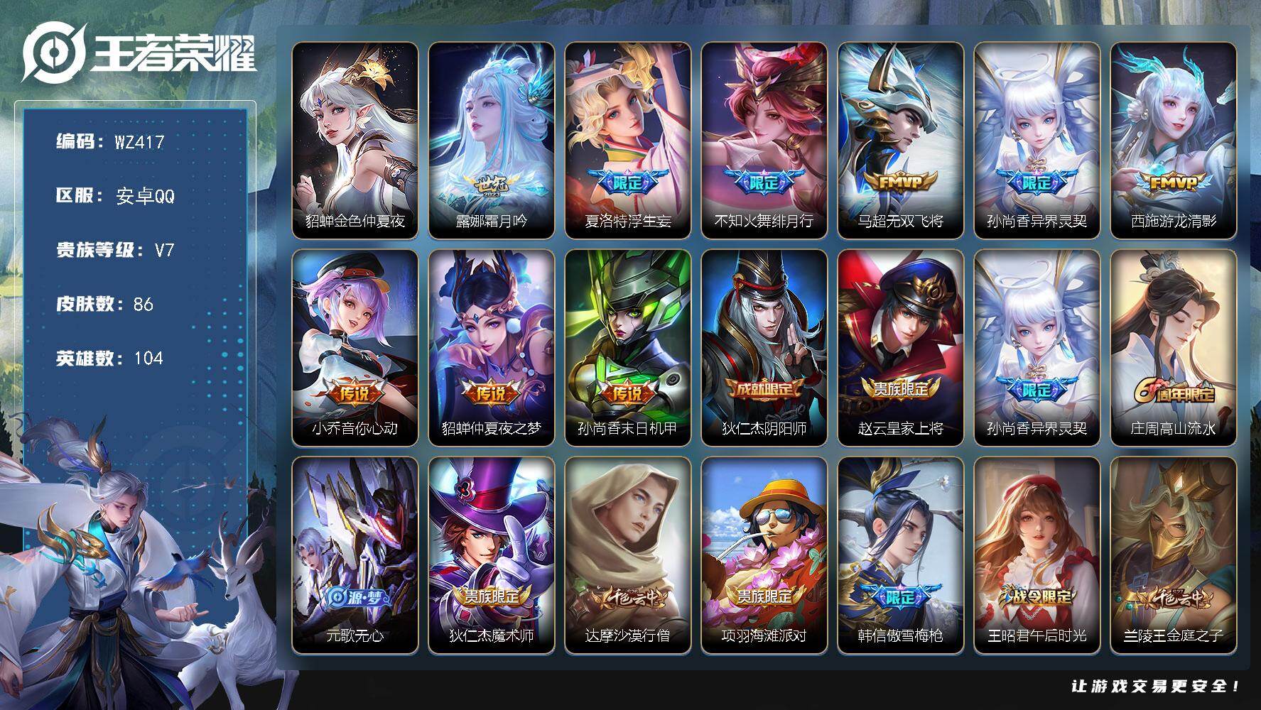 - [12387498]【商品标题】:安卓Q-V7-至尊星耀V段位-122英雄-181皮肤-1典藏-0珍品无双-0无双-0珍品传说-3传说-41史诗 【荣耀典藏】:孙悟空全息碎影 【内测皮肤】:干将莫邪胡桃夹子 【传说皮肤】:孙悟空地狱火,李白凤求凰,桑启鸣野蒿 【限定皮肤】:白起狰,狄仁杰阴阳师,虞姬凯尔特女王,赵云皇家上将,墨子神迹守卫,鲁班七号狮舞东方,芈月重明,吕布猎兽之王,周瑜赤莲之焰,元歌云间偶戏,夏侯惇朔风刀,曹操烛龙,曹操天狼征服者,典韦穷奇,马可波罗暗影游猎,狄仁杰魔术师,狄仁杰万华元夜,达摩沙漠行僧,项羽海滩派对,老夫子醍醐杖,老夫子航海奇遇记,程咬金演武夺筹,韩信逐梦之影,韩信飞衡,兰陵王驯魔猎人,亚瑟潮玩骑士王,孙悟空大圣娶亲,牛魔御旌,后羿如梦令,李元芳银河之约,钟馗神迹守卫,钟馗驱傩正仪,干将莫邪胡桃夹子,蔡文姬繁星吟游,太乙真人饕餮,鬼谷子原初探秘者,苏烈千军破阵,弈星混沌棋,沈梦溪星空之诺,明世隐疑决卦,裴擒虎李小龙,米莱狄御霄,云中君纤云弄巧,盾山御銮,猪八戒西部大镖客,上官婉儿梁祝 【年限皮肤】:李白凤求凰,韩信飞衡,马超神威 【赛季限定】:白起狰,芈月重明,夏侯惇朔风刀,曹操烛龙,典韦穷奇,狄仁杰万华元夜,达摩沙漠行僧,老夫子醍醐杖,程咬金演武夺筹,牛魔御旌,虞姬凯尔特女王,钟馗驱傩正仪,太乙真人饕餮,鬼谷子原初探秘者,苏烈千军破阵,弈星混沌棋,明世隐疑决卦,米莱狄御霄,盾山御銮 【战令限定】:墨子神迹守卫,鲁班七号狮舞东方,吕布猎兽之王,周瑜赤莲之焰,元歌云间偶戏,马可波罗暗影游猎,老夫子航海奇遇记,兰陵王驯魔猎人,亚瑟潮玩骑士王,李元芳银河之约,钟馗神迹守卫,沈梦溪星空之诺,猪八戒西部大镖客 【史诗皮肤】:露娜紫霞仙子,赵云皇家上将,赵云未来纪元,王昭君偶像歌手,狄仁杰魔术师,宫本武藏鬼剑武藏,孙尚香水果甜心,嬴政暗夜贵公子,妲己魅力维加斯,墨子金属风暴,吕布圣诞狂欢,李白千年之狐,韩信白龙吟,刘邦德古拉伯爵,韩信逐梦之影,诸葛亮黄金分割率,雅典娜冰冠公主,百里守约特工魅影,铠曙光守护者,白起星夜王子,阿轲节奏热浪,孙策猫狗日记,孙悟空大圣娶亲,伽罗箭羽风息,鲁班七号狮舞东方,狄仁杰鹰眼统帅,公孙离无限星赏官,兰陵王驯魔猎人,上官婉儿梁祝,曹操天狼征服者,蔡文姬繁星吟游,李元芳银河之约,韩信飞衡,后羿如梦令,马超神威,马可波罗暗影游猎,裴擒虎李小