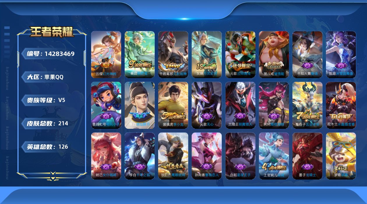 [14283469]苹果Q-214皮肤-4传说-44史诗 【英雄全皮】:影全皮 【传说皮肤】:后羿神树通天,云缨幻光神枪,桑启鸣野蒿,干将莫邪久胜战神 【限定皮肤】:白起狰,姜子牙天穹之誓,李白谪仙醉月,狄仁杰阴阳师,赵云皇家上将,嬴政白昼王子,孙尚香蔷薇恋人,庄周高山流水,高渐离死亡摇滚,芈月重明,吕布猎兽之王,周瑜赤莲之焰,元歌云间偶戏,元歌无心,夏侯惇朔风刀,甄姬游园惊梦,曹操烛龙,典韦穷奇,狄仁杰万华元夜,达摩沙漠行僧,项羽海滩派对,老夫子醍醐杖,程咬金演武夺筹,兰陵王驯魔猎人,兰陵王金庭之子,亚瑟潮玩骑士王,李元芳云中旅人,钟馗驱傩正仪,杨玉环遇见飞天,雅典娜黎明之约,太乙真人饕餮,鬼谷子原初探秘者,鬼谷子五谷丰年,苏烈千军破阵,百里玄策原初追逐者,弈星混沌棋,梦奇顽趣,沈梦溪大漠名商,明世隐疑决卦,裴擒虎李小龙,裴擒虎擒涛扼浪,狂铁御狮,米莱狄御霄,盾山御銮,猪八戒猪悟能,上官婉儿梁祝,桑启海盐诗旅,艾琳女武神,张良古海寻踪,蒙恬荣光圣徽,鬼谷子天穹祈灯,沈梦溪龙舞盛年,刘邦剑破天穹,周瑜熔金海岸 【赛季限定】:白起狰,芈月重明,夏侯惇朔风刀,曹操烛龙,典韦穷奇,狄仁杰万华元夜,达摩沙漠行僧,老夫子醍醐杖,程咬金演武夺筹,兰陵王金庭之子,张良古海寻踪,李元芳云中旅人,钟馗驱傩正仪,雅典娜黎明之约,太乙真人饕餮,鬼谷子原初探秘者,苏烈千军破阵,百里玄策原初追逐者,弈星混沌棋,梦奇顽趣,沈梦溪大漠名商,明世隐疑决卦,裴擒虎擒涛扼浪,狂铁御狮,米莱狄御霄,盾山御銮,桑启海盐诗旅,鬼谷子天穹祈灯,蒙恬荣光圣徽,刘邦剑破天穹,姜子牙天穹之誓 【战令限定】:嬴政白昼王子,吕布猎兽之王,周瑜赤莲之焰,元歌云间偶戏,兰陵王驯魔猎人,亚瑟潮玩骑士王 【史诗皮肤】:鲁班七号电玩小子,项羽苍穹之光,阿轲暗夜猫娘,赵云皇家上将,赵云未来纪元,貂蝉圣诞恋歌,甄姬冰雪圆舞曲,宫本武藏鬼剑武藏,孙尚香蔷薇恋人,孙尚香水果甜心,嬴政摇滚巨星,妲己魅力维加斯,妲己女仆咖啡,墨子龙骑士,李白千年之狐,花木兰水晶猎龙者,小乔缤纷独角兽,兰陵王暗隐猎兽者,甄姬游园惊梦,百里守约特工魅影,蔡文姬舞动绿茵,李元芳逐浪之夏,白起星夜王子,杨玉环遇见飞天,嬴政白昼王子,孙策猫狗日记,大乔猫狗日记,狄仁杰鹰眼统帅,兰陵王驯魔猎人,上官婉儿梁祝,不知火舞魅语,百里玄策原初追逐者,裴擒虎李小龙,元歌云间偶戏,猪八戒猪悟能,庄