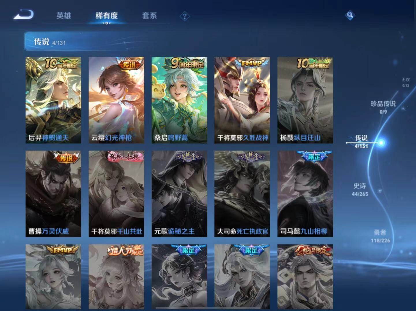 【传说皮肤】:后羿神树通天,云缨幻光神枪,桑启鸣野蒿,干将莫邪久胜战神