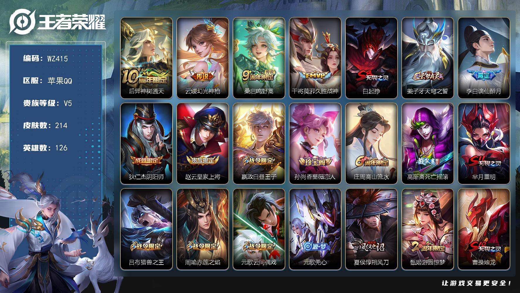 - [14340845]可二次【店主推荐捡漏号!可直接换绑】苹果Q-V9-最强王者段位-127英雄-398皮肤-3典藏皮肤-2无双-32传说-122史诗-3星元 【英雄全皮】:孙权全皮,钟馗全皮,雅典娜全皮,鬼谷子全皮,蒙恬全皮,金蝉全皮,空空儿全皮,影全皮 【荣耀典藏】:孙悟空全息碎影,李白鸣剑曳影,韩信弑枪猎影 【无双皮肤】:李白碎月剑心,铠神罪 【传说皮肤】:后羿神树通天,曹操万灵伏威,虞姬愿照岁时盈,云缨幻光神枪,裴擒虎祥瑞亨通,夏侯惇霜北刀,典韦战鼓燎原,澜逐花归海,露娜霜月吟,李白诗剑行,马超无双飞将,王昭君乞巧织情,周瑜音你心动,兰陵王默契交锋,镜炽阳神光,虞姬启明星使,曜云鹰飞将,李信一念神魔,伽罗太华,干将莫邪久胜战神,达摩黄金狮子座,百里玄策白虎志,花木兰冠军飞将,梦奇胖达荣荣,后羿黄金射手座,貂蝉仲夏夜之梦,李白凤求凰,孙尚香末日机甲,宫本武藏地狱之眼,孙悟空地狱火,吕布天魔缭乱,狄仁杰超时空战士 【限定皮肤】:夏侯惇霜北刀,蒙犽顽岩魄,蔡文姬夏日便利店,虞姬夏日便利店,姜子牙天穹之誓,狄仁杰阴阳师,赵云皇家上将,赵云引擎之心,赵云龙胆,墨子神迹守卫,妲己热情桑巴,嬴政白昼王子,鲁班七号狮舞东方,庄周云端筑梦师,高渐离死亡摇滚,高渐离玩趣恶龙,阿轲迷踪丽影,钟无艳超时空战士,芈月重明,吕布天魔缭乱,吕布猎兽之王,周瑜赤莲之焰,元歌无心,夏侯惇朔风刀,甄姬游园惊梦,甄姬落雪兰心,典韦穷奇,典韦蓝屏警告,马可波罗暗影游猎,马可波罗山海玄木吟,狄仁杰魔术师,狄仁杰万华元夜,达摩星际陆战队,项羽海滩派对,老夫子圣诞老人,老夫子醍醐杖,老夫子航海奇遇记,关羽冰锋战神,貂蝉逐梦之音,程咬金演武夺筹,刘邦夺宝奇兵,韩信逐梦之影,韩信飞衡,兰陵王默契交锋,兰陵王驯魔猎人,兰陵王金庭之子,花木兰青春决赛季,花木兰瑞麟志,花木兰默契交锋,孙悟空美猴王,孙悟空至尊宝,孙悟空大圣娶亲,孙悟空孙行者,牛魔御旌,李元芳云中旅人,虞姬启明星使,钟馗神迹守卫,钟馗驱傩正仪,杨玉环遇见飞天,女娲朔望之晖,雅典娜单词大作战,雅典娜黎明之约,蔡文姬繁星吟游,太乙真人华丽摇滚,东皇太一逐梦之光,鬼谷子原初探秘者,鬼谷子五谷丰年,黄忠烈魂,苏烈千军破阵,百里玄策白虎志,百里玄策原初追逐者,弈星混沌棋,梦奇顽趣,公孙离蜜橘之夏,沈梦溪大漠名商,明世隐疑决卦,裴擒虎李小龙,裴擒虎擒涛扼浪,狂铁御狮,米莱狄御霄,