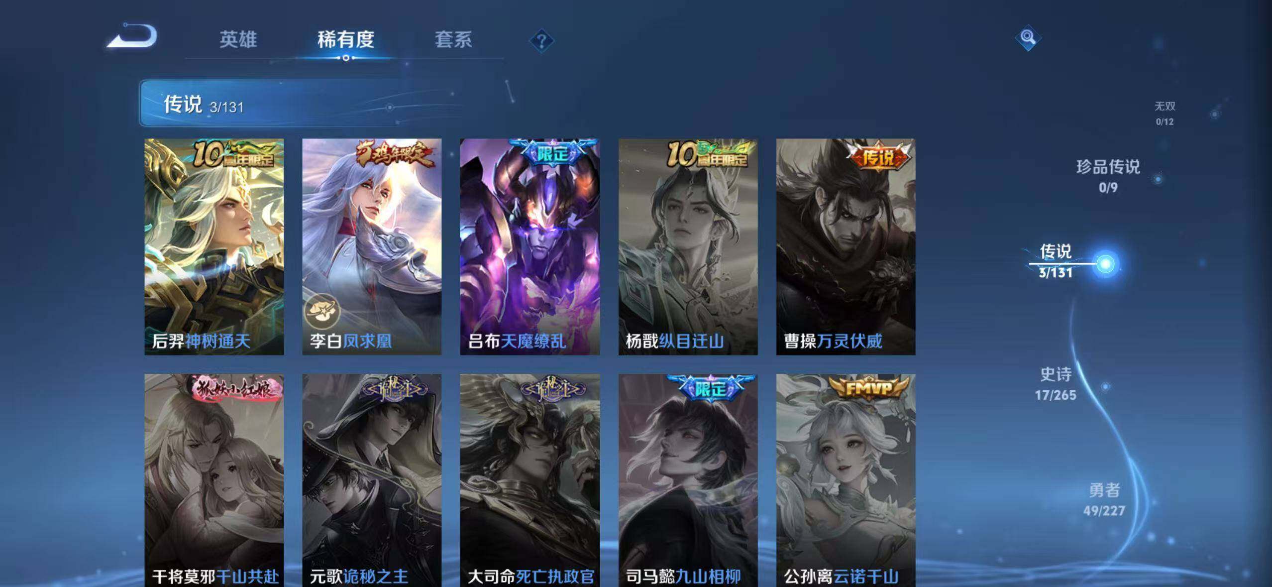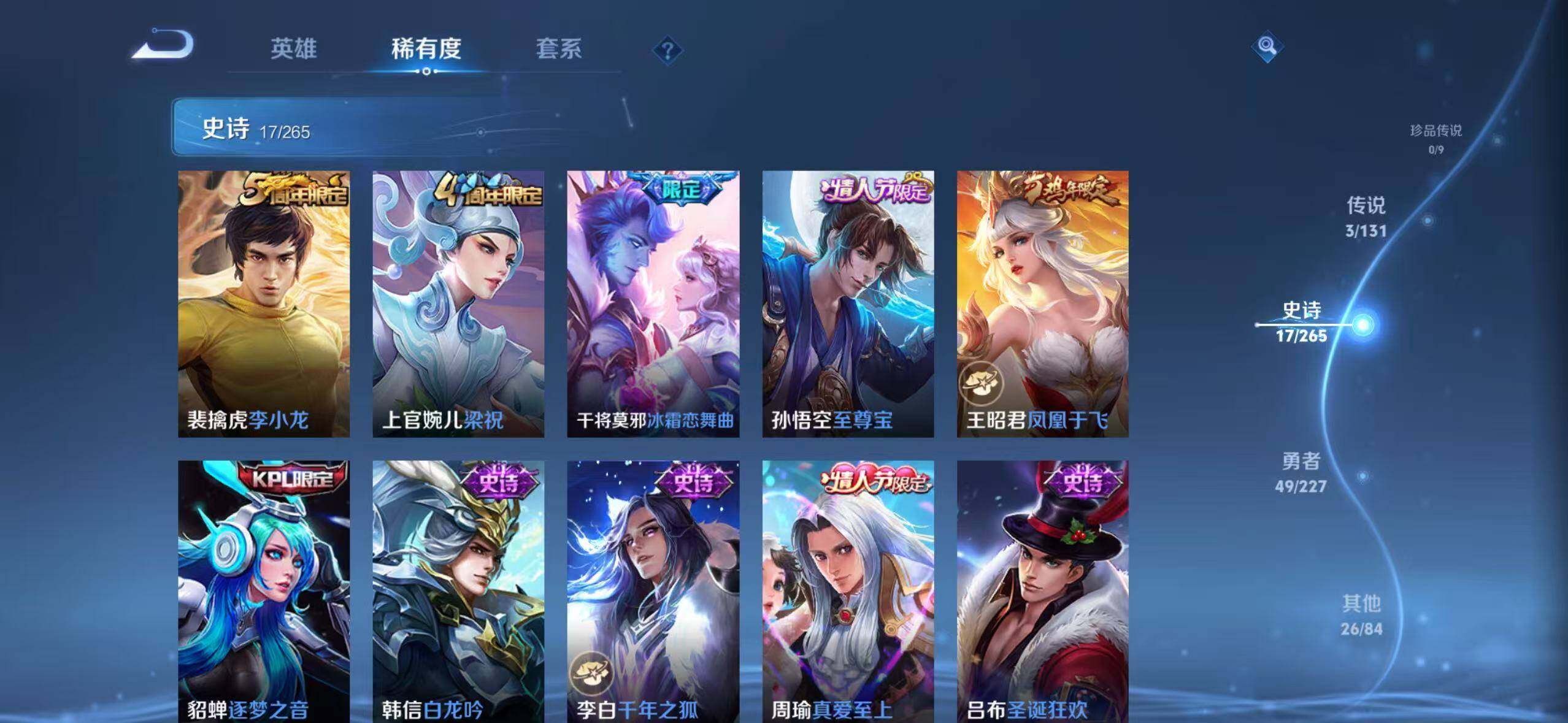 【史诗皮肤】:阿轲暗夜猫娘,赵云嘻哈天王,赵云皇家上将,老夫子圣诞老人,狄仁杰魔术师,宫本武藏鬼剑武藏,妲己魅力维加斯,吕布圣诞狂欢,周瑜真爱至上,李白千年之狐,韩信白龙吟,貂蝉逐梦之音,王昭君凤凰于飞,孙悟空至尊宝,干将莫邪冰霜恋舞曲,狄仁杰鹰眼统帅,上官婉儿梁祝,裴擒虎李小龙