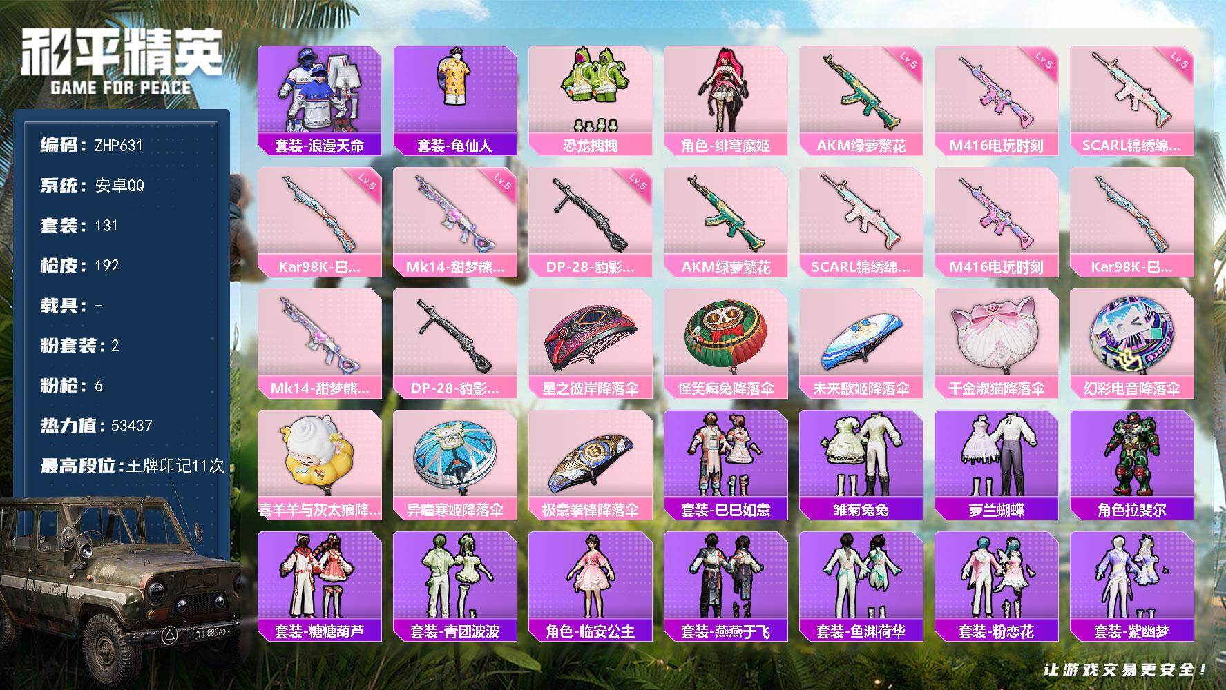[14284689]【店主推荐捡漏号!可直接换绑】/地铁满天赋 安卓 手Q-2粉装-6特效枪-1粉色飞行器-5.3w热力值-11王牌印记-131套装-192枪皮【热门品类】:套装-浪漫天命,套装-龟仙人【粉色套装】:粉装-恐龙拽拽,角色-绯穹魔姬【粉色枪皮等级】:AKM-绿萝繁花(五级),SCAR-L-锦绣绵绵(五级),M416-电玩时刻(五级),Kar98K-巳巳如意(五级),Mk14-甜梦熊击(五级),DP-28-豹影疾电(五级)