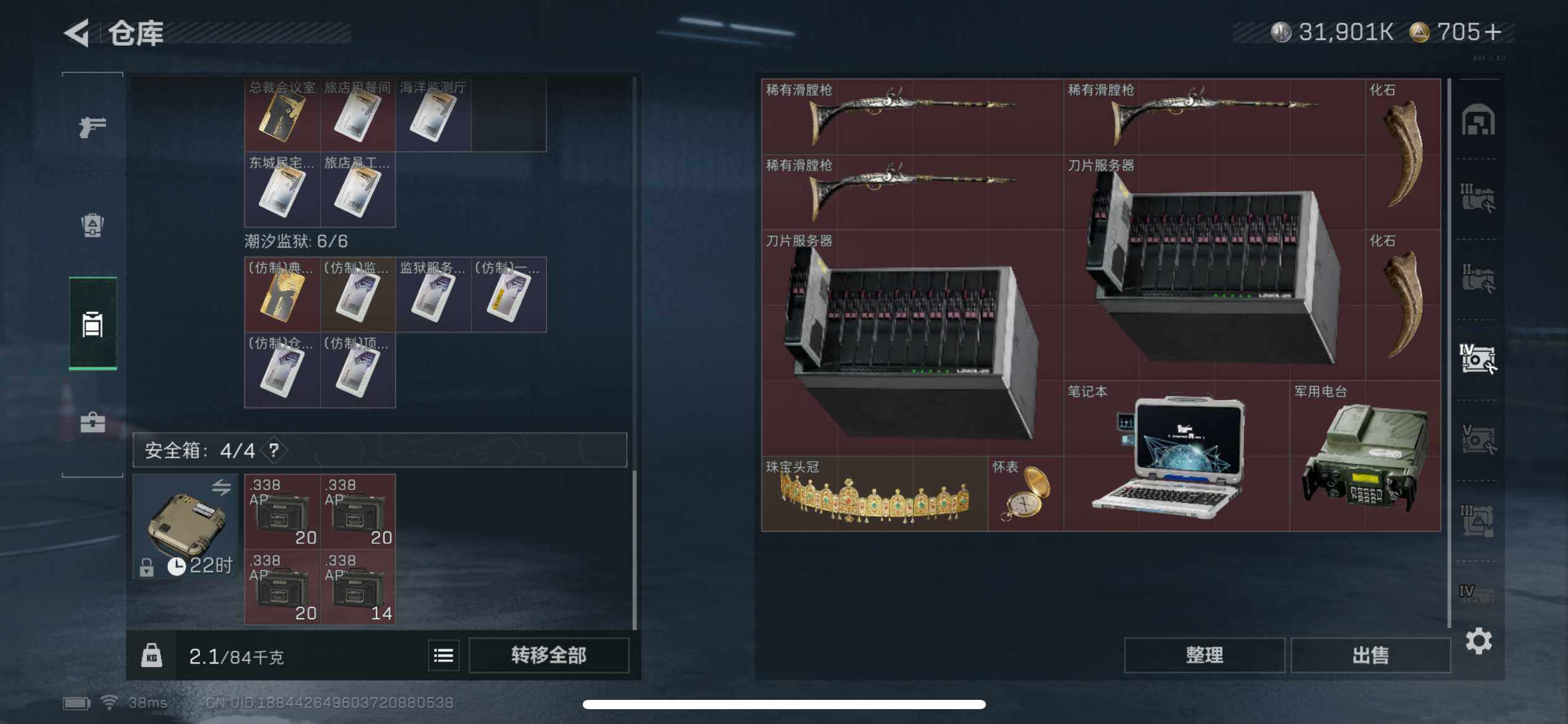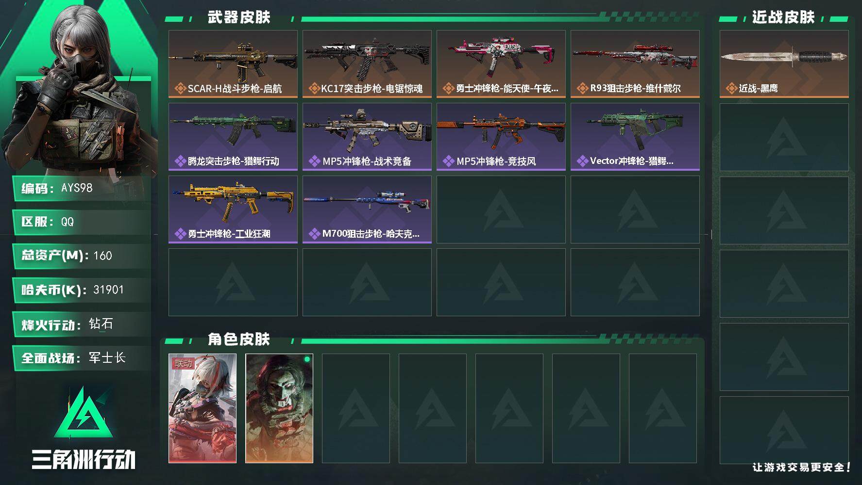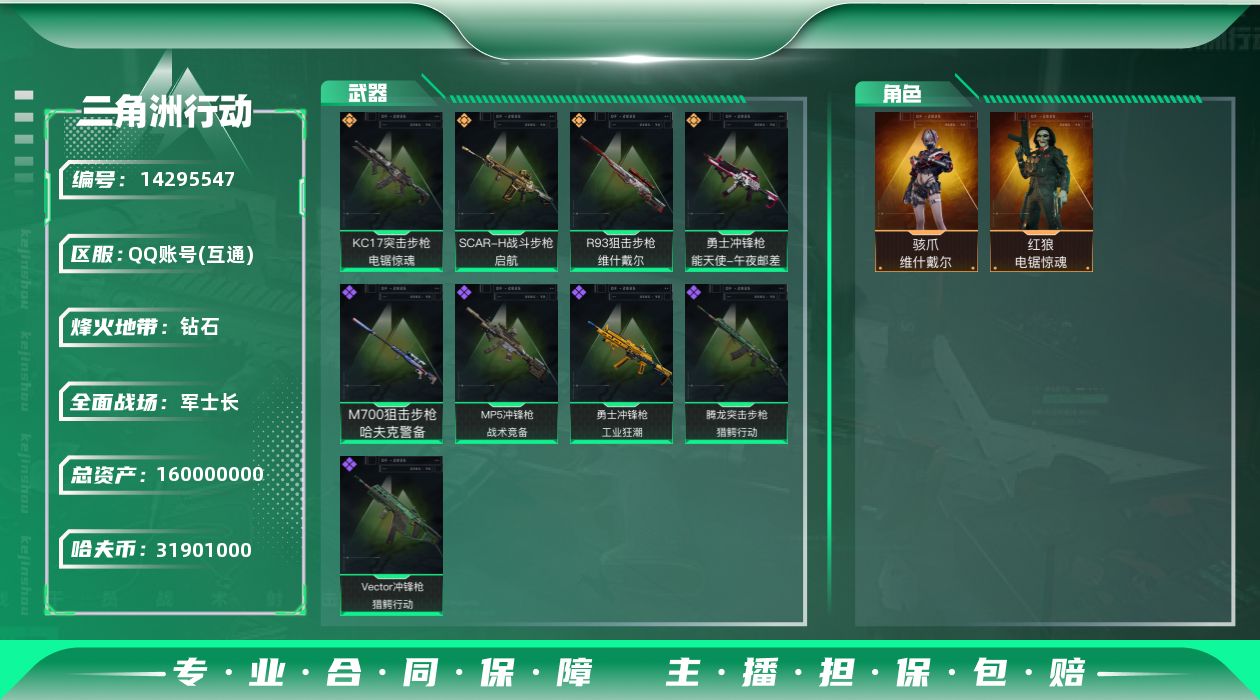 [14295547]31901k哈伏币-144m流动资产-60烽火等级-钻石-15战场等级-军士长 【干员外观】:骇爪-维什戴尔,红狼-电锯惊魂 【近战皮肤】:近战-黑鹰 【传说外观】:SCAR-H战斗步枪-启航,KC17突击步枪-电锯惊魂,勇士冲锋枪-能天使-午夜邮差,R93狙击步枪-维什戴尔 【史诗外观】:腾龙突击步枪-猎鳄行动,MP5冲锋枪-战术竞备,MP5冲锋枪-竞技风,Vector冲锋枪-猎鳄行动,勇士冲锋枪-工业狂潮,M700狙击步枪-哈夫克警备 【稀有外观】:M4A1突击步枪-零点,AKM突击步枪-肃杀,QBZ95-1突击步枪-公平竞技,K416突击步枪-碳纤维,M7战斗步枪-捣蛋鬼,AK-12突击步枪-零点,CAR15突击步枪-亚特兰蒂斯,腾龙突击步枪-冰天雪地,MP5冲锋枪-哈夫克卫队,P90冲锋枪-黄昏,P90冲锋枪-捣蛋鬼,UZI冲锋枪-亚特兰蒂斯,SMG-45-行动开启,SMG-45冲锋枪-幻影结构,勇士冲锋枪-冰天雪地,M1014霰弹枪-幻影结构,QJB201轻机枪-哈夫克卫队,Mini-14射手步枪-荣耀列队,SVD狙击步枪-战术行动,SKS射手步枪-弄臣,SV-98狙击步枪-星链科技,SV-98狙击步枪-哈夫克航天,SV-98狙击步枪-精英联盟,G18-星链科技,G18-哈夫克航天 【普通外观】:M4A1突击步枪-粉色涂装,M4A1突击步枪-海色,QBZ95-1突击步枪-海浪,QBZ95-1突击步枪-三角洲力量,QBZ95-1突击步枪-海色,K416突击步枪-几何迷彩,M16A4突击步枪-高雅黑,AUG突击步枪-浅蓝涂装,SG552突击步枪-三角洲力量,SG552突击步枪-浅蓝涂装,SG552突击步枪-海浪,G3战斗步枪-高雅黑,PTR-32突击步枪-黄蜂,MP5冲锋枪-安全工作,MP5冲锋枪-海色,MP5冲锋枪-黄蜂,Vector冲锋枪-几何迷彩,UZI冲锋枪-海色,野牛冲锋枪-高雅黑,M1014霰弹枪-海浪,M249轻机枪-黄蜂,M250通用机枪-条纹,SVD狙击步枪-高雅黑,SR-25射手步枪-黄蜂,QSZ92G-条纹,沙漠之鹰-高雅黑 【载具外观】:轮式突击炮-荣耀 【军牌】:军牌-静谧时光,军牌-永恒,军牌-来点薯条,军牌-神秘艺术,军牌-幸福国,军牌-信誉优秀 【挂饰】:挂饰-维什戴尔,挂饰-暗行哨兵,挂饰-启程