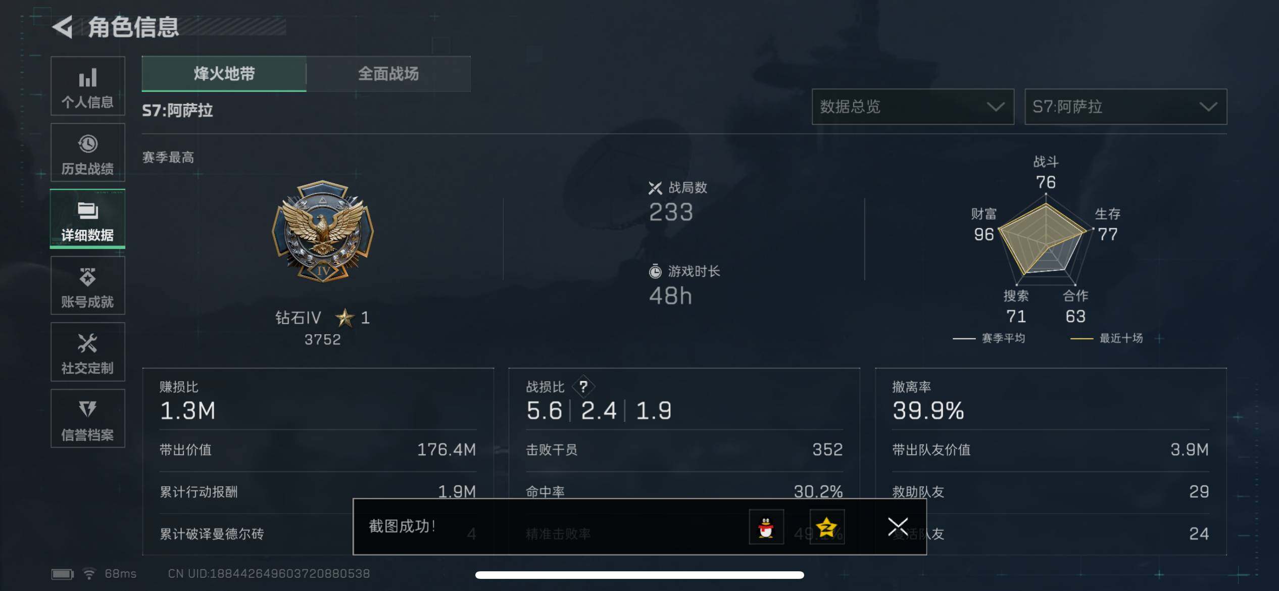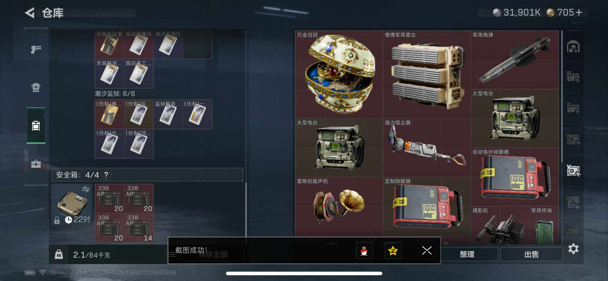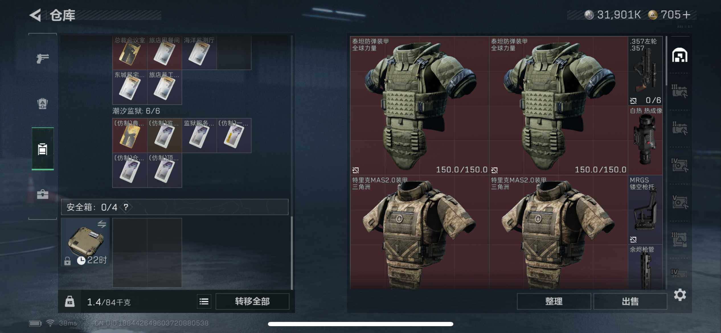[14295547]31901k哈伏币-144m流动资产-60烽火等级-钻石-15战场等级-军士长 【干员外观】:骇爪-维什戴尔,红狼-电锯惊魂 【近战皮肤】:近战-黑鹰 【传说外观】:SCAR-H战斗步枪-启航,KC17突击步枪-电锯惊魂,勇士冲锋枪-能天使-午夜邮差,R93狙击步枪-维什戴尔 【史诗外观】:腾龙突击步枪-猎鳄行动,MP5冲锋枪-战术竞备,MP5冲锋枪-竞技风,Vector冲锋枪-猎鳄行动,勇士冲锋枪-工业狂潮,M700狙击步枪-哈夫克警备 【稀有外观】:M4A1突击步枪-零点,AKM突击步枪-肃杀,QBZ95-1突击步枪-公平竞技,K416突击步枪-碳纤维,M7战斗步枪-捣蛋鬼,AK-12突击步枪-零点,CAR15突击步枪-亚特兰蒂斯,腾龙突击步枪-冰天雪地,MP5冲锋枪-哈夫克卫队,P90冲锋枪-黄昏,P90冲锋枪-捣蛋鬼,UZI冲锋枪-亚特兰蒂斯,SMG-45-行动开启,SMG-45冲锋枪-幻影结构,勇士冲锋枪-冰天雪地,M1014霰弹枪-幻影结构,QJB201轻机枪-哈夫克卫队,Mini-14射手步枪-荣耀列队,SVD狙击步枪-战术行动,SKS射手步枪-弄臣,SV-98狙击步枪-星链科技,SV-98狙击步枪-哈夫克航天,SV-98狙击步枪-精英联盟,G18-星链科技,G18-哈夫克航天 【普通外观】:M4A1突击步枪-粉色涂装,M4A1突击步枪-海色,QBZ95-1突击步枪-海浪,QBZ95-1突击步枪-三角洲力量,QBZ95-1突击步枪-海色,K416突击步枪-几何迷彩,M16A4突击步枪-高雅黑,AUG突击步枪-浅蓝涂装,SG552突击步枪-三角洲力量,SG552突击步枪-浅蓝涂装,SG552突击步枪-海浪,G3战斗步枪-高雅黑,PTR-32突击步枪-黄蜂,MP5冲锋枪-安全工作,MP5冲锋枪-海色,MP5冲锋枪-黄蜂,Vector冲锋枪-几何迷彩,UZI冲锋枪-海色,野牛冲锋枪-高雅黑,M1014霰弹枪-海浪,M249轻机枪-黄蜂,M250通用机枪-条纹,SVD狙击步枪-高雅黑,SR-25射手步枪-黄蜂,QSZ92G-条纹,沙漠之鹰-高雅黑 【载具外观】:轮式突击炮-荣耀 【军牌】:军牌-静谧时光,军牌-永恒,军牌-来点薯条,军牌-神秘艺术,军牌-幸福国,军牌-信誉优秀 【挂饰】:挂饰-维什戴尔,挂饰-暗行哨兵,挂饰-启程
